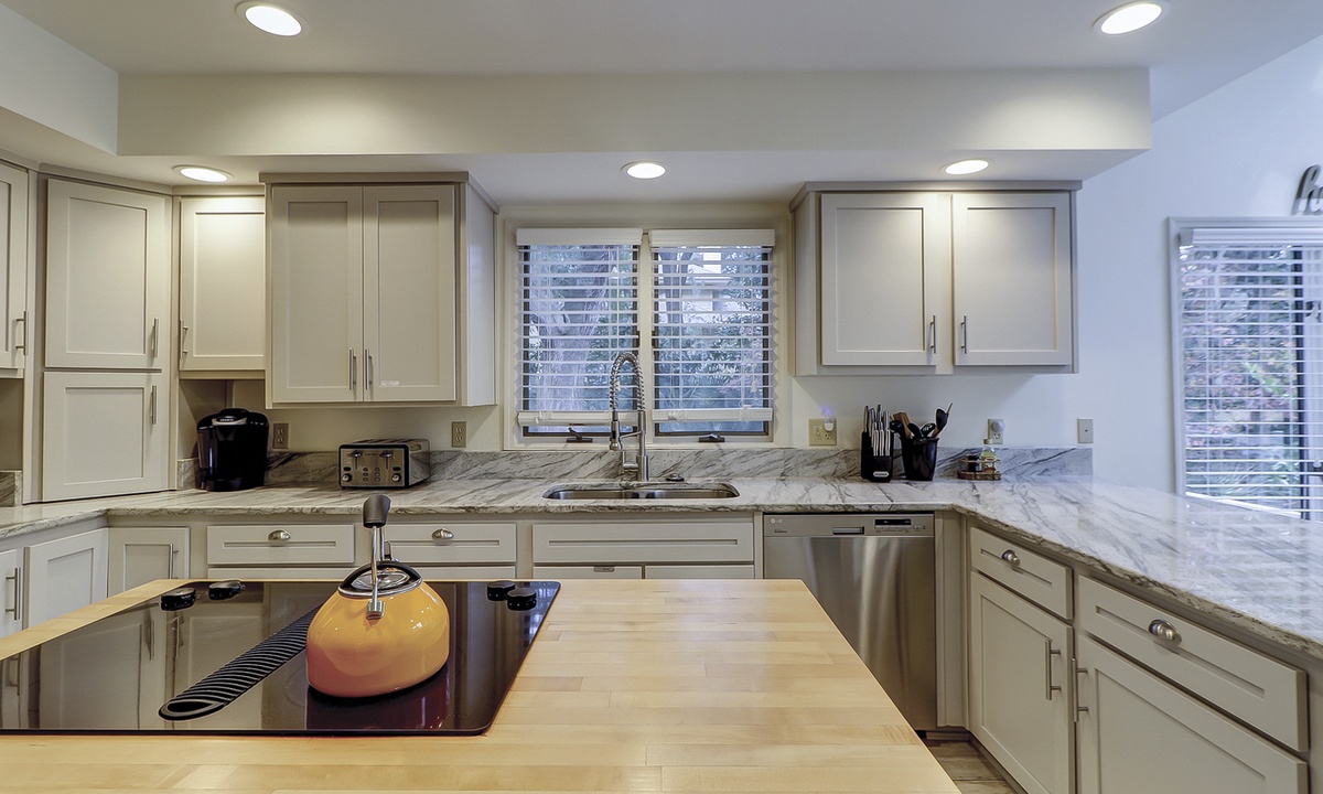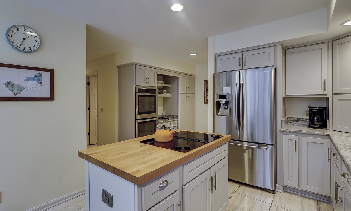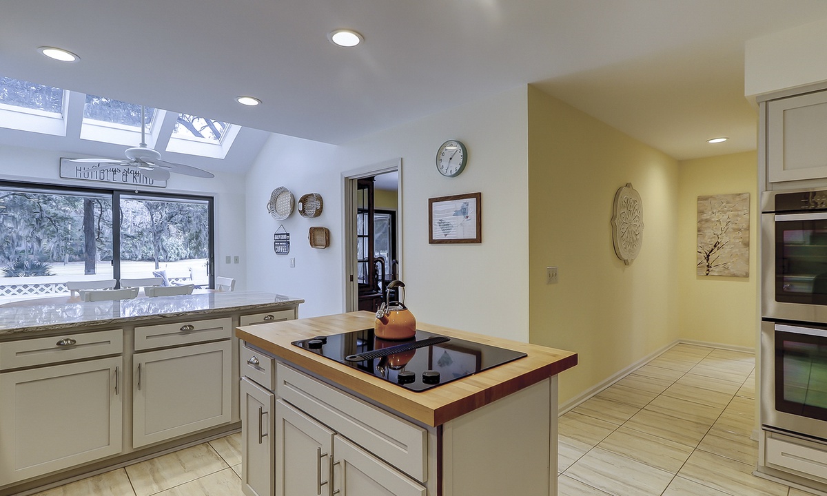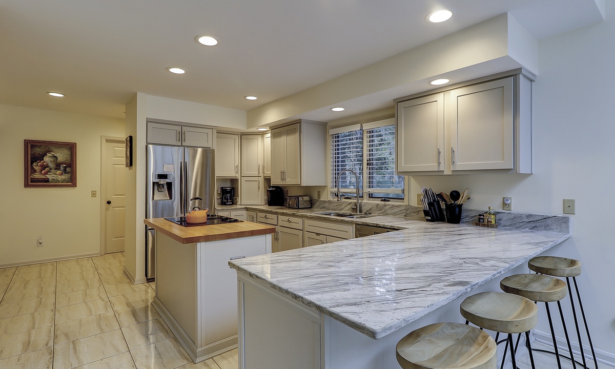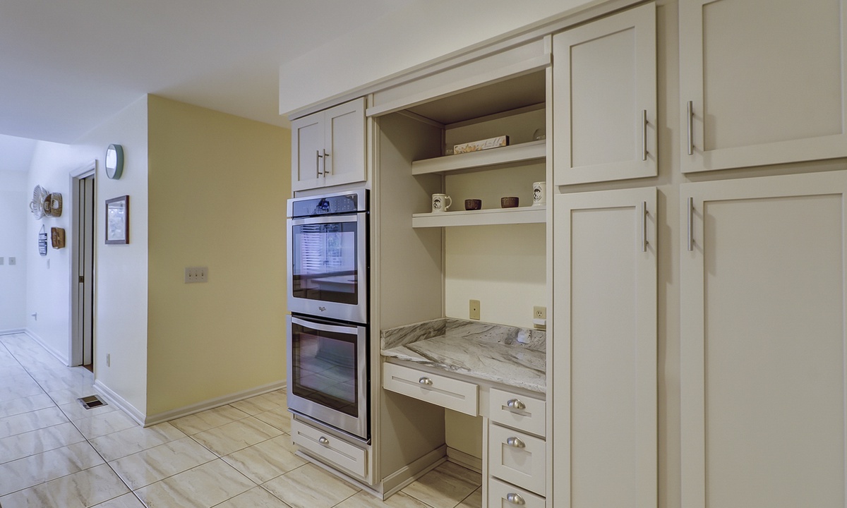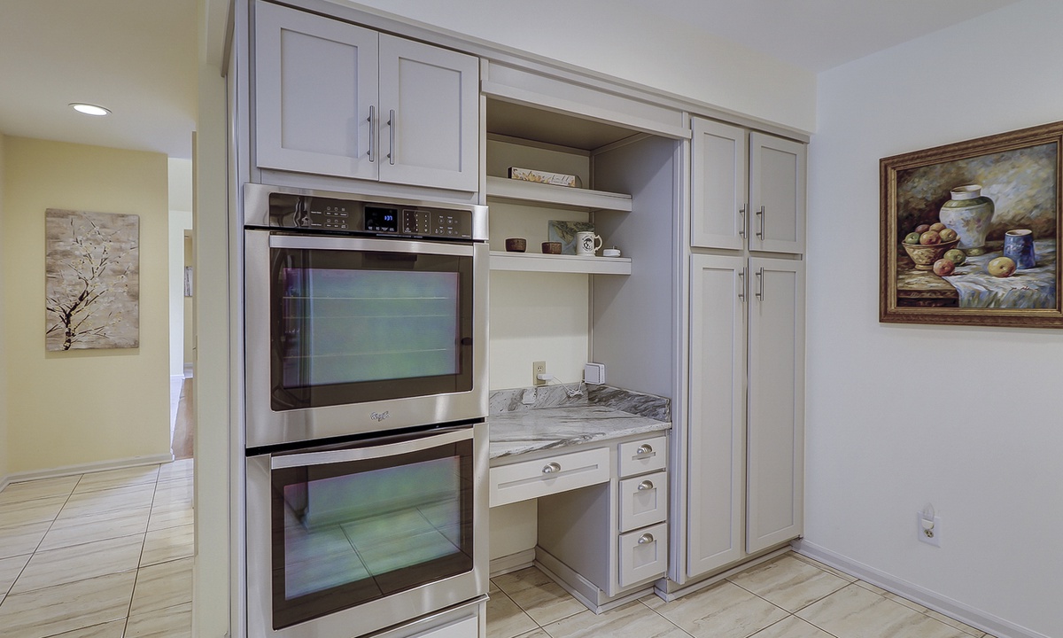 The gourmet kitchen is a chef’s dream, featuring stainless steel appliances, marble countertops, abundant cabinetry, double ovens, a Keurig, and more!