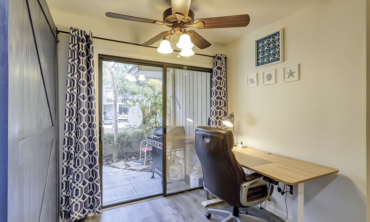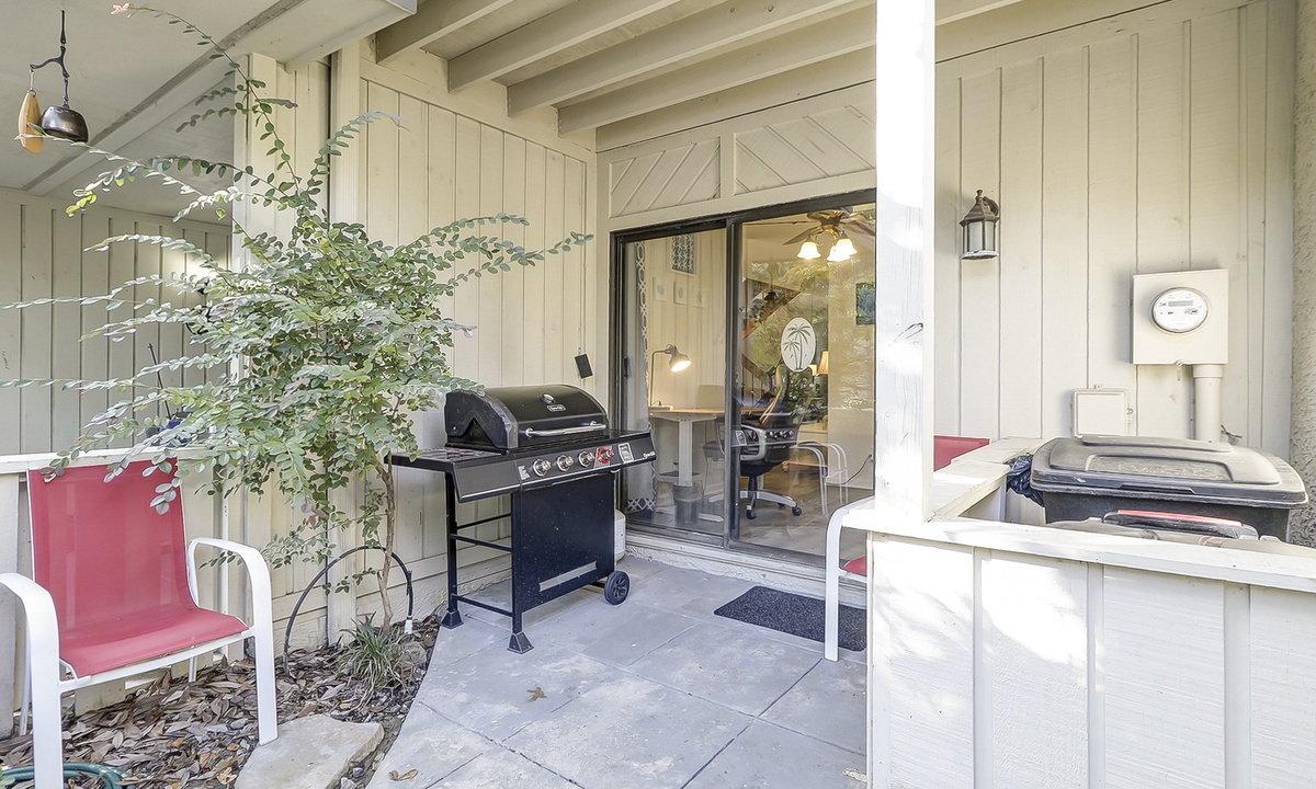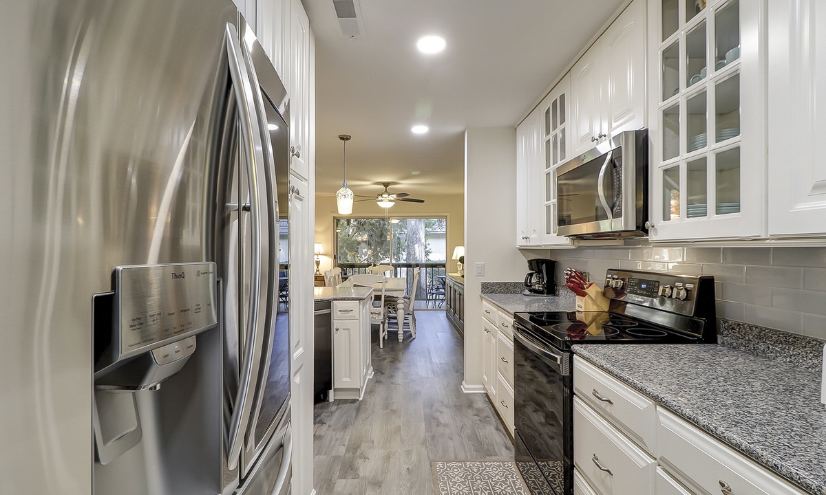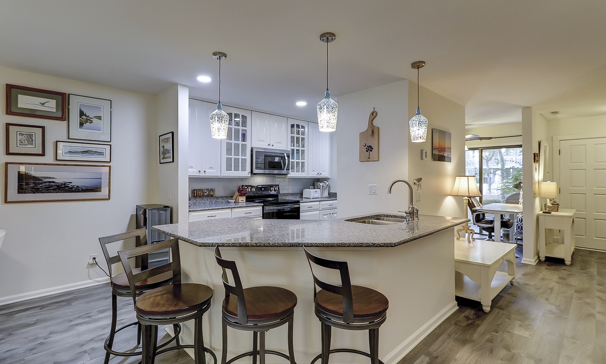 The kitchen features a bar area, stainless appliances, granite counters and a separate dedicated work space. A propane grill is located on the front area of the condo, with access from the kitchen.