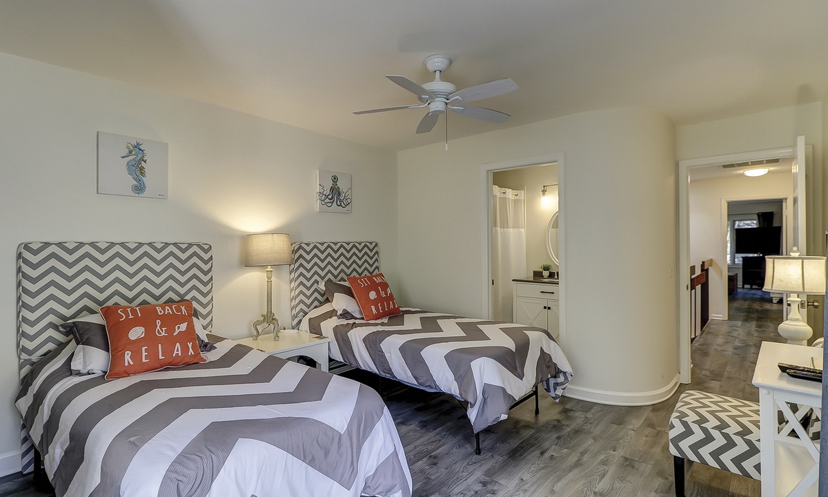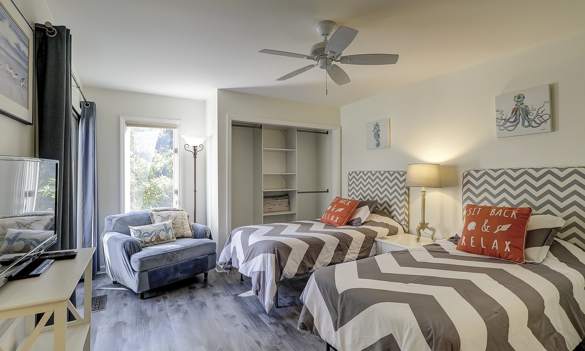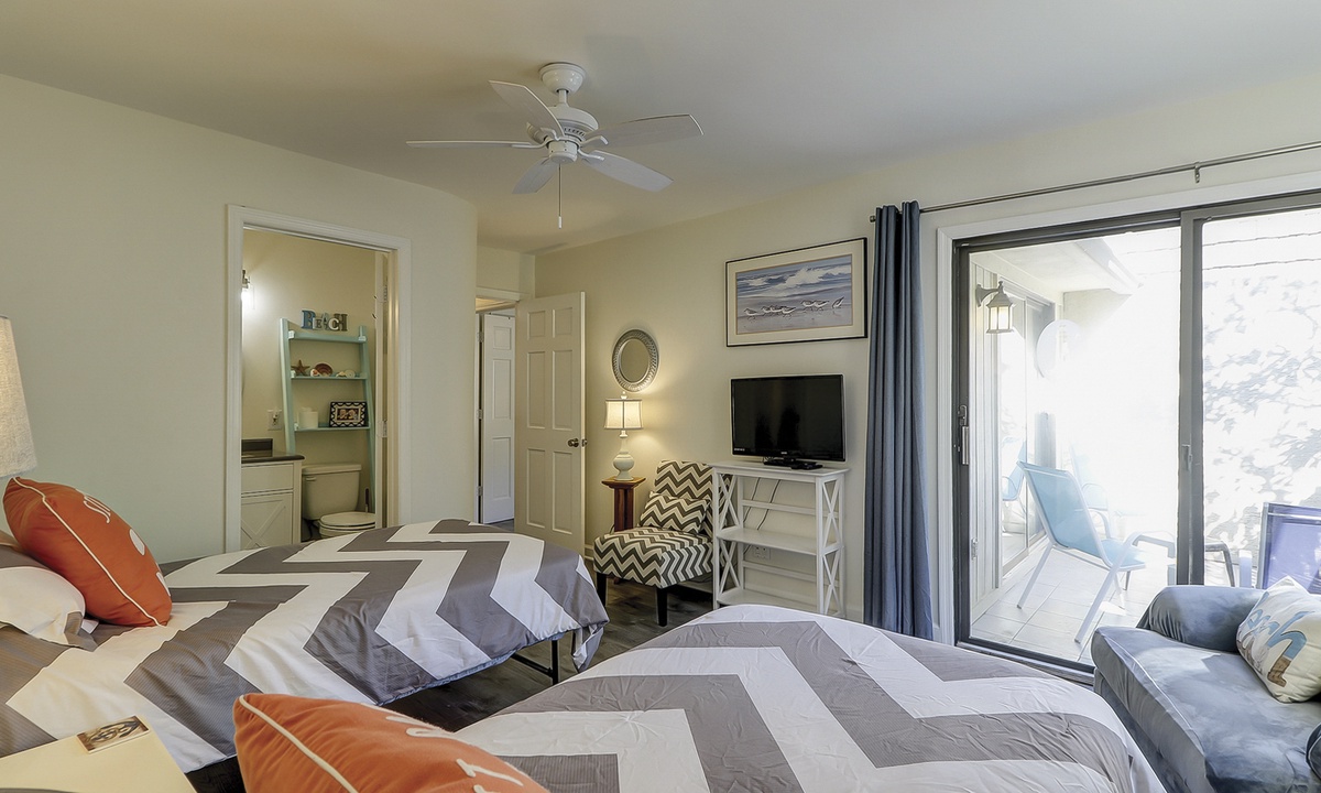 The third bedroom features two twin beds, a Smart TV, shared balcony and a private bathroom with a tub/shower combination.