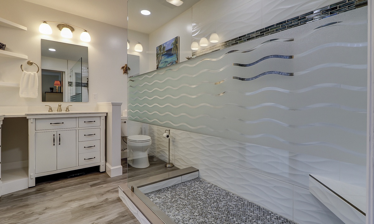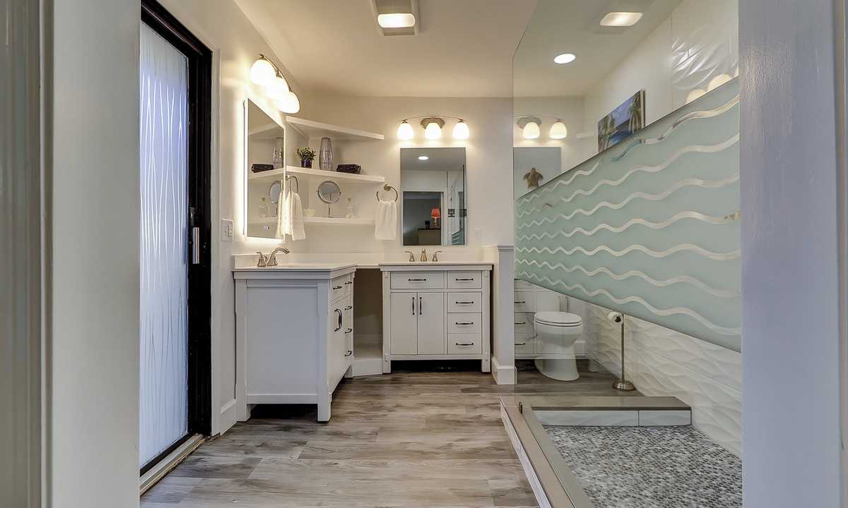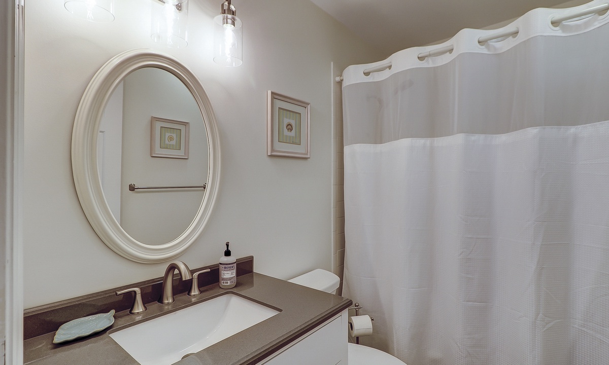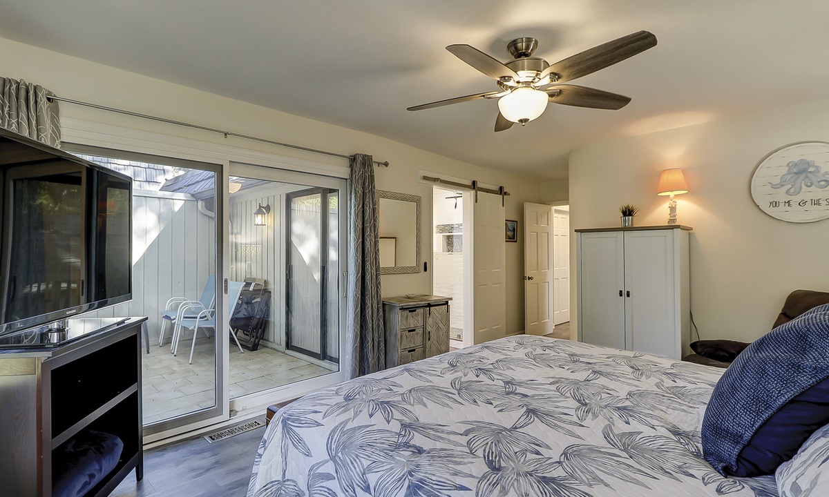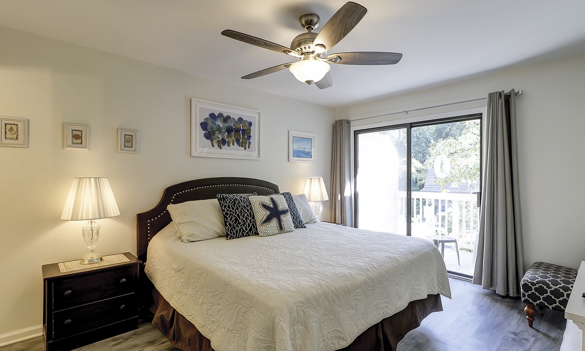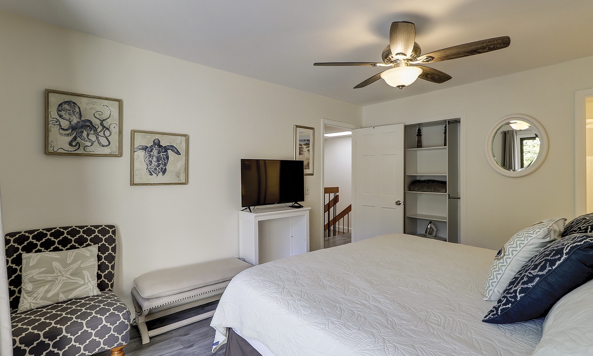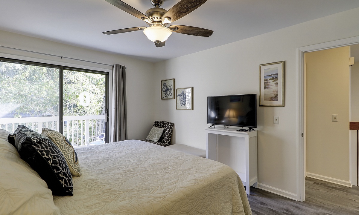 All 3 bedrooms are located on the 2nd level. The main suite features a king bed, private balcony area, Smart TV and a gorgeous renovated bathroom with a large, tiled walk-in shower and dual vanities