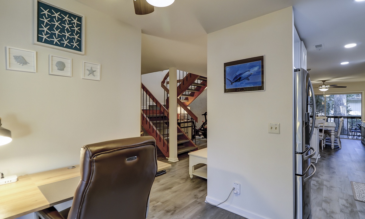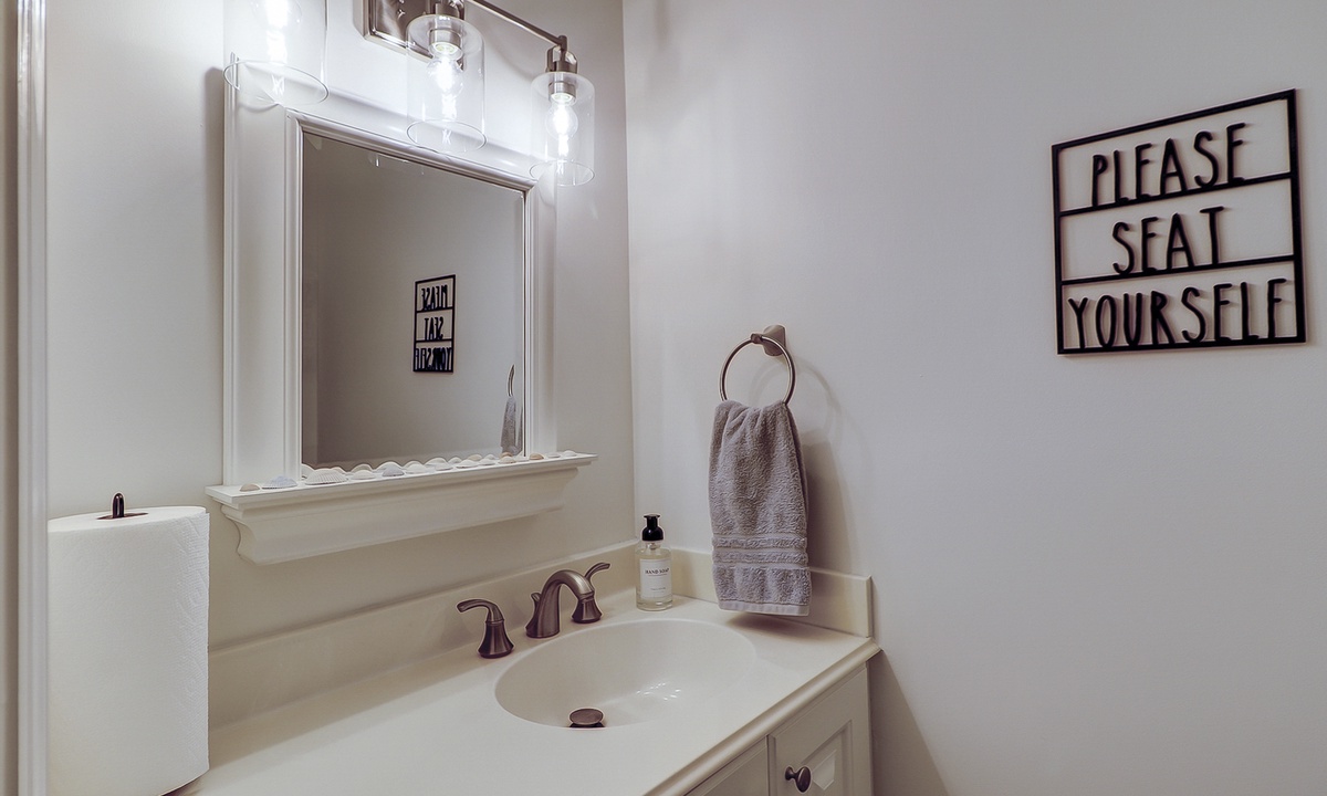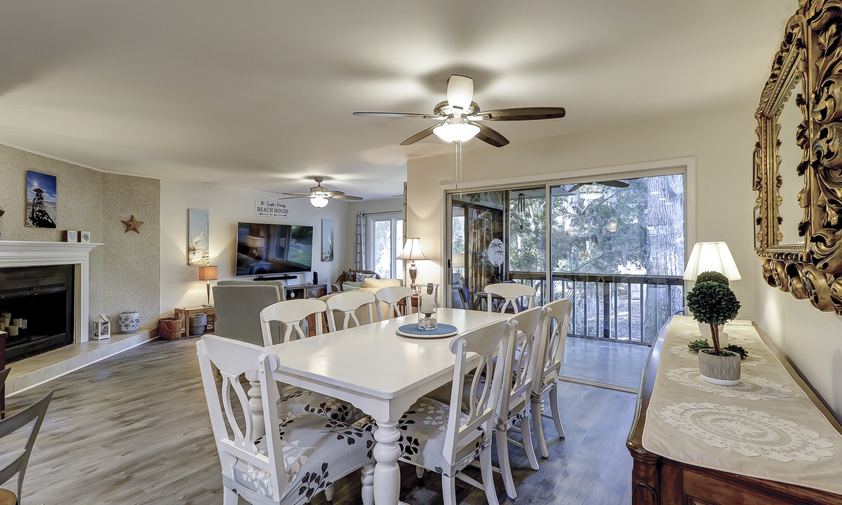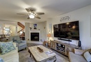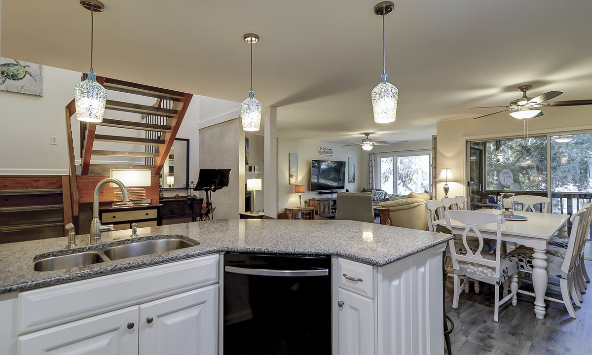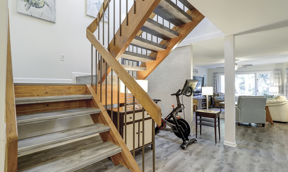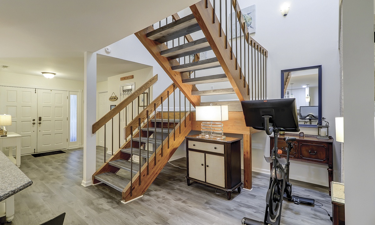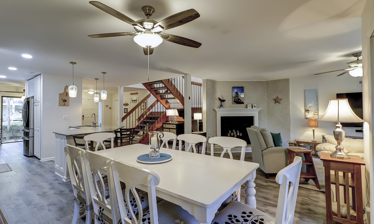 The main floor of the townhome features a large living area with comfortable furnishings, a 75" Smart TV, family-friendly games and movies. An open concept floor plan provides easy access to the dining area and kitchen, as well as powder room. The owners of the home have also provided a Peloton Bike for guests to use. *Additional waiver will need to be signed for usage.