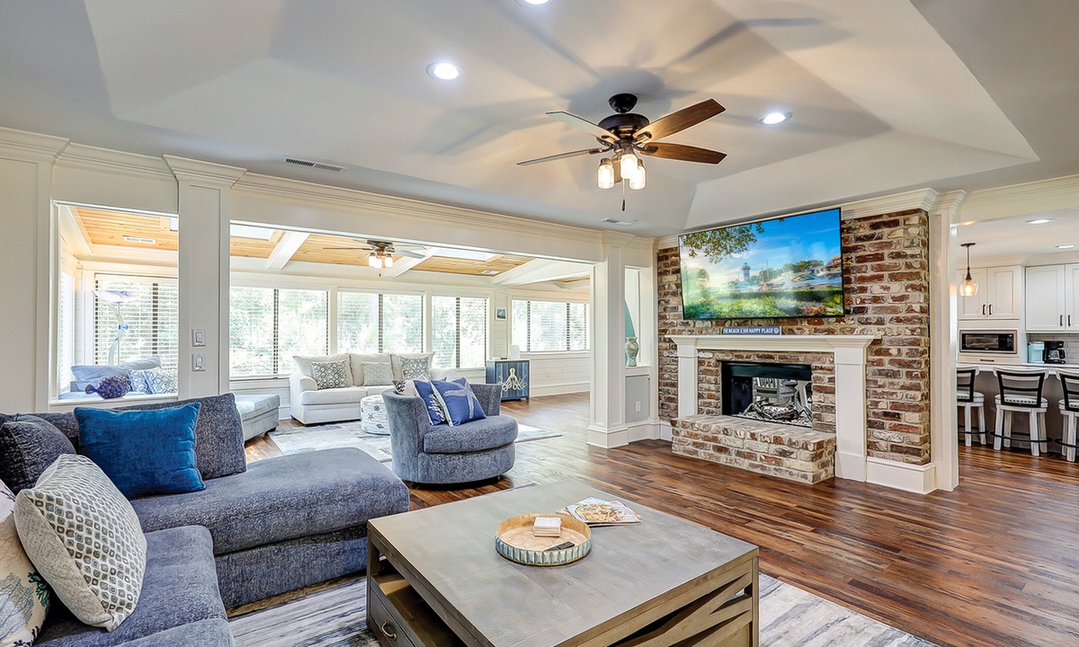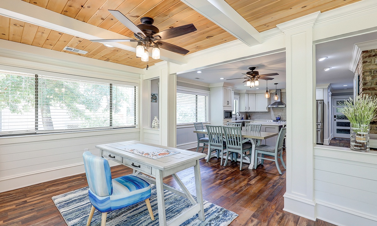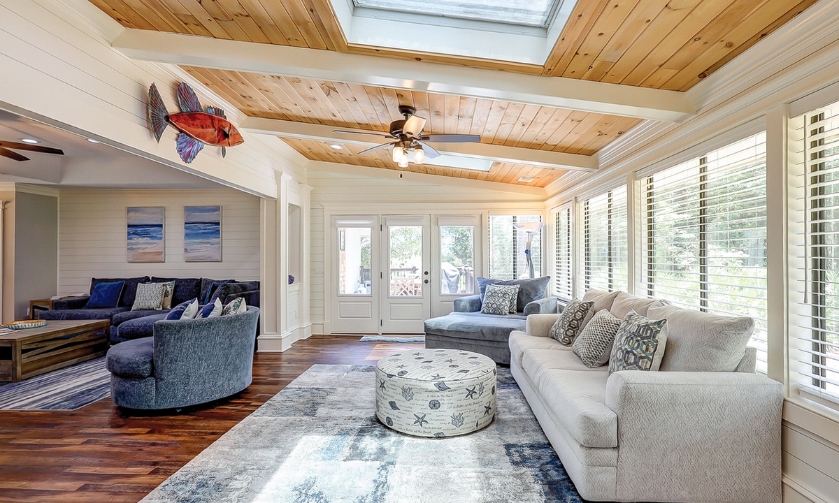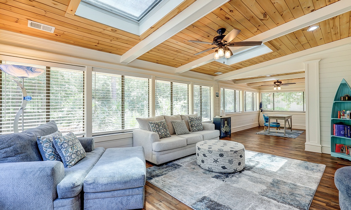 The living area is comfortably furnished and offers a large Smart TV. The space extends to a sun room with additional plush seating, providing plenty of space for your family to lounge. Just beyond the sun room, you'll find a dedicated work space- perfect for those on a working vacation.