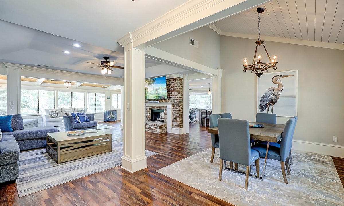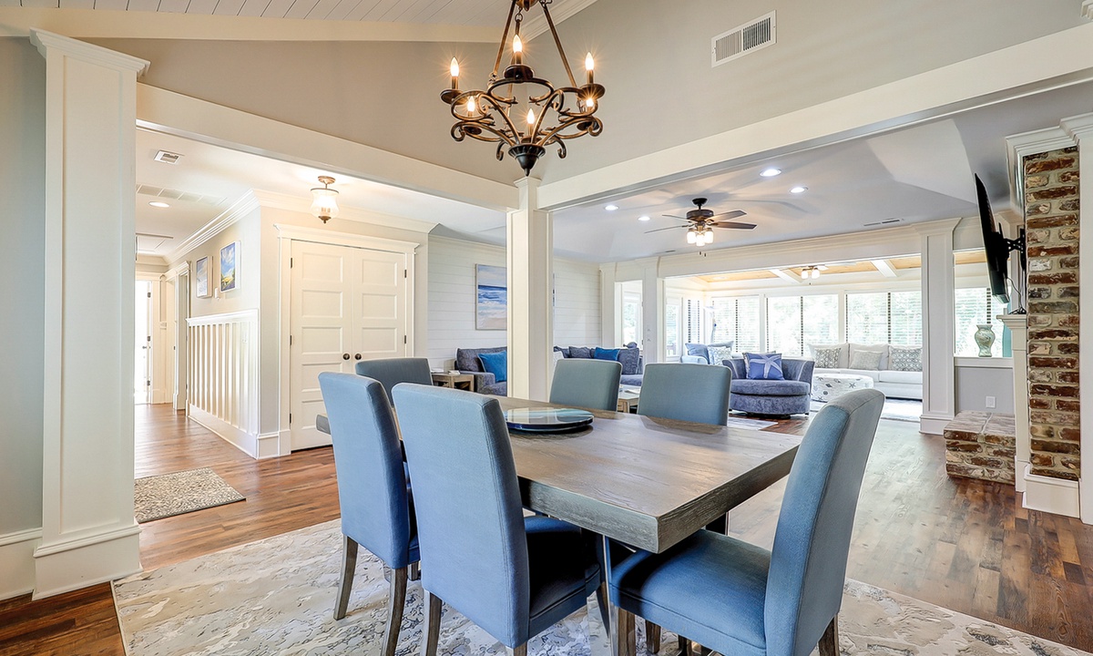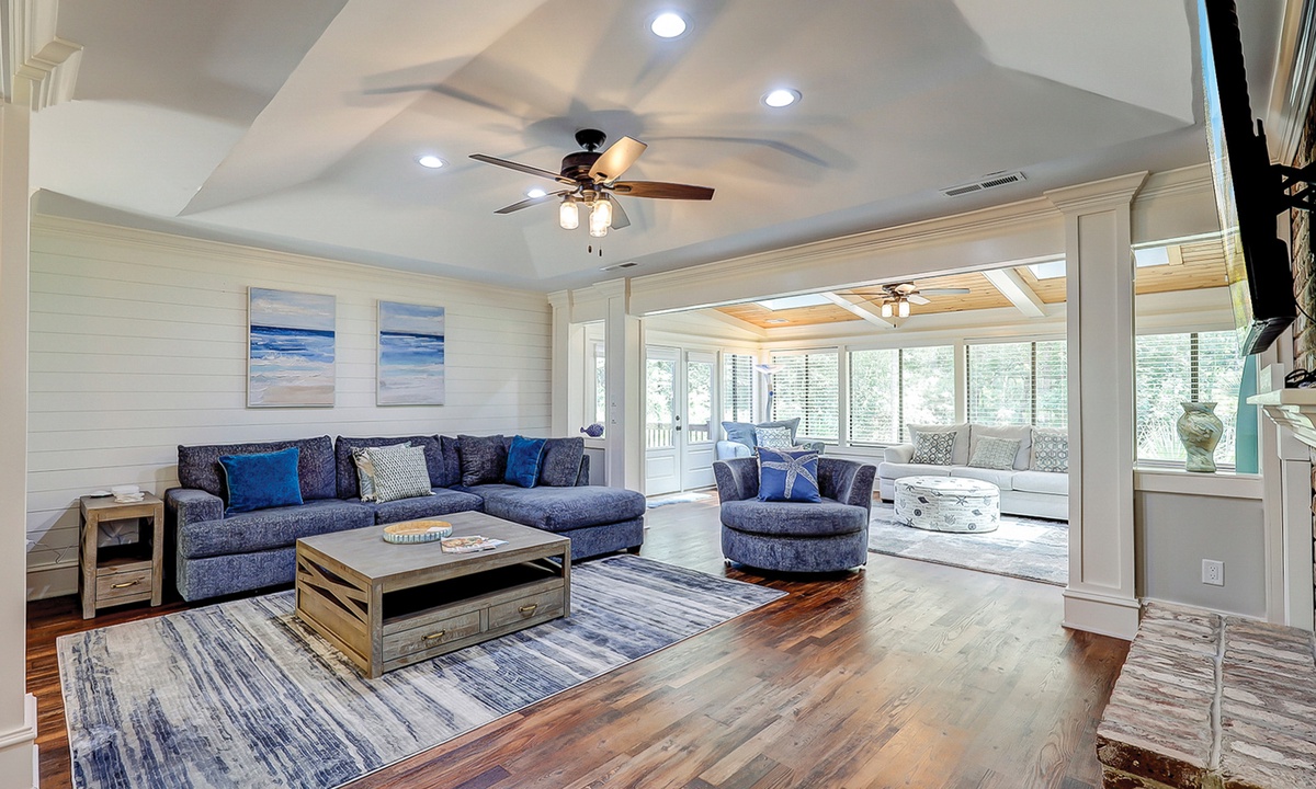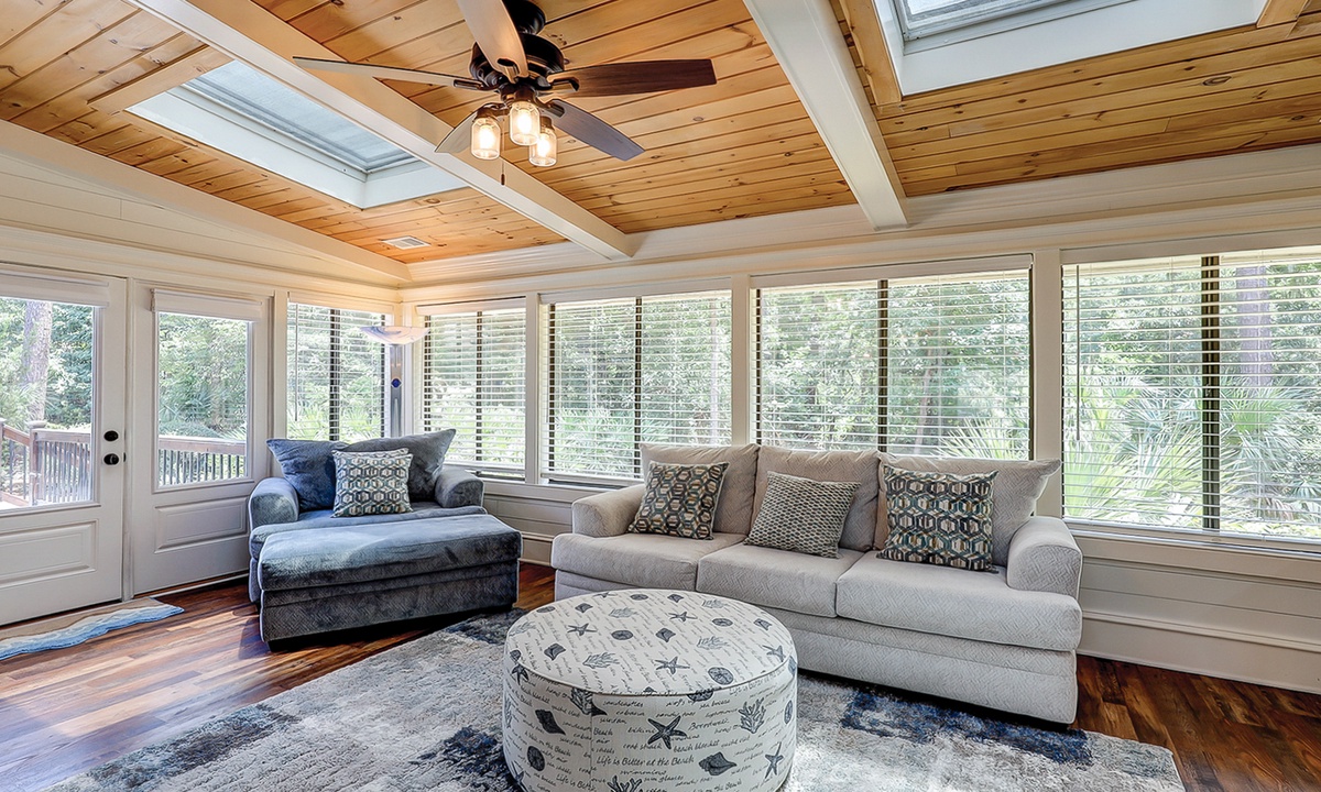 The living area is comfortably furnished and offers a large Smart TV. The space extends to a sun room with additional plush seating, providing plenty of space for your family to lounge. Just beyond the sun room, you'll find a dedicated work space- perfect for those on a working vacation.