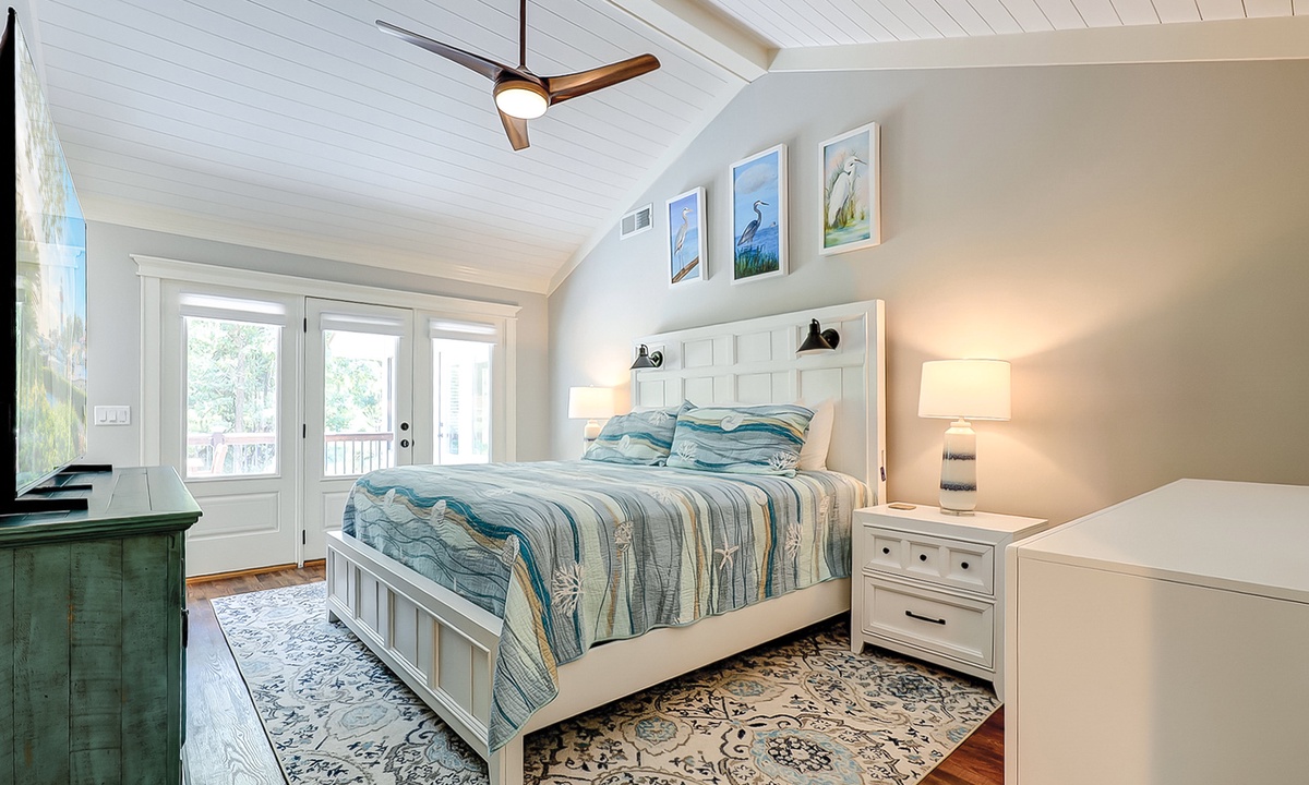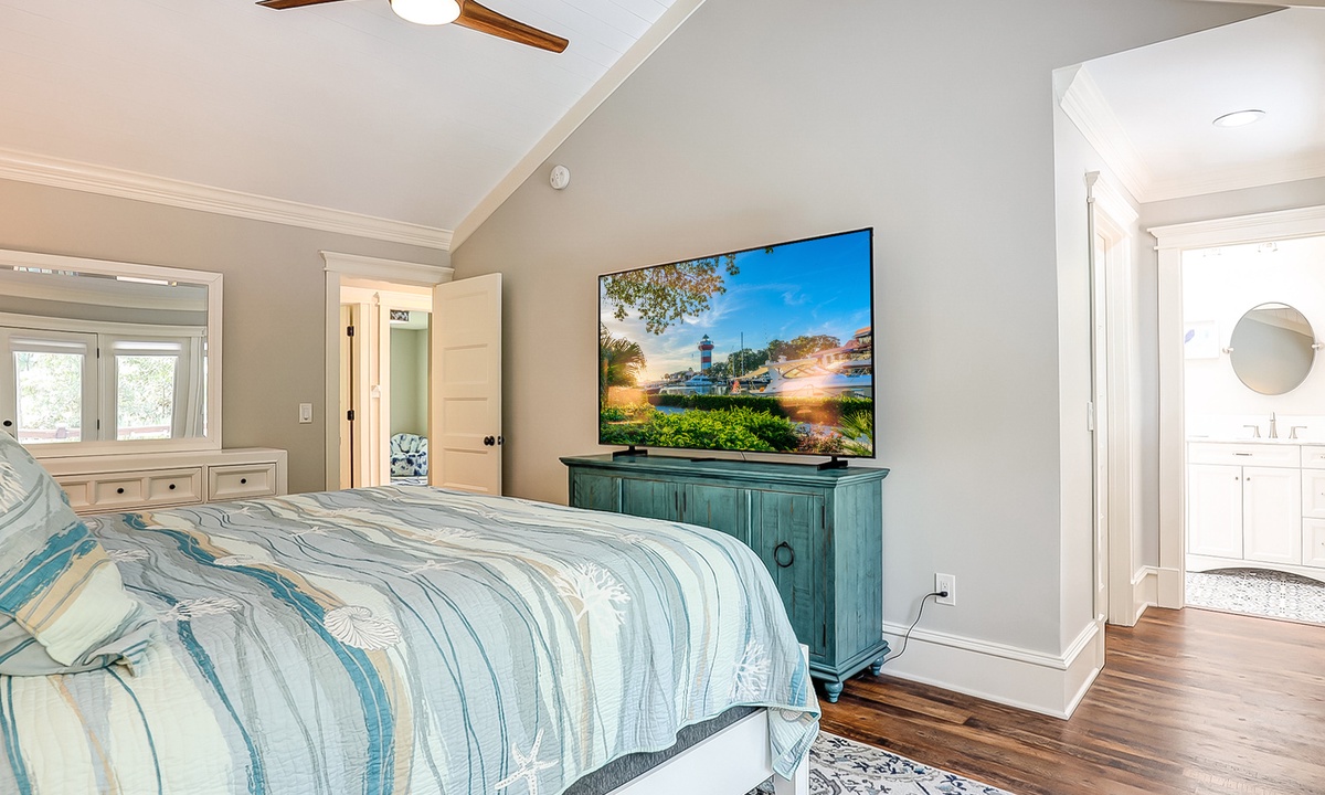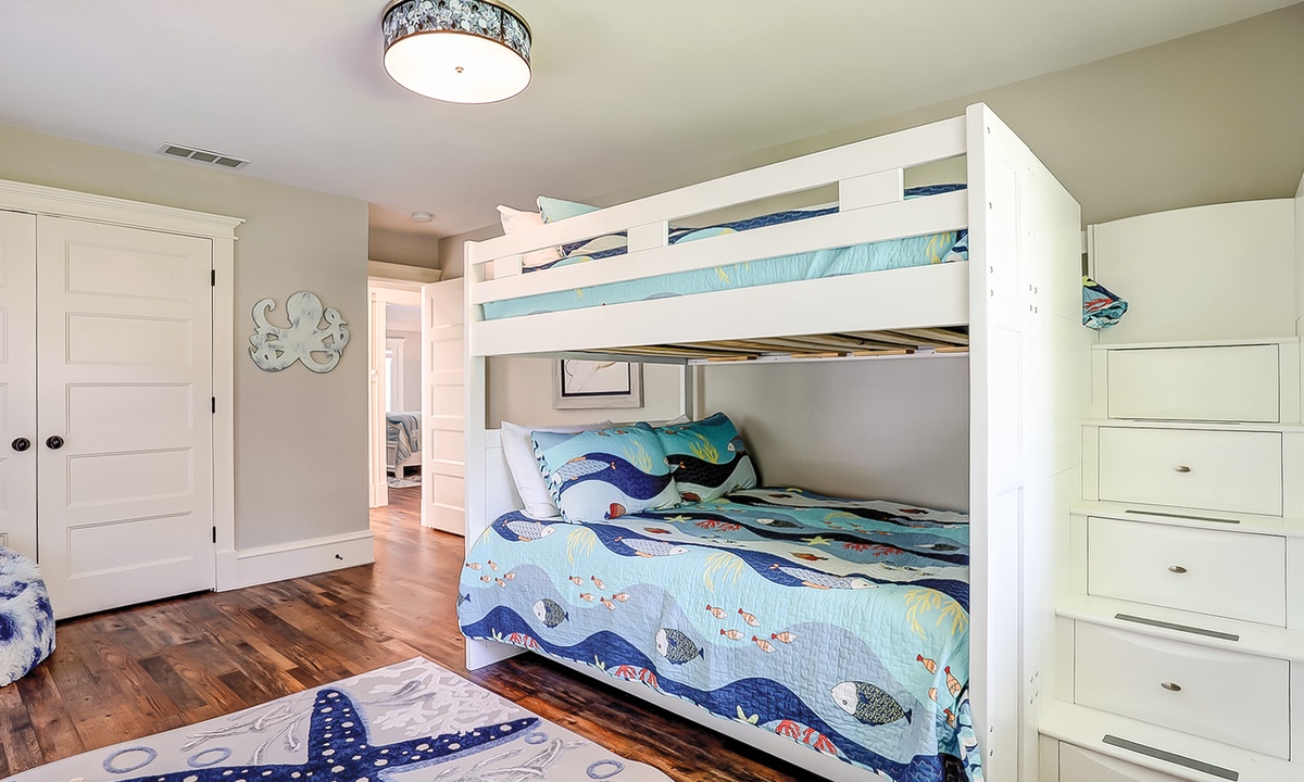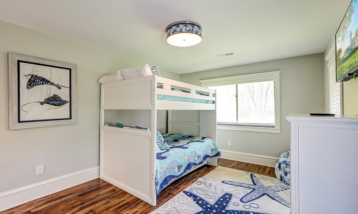 The main bedroom offers a king bed, Smart TV and a private bathroom with a large, tiled walk-in shower. The first guest bedroom has a king bed and a Smart TV, while the second guest room has full-over-full bunk bed with a twin trundle and a Smart TV.
