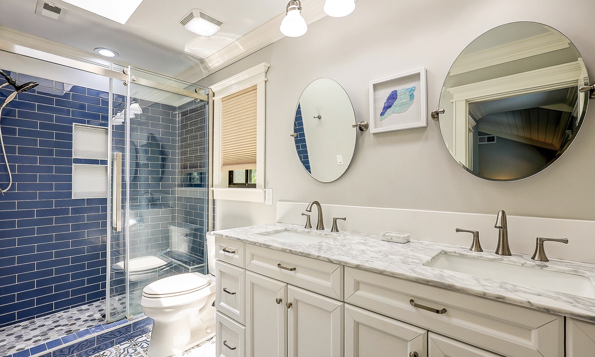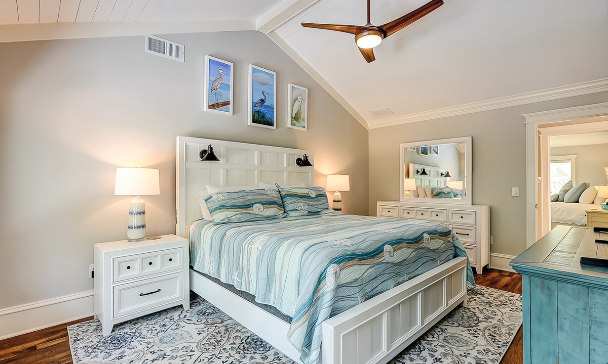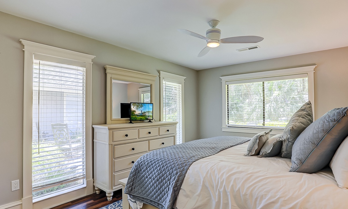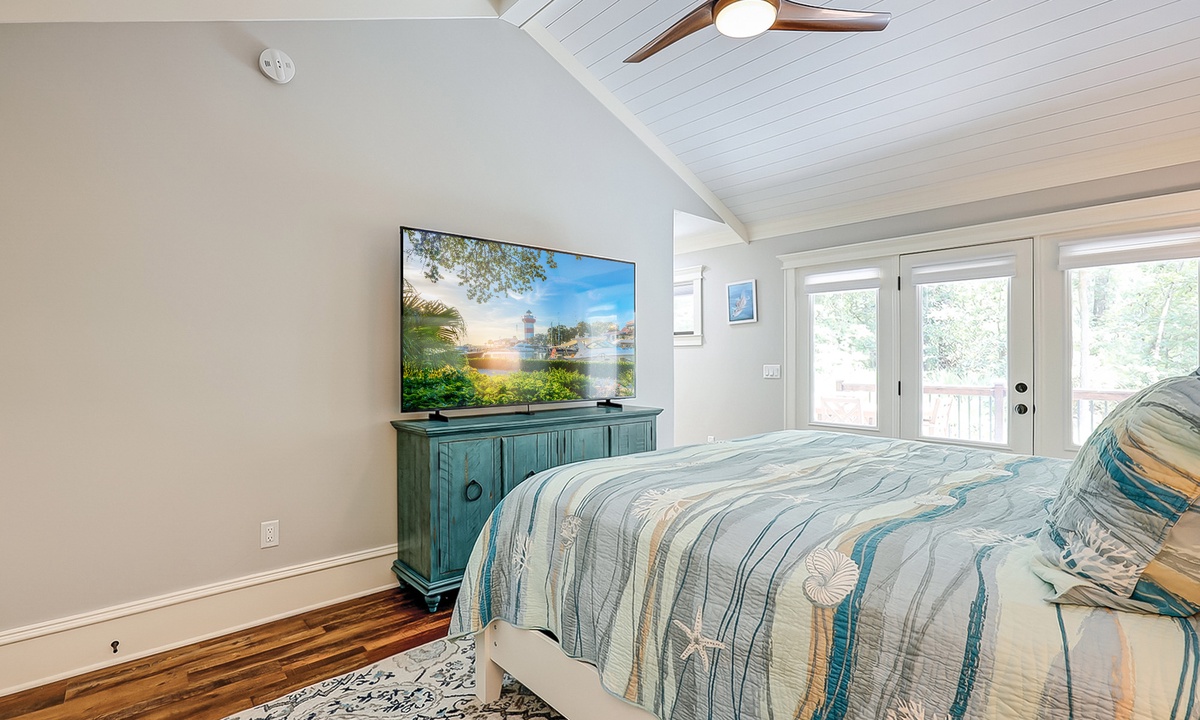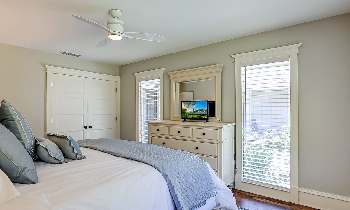 The main bedroom offers a king bed, Smart TV and a private bathroom with a large, tiled walk-in shower. The first guest bedroom has a king bed and a Smart TV, while the second guest room has full-over-full bunk bed with a twin trundle and a Smart TV.