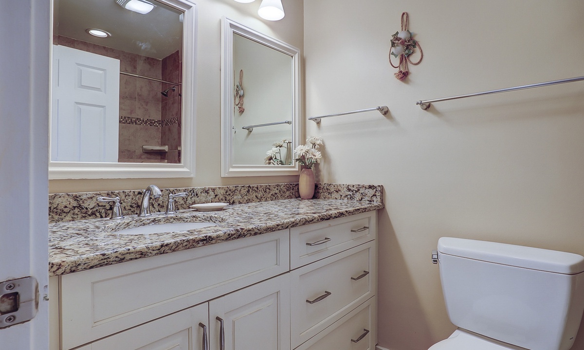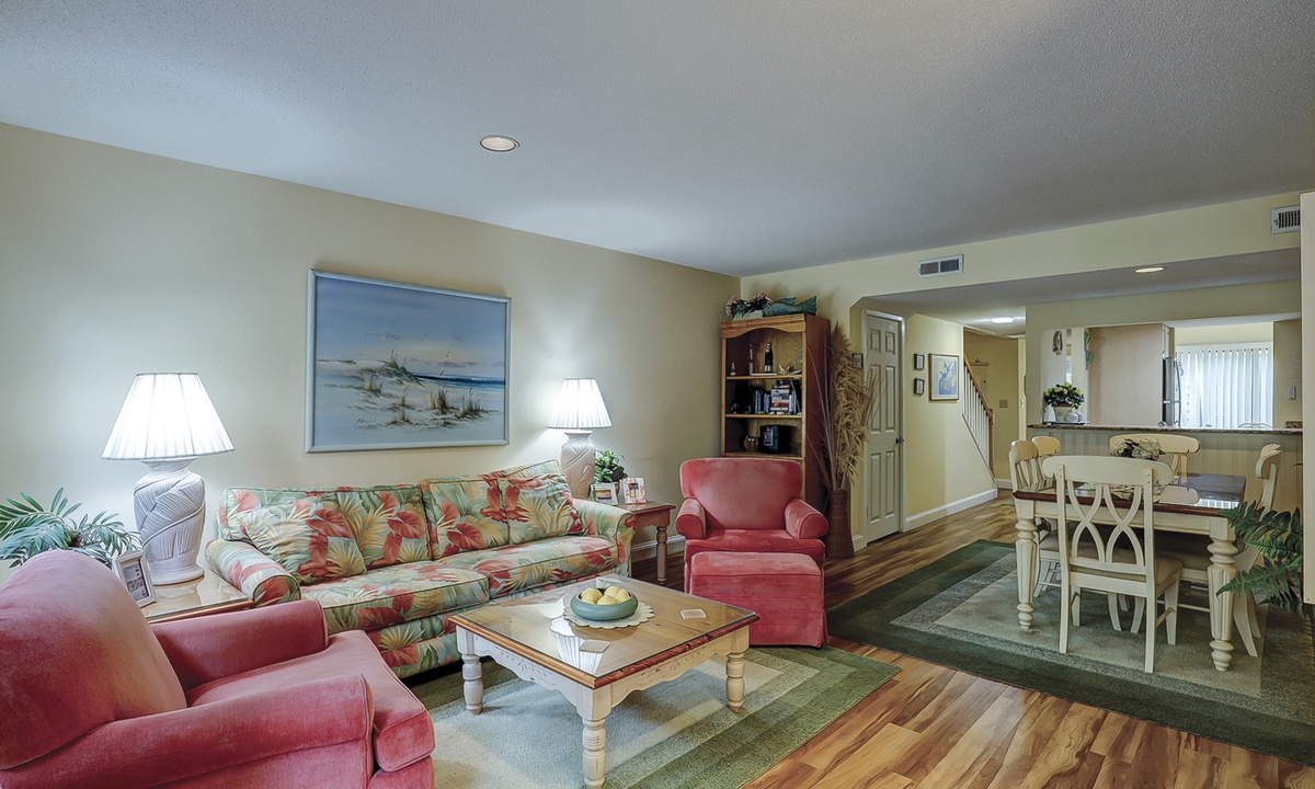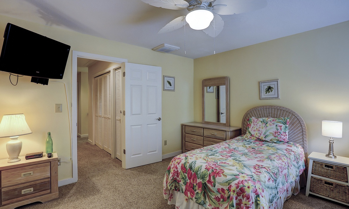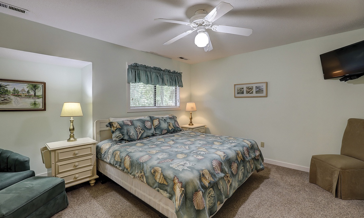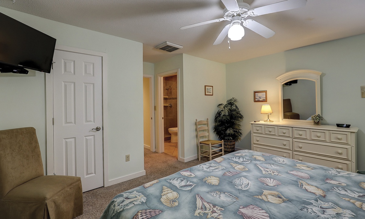 Greens 151 comfortably sleeps 6 guests in 2 bedrooms on the upper level. The main bedroom has a king bed and private bath as well as the guest bedroom with 2 twin beds and also a private bath. Bedrooms are both equipped with flat screen HDTV's. Both bathrooms have been recently updated granite countertops, new vanities, ceramic tile and all new light fixtures.