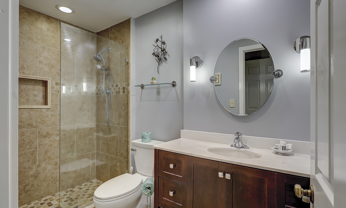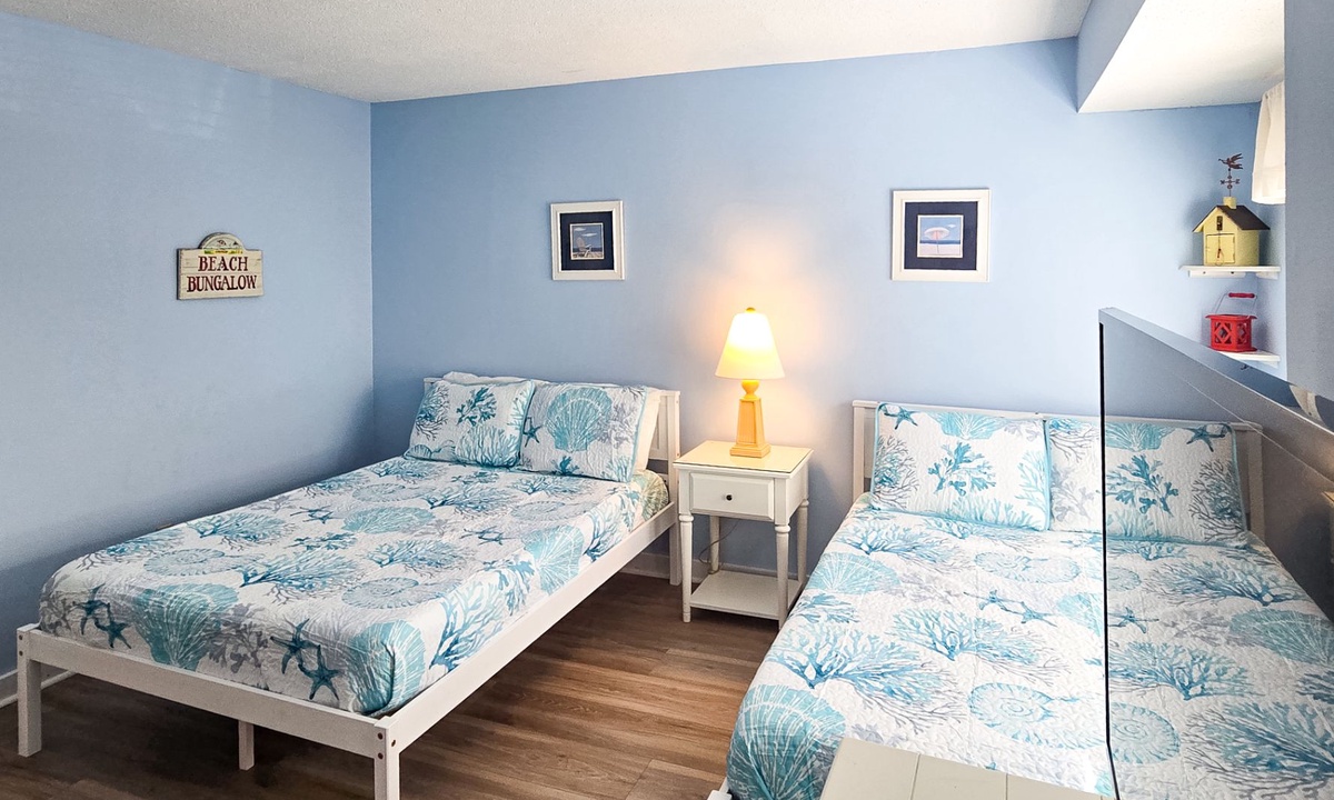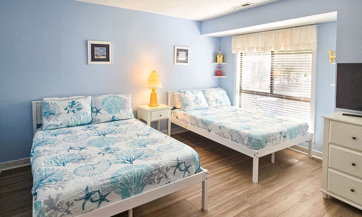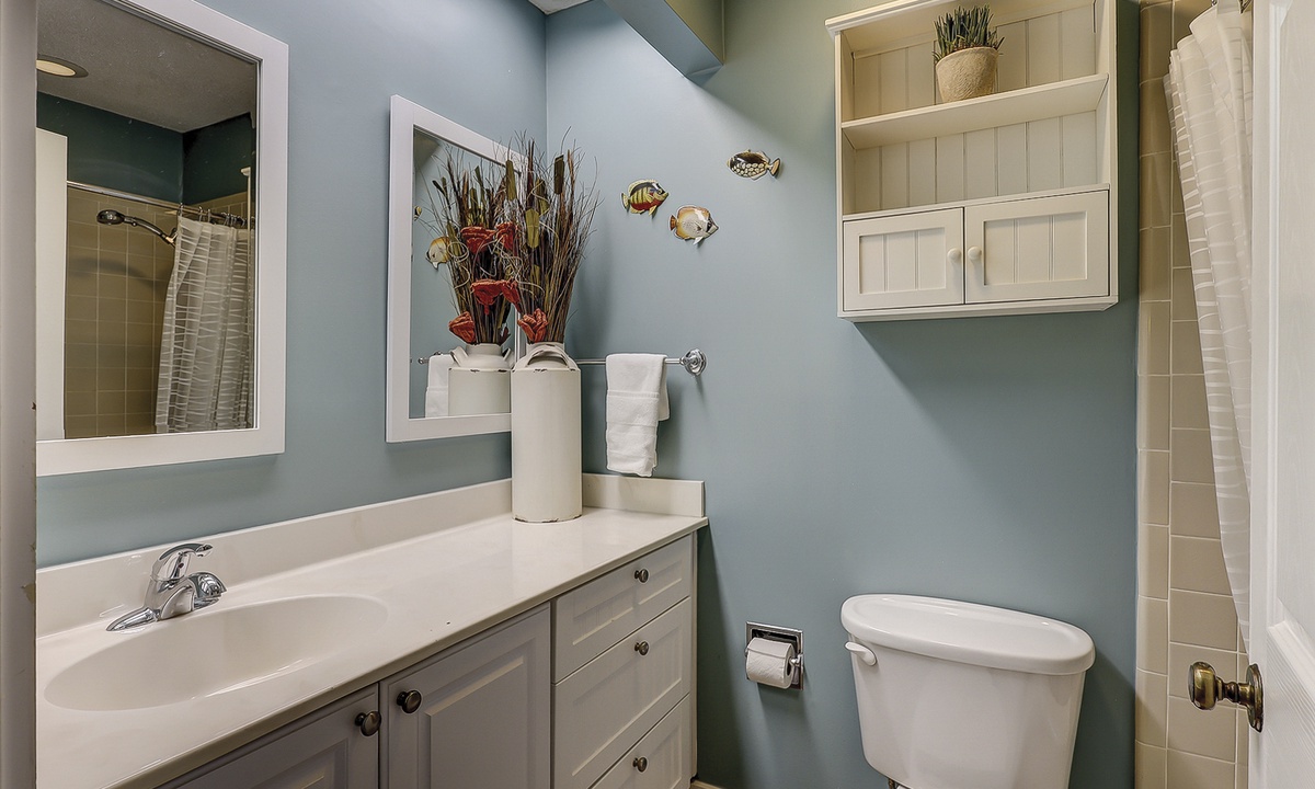 Upstairs, you’ll find two comfortable bedrooms, each with its own bathroom. The primary bedroom features a queen bed, flat-screen TV, serene golf course views, and an en-suite bathroom with a spacious walk-in shower. The guest bedroom includes two full-sized beds, a flat-screen TV, and access to a hall bathroom with a tub/shower combination.