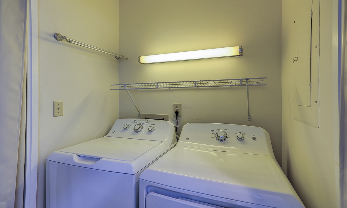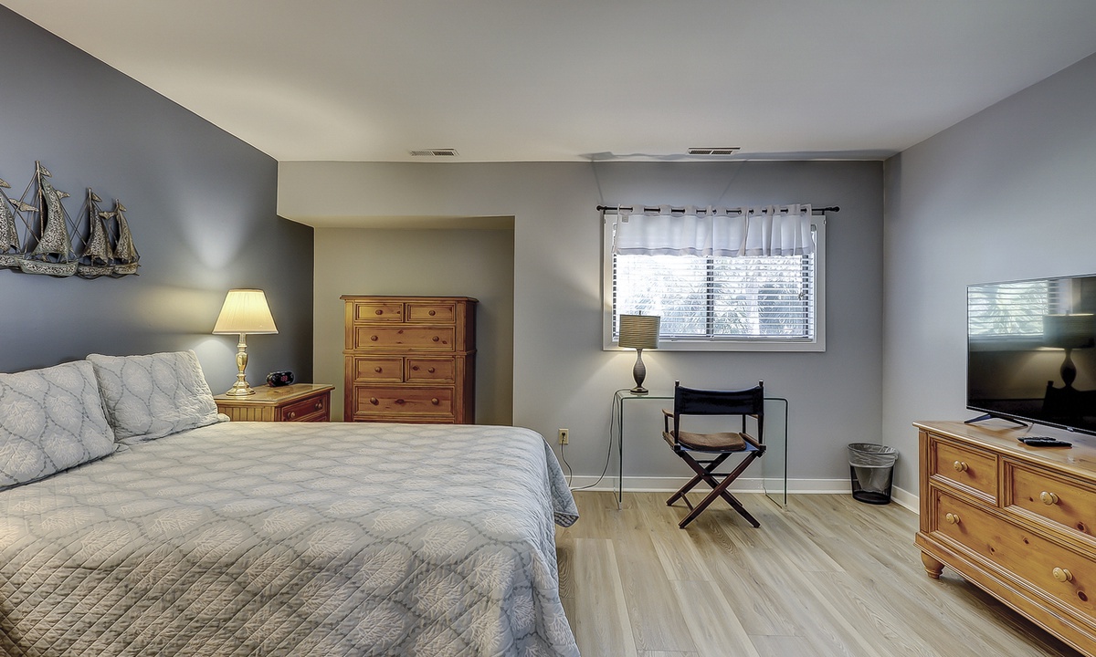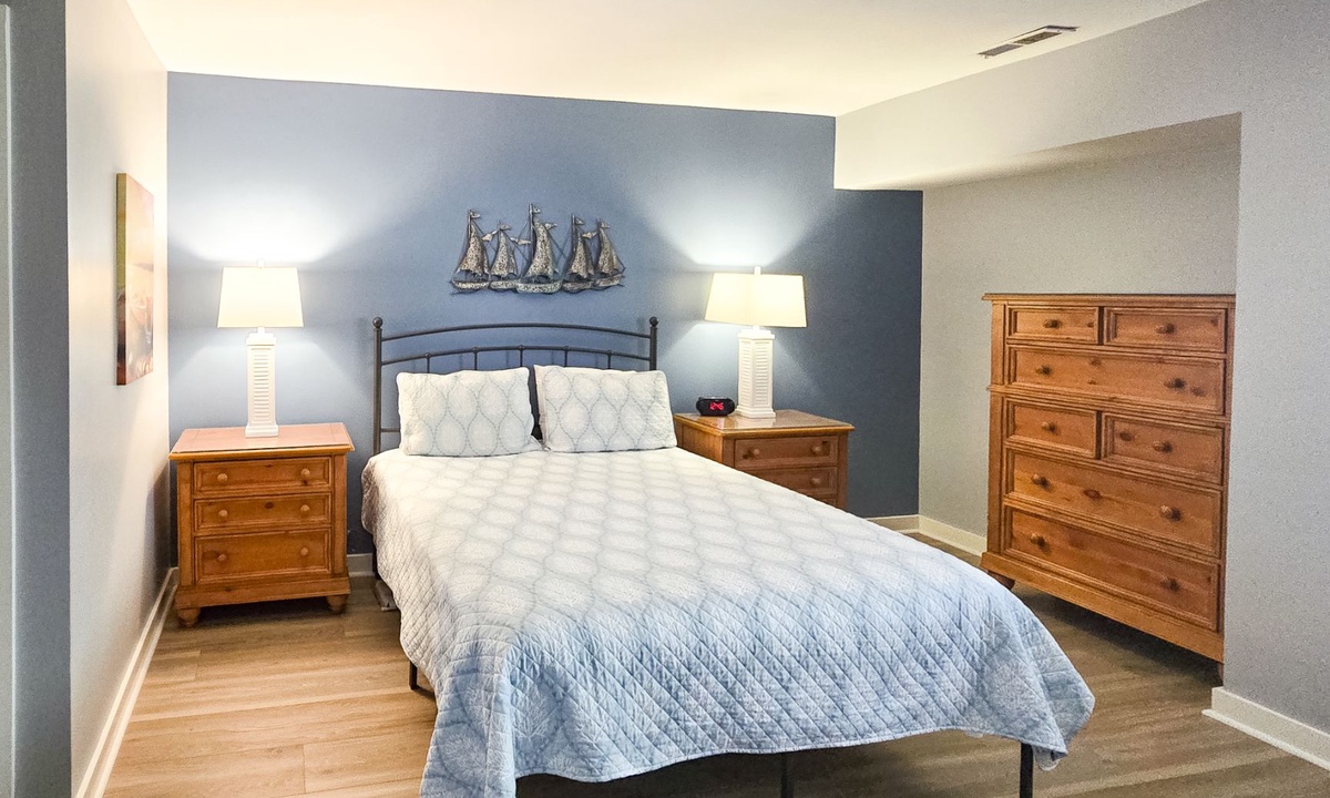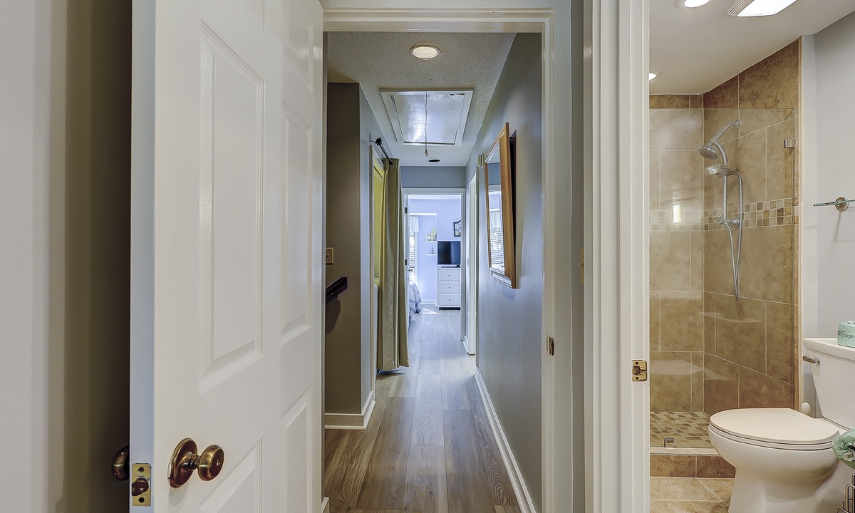 Upstairs, you’ll find two comfortable bedrooms, each with its own bathroom. The primary bedroom features a queen bed, flat-screen TV, serene golf course views, and an en-suite bathroom with a spacious walk-in shower. The guest bedroom includes two full-sized beds, a flat-screen TV, and access to a hall bathroom with a tub/shower combination.