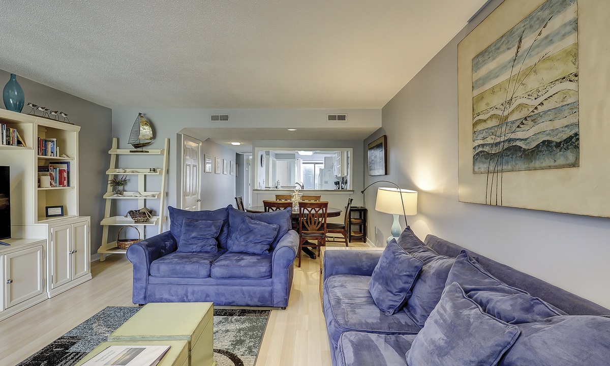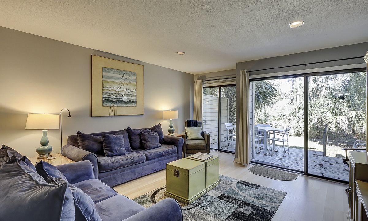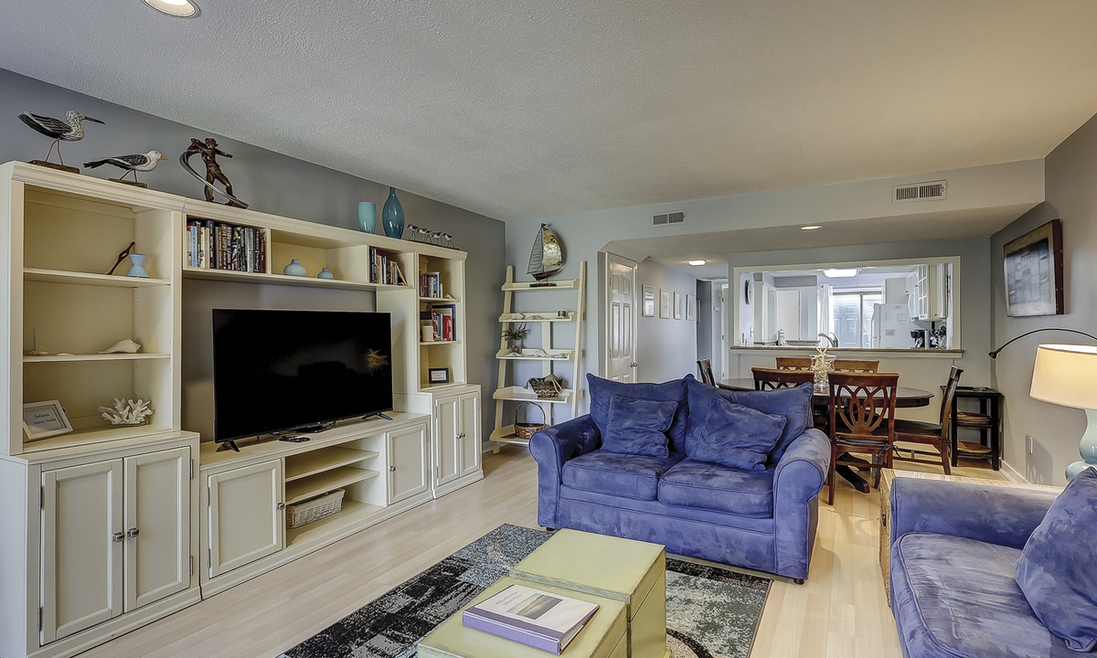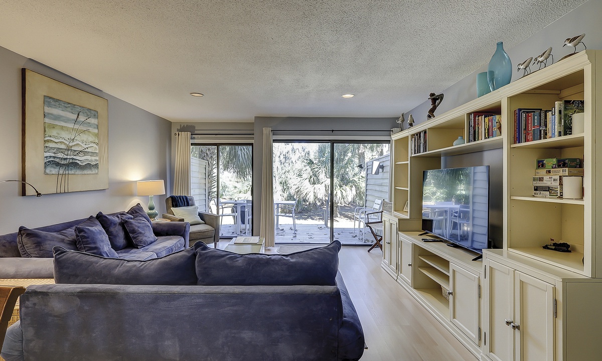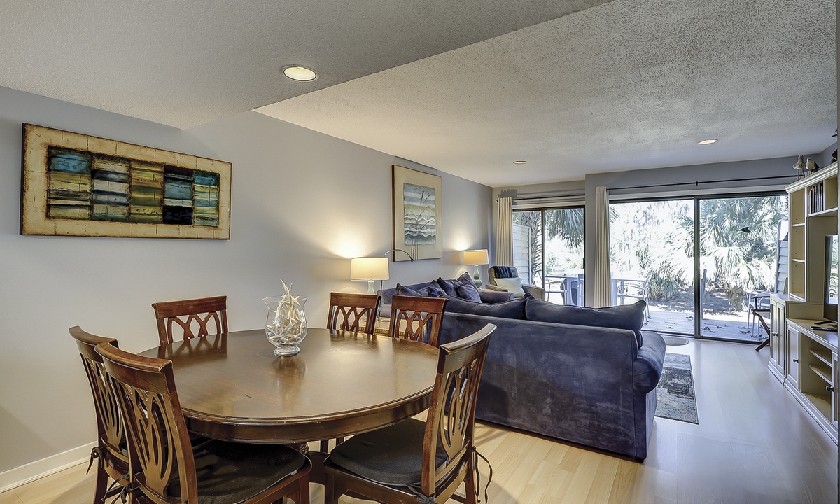 Just beyond the kitchen, the dining area offers seating for six and flows seamlessly into the cozy living room. Here you'll find a Smart TV, a sleeper sofa, and sliding glass doors leading to the private patio. This lovely outdoor area overlooks the golf course and includes a dining table and propane grill—perfect for relaxing or entertaining.