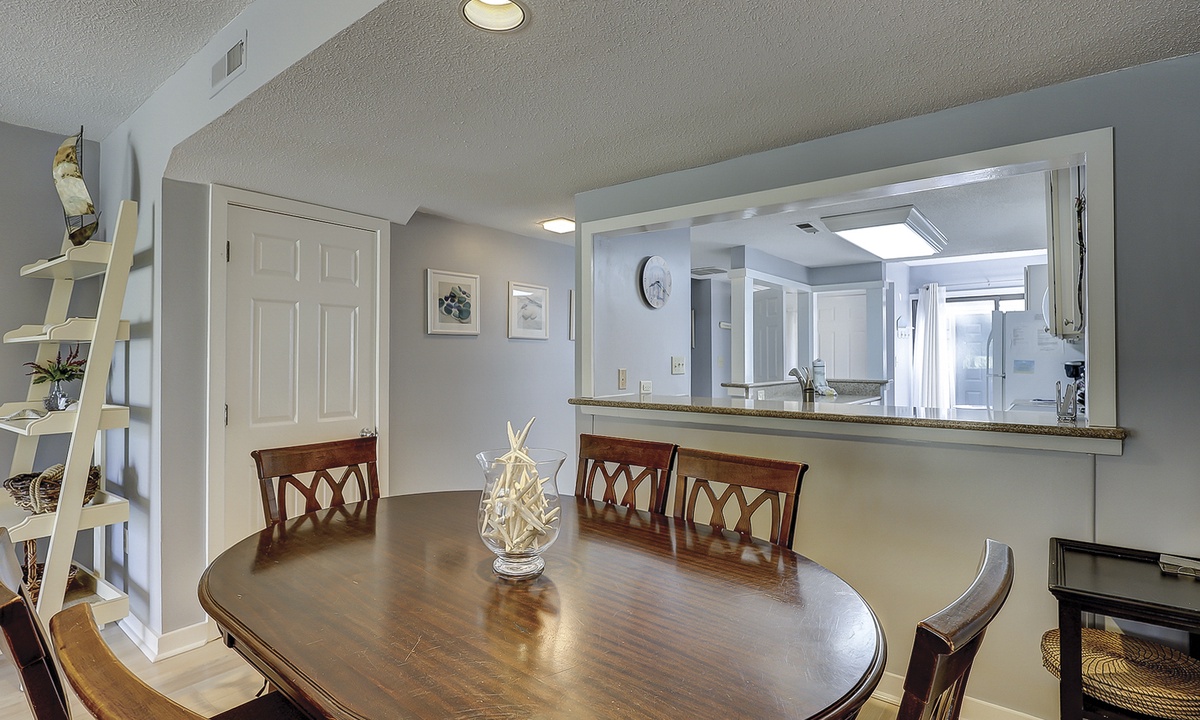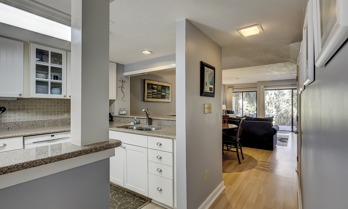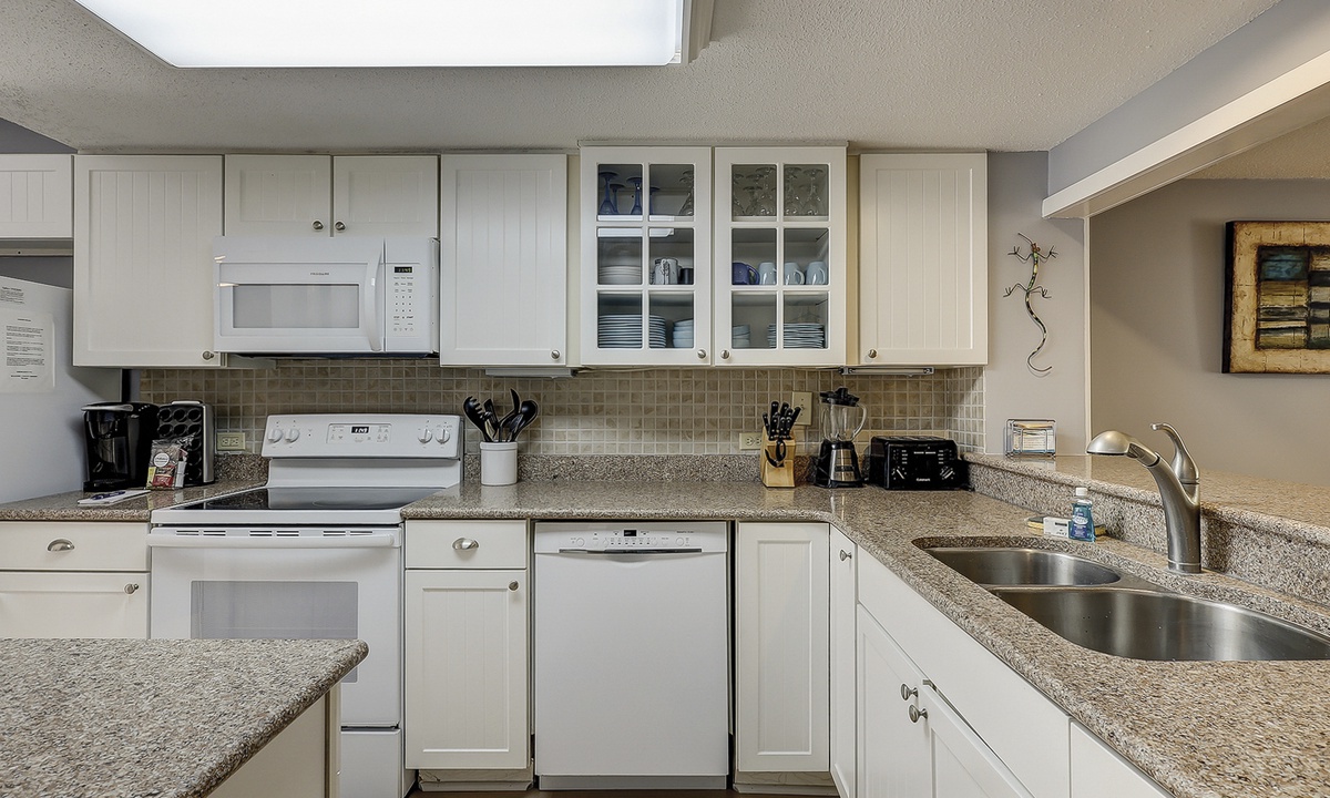 The kitchen has been opened from its original design to create a bright, functional space. It features granite countertops, newer cabinetry, a Keurig coffee maker, and all the cookware and essentials needed to prepare meals for the whole family.