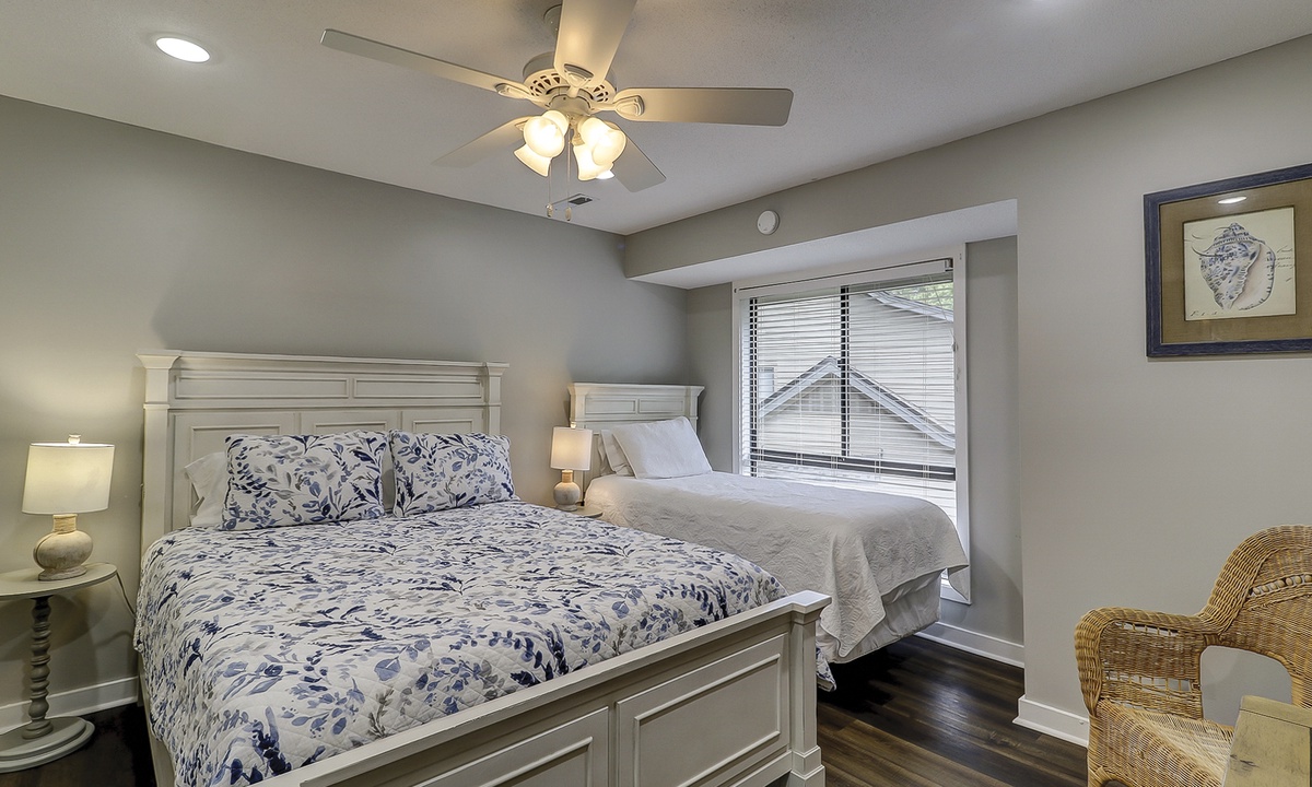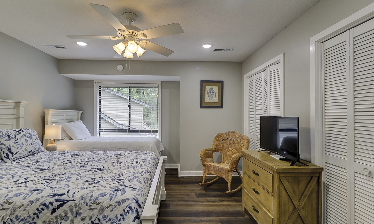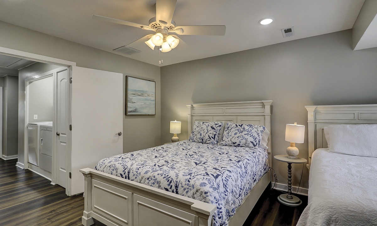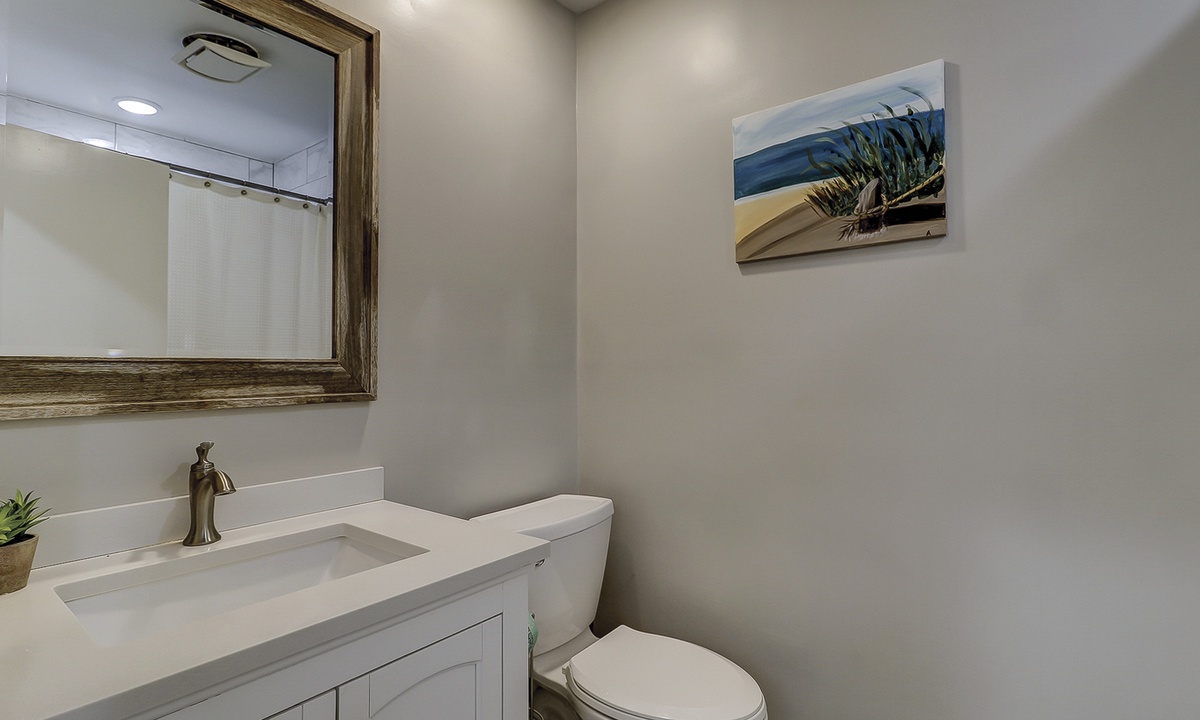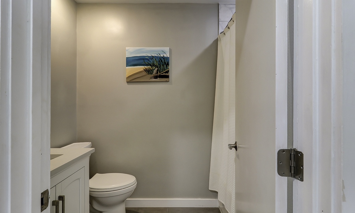 Just down the hall you'll find the guest bedroom with a queen bed and a twin bed, as well as a Smart TV. Guests can access the hall bathroom with a tub/shower combination. A powder room is located on the first floor as well for added convenience.