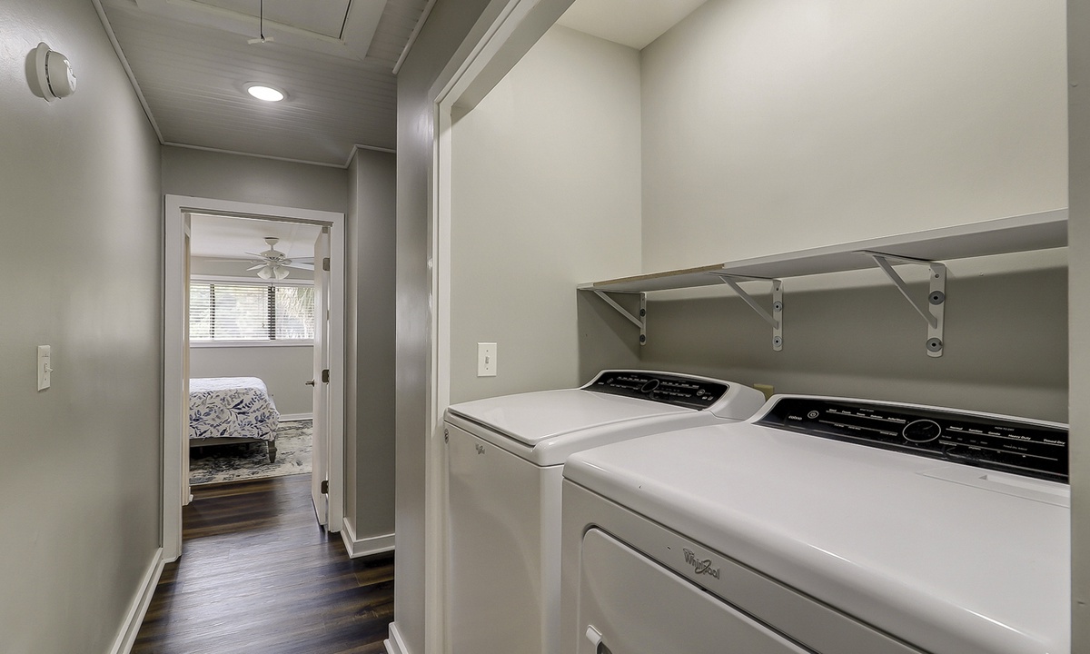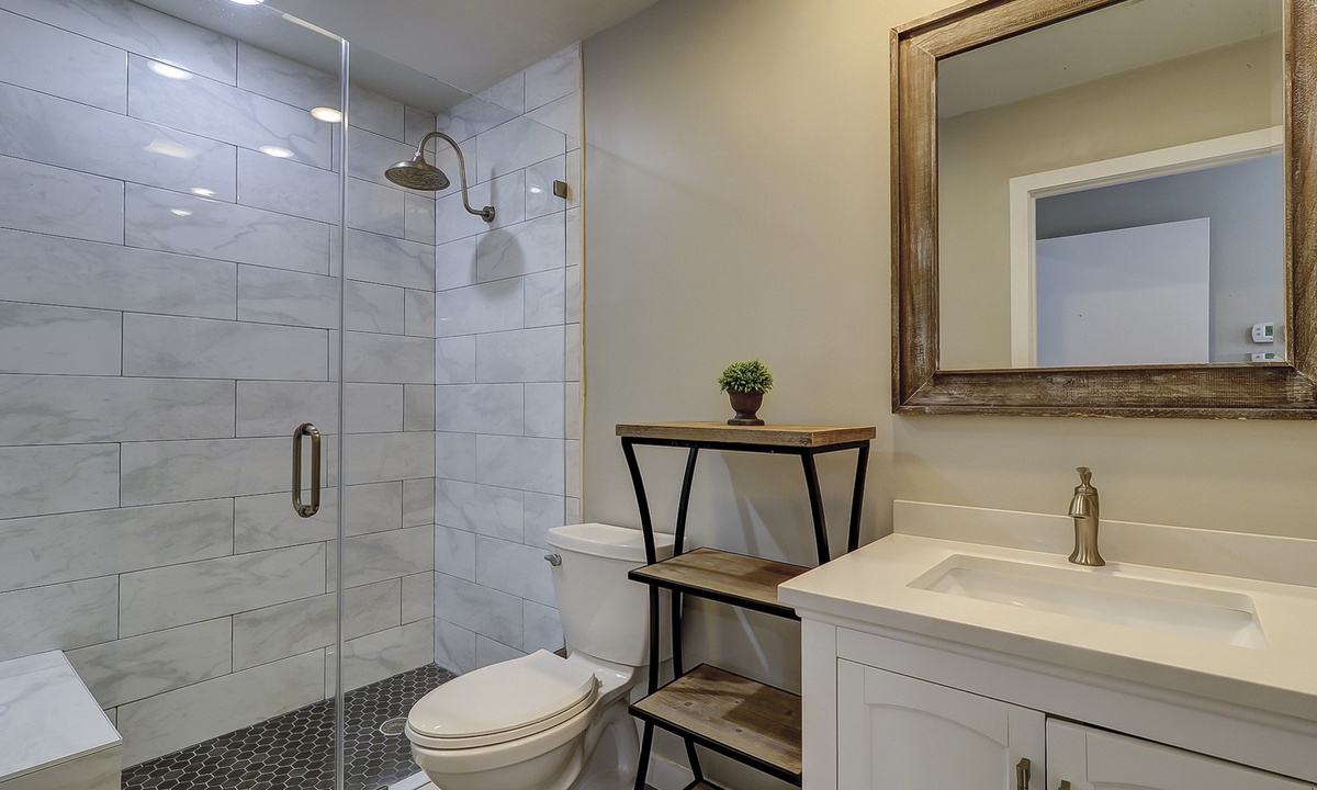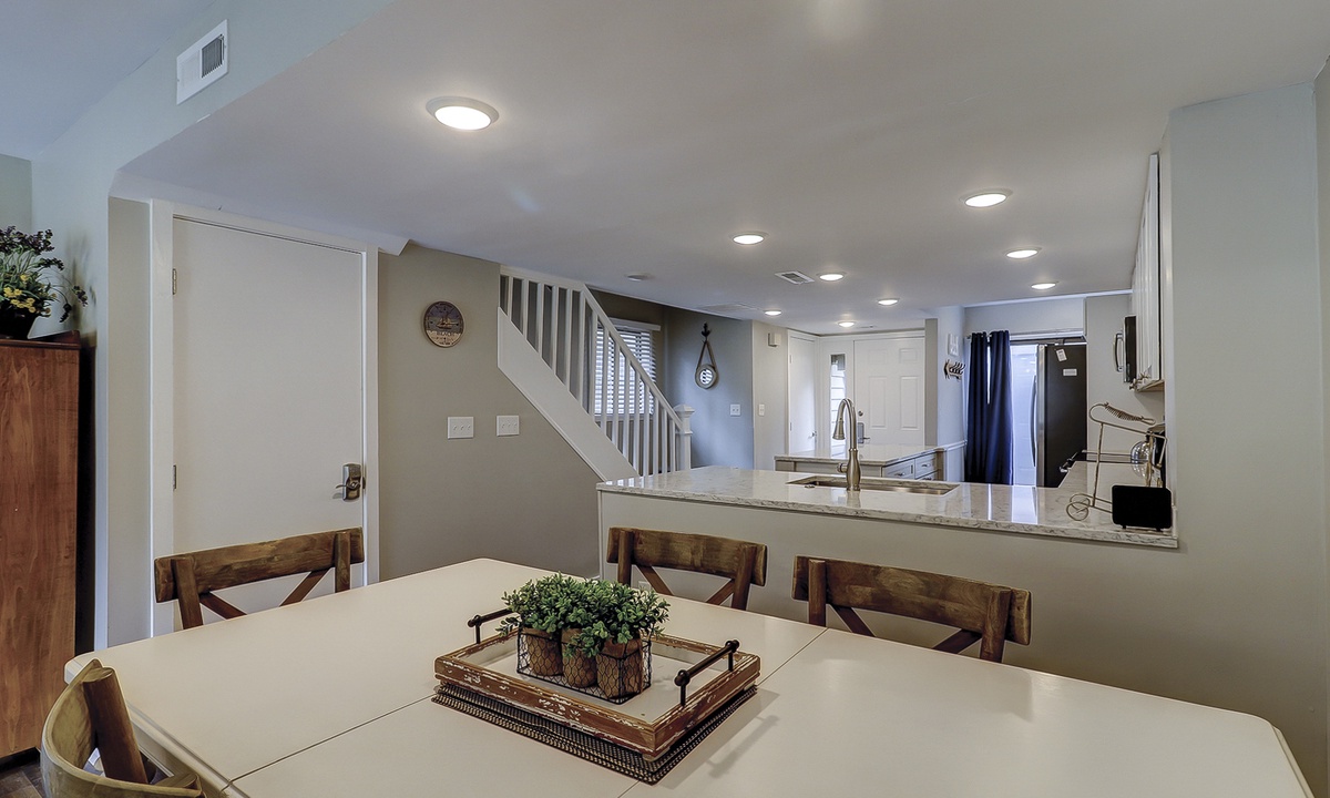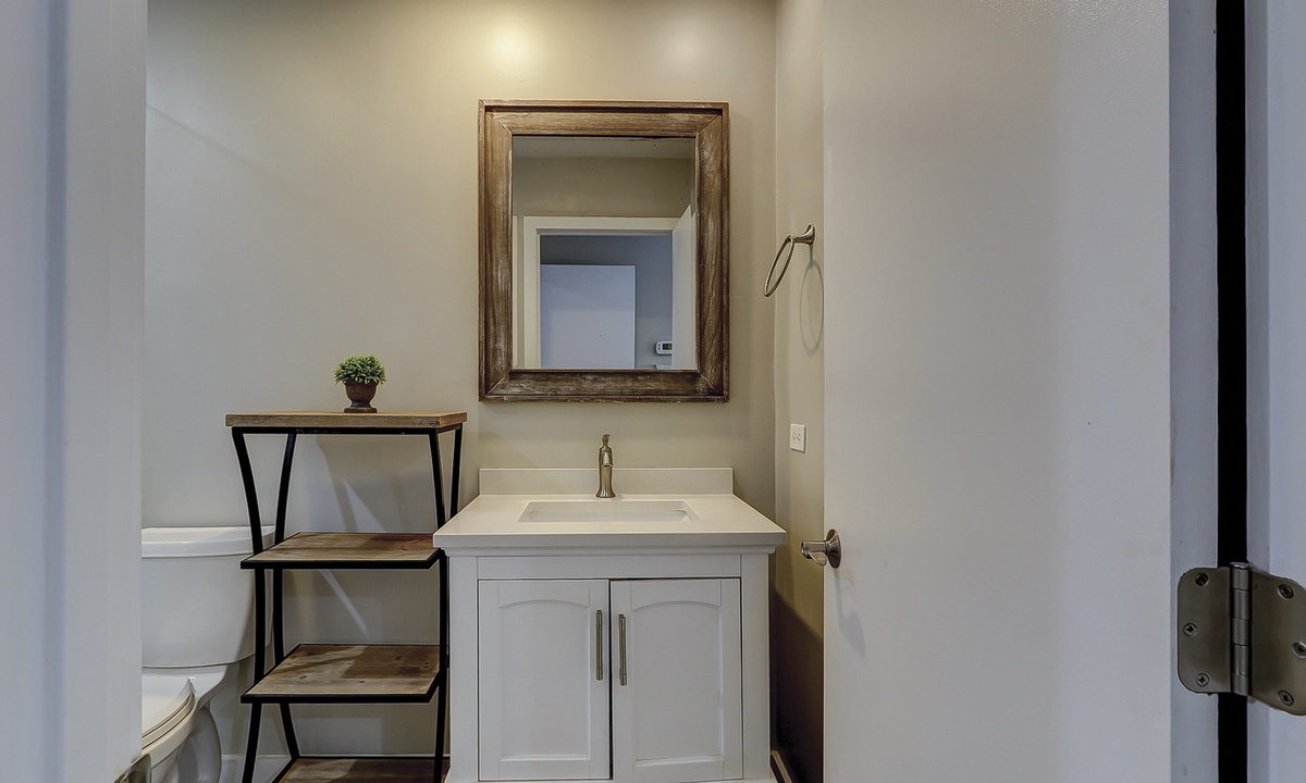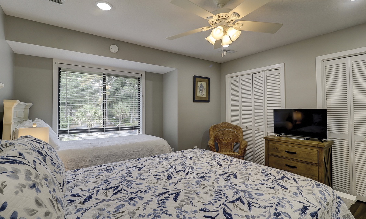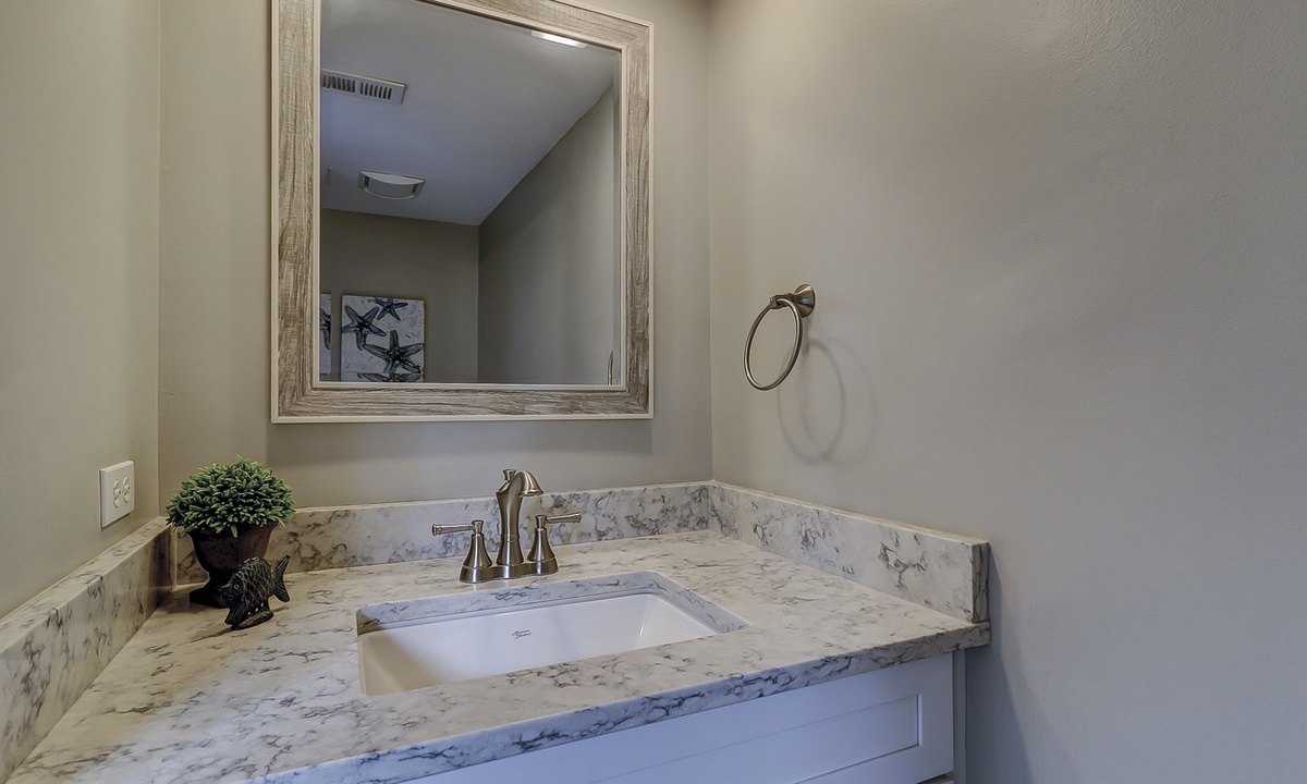 Just down the hall you'll find the guest bedroom with a queen bed and a twin bed, as well as a Smart TV. Guests can access the hall bathroom with a tub/shower combination. A powder room is located on the first floor as well for added convenience.