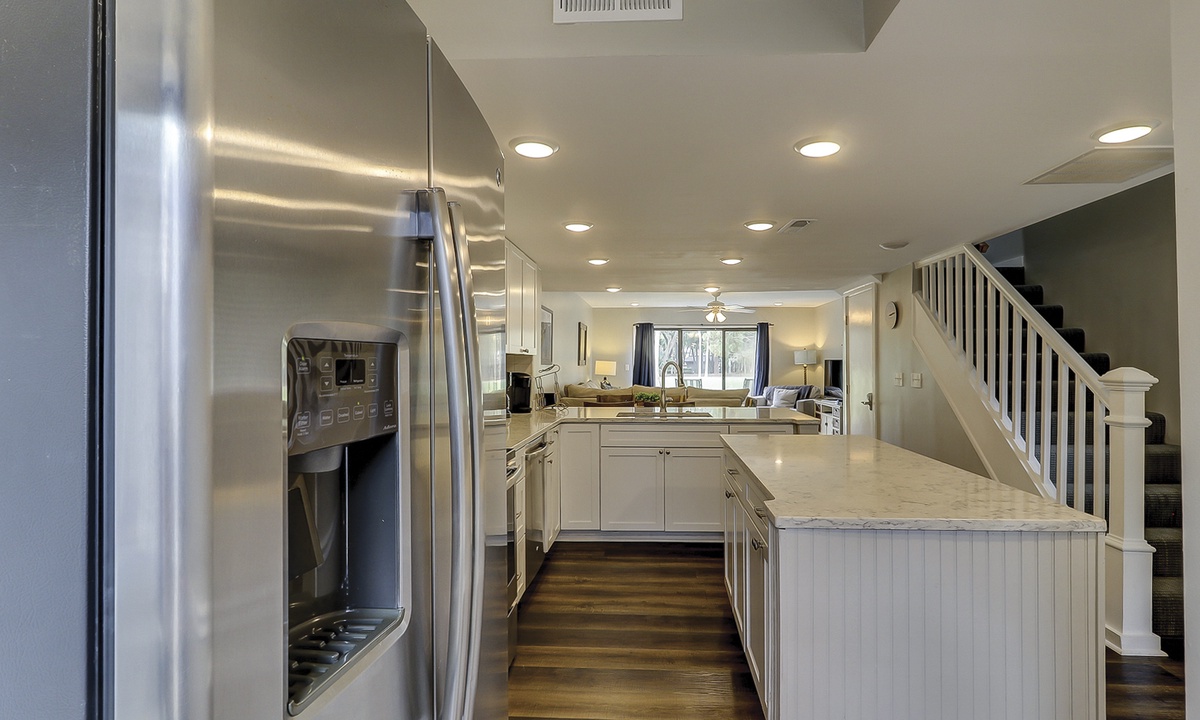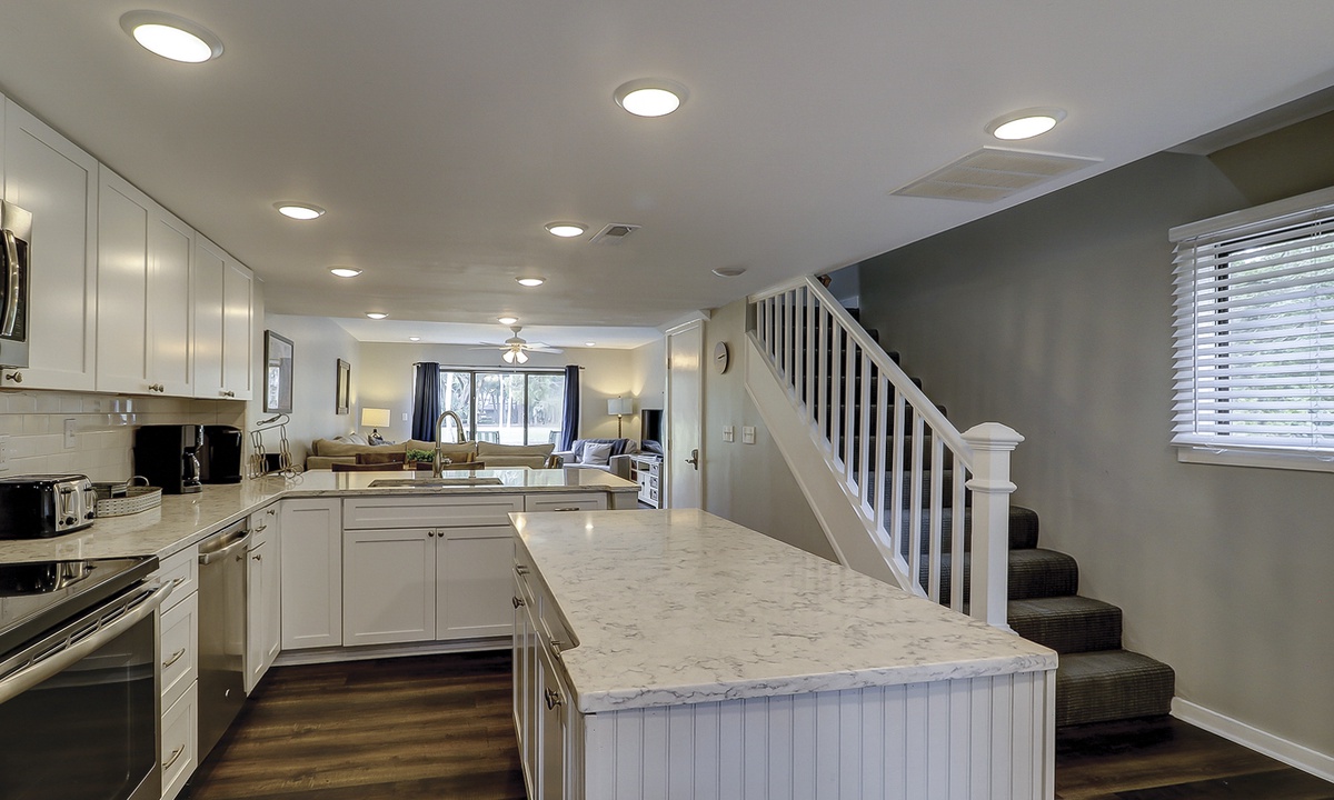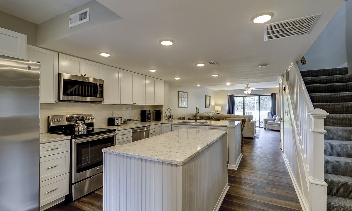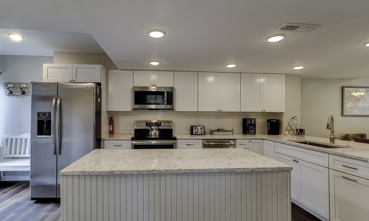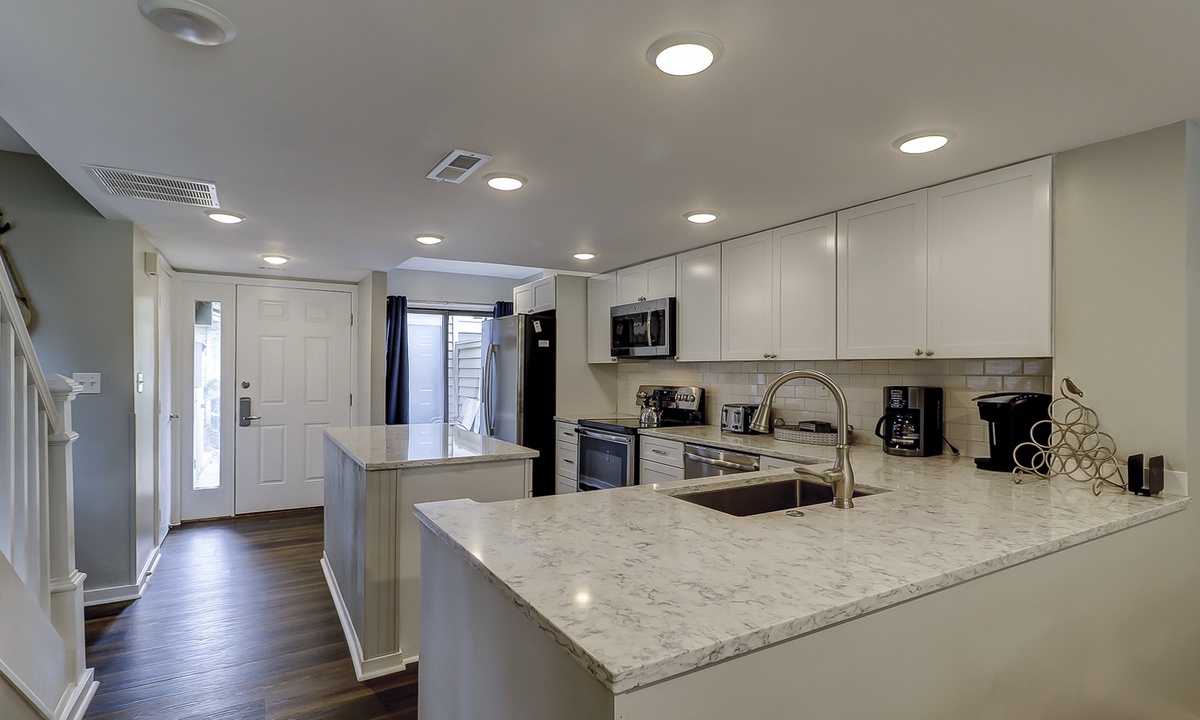 The remodeled kitchen features a large center island, quartz counters, stainless appliances and everything you'll need to cook a meal for your family.