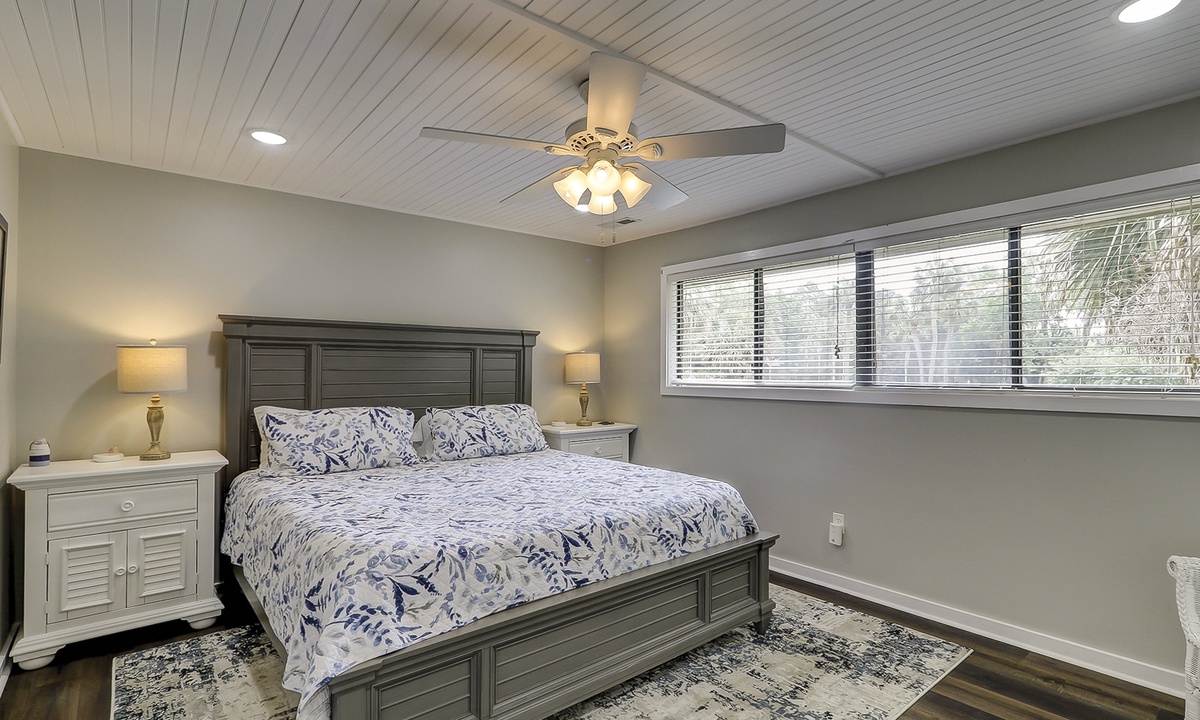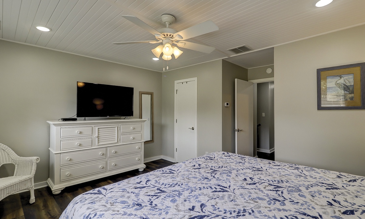 Up the stairs you'll find both bedrooms. The main bedroom features a king bed, Smart TV, large walk-in closet, golf course views and a private bathroom with a large, tiled walk-in shower.