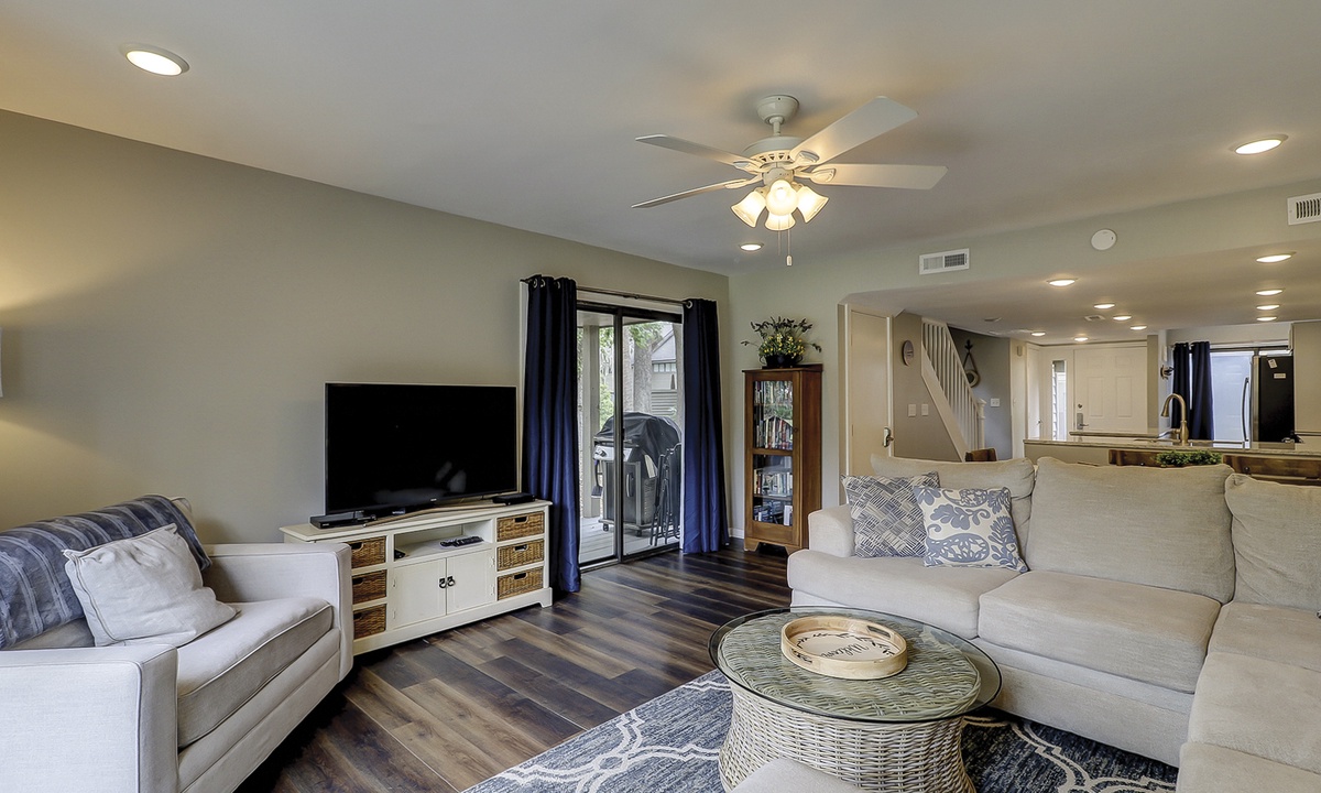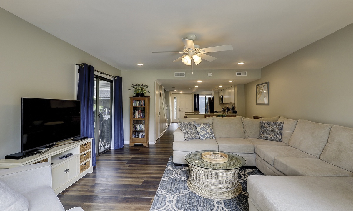 The open concept floor plan features a spacious living area with a sectional sleeper sofa, twin sleeper chair, Smart TV and two sets of sliding doors leading to the wraparound back deck. Views of the golf course can be seen from the living area, dining area and kitchen.