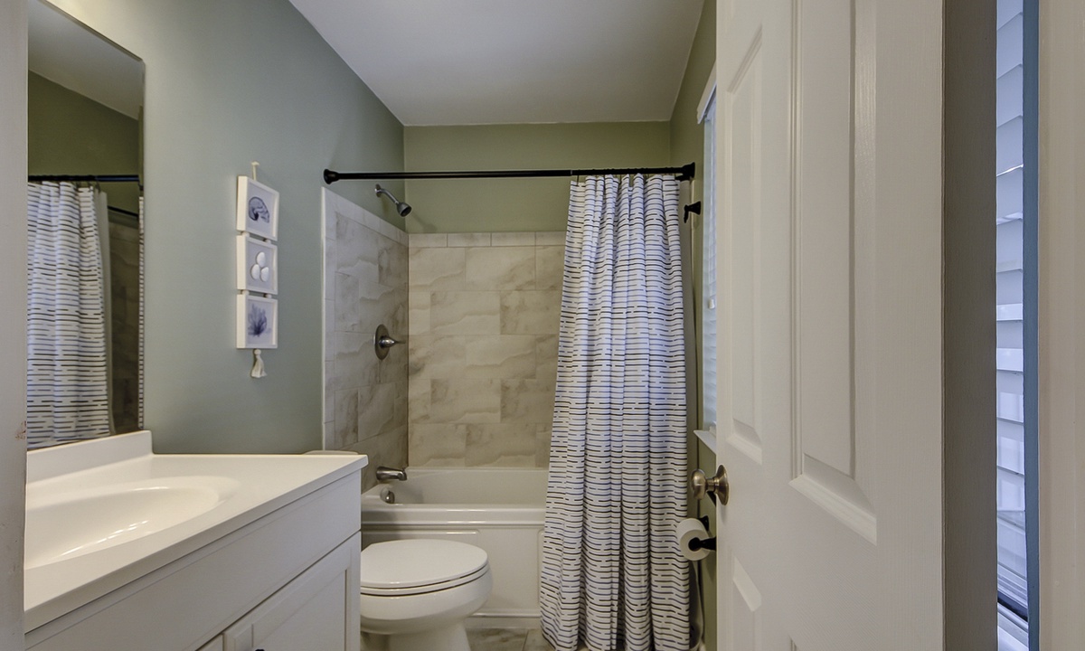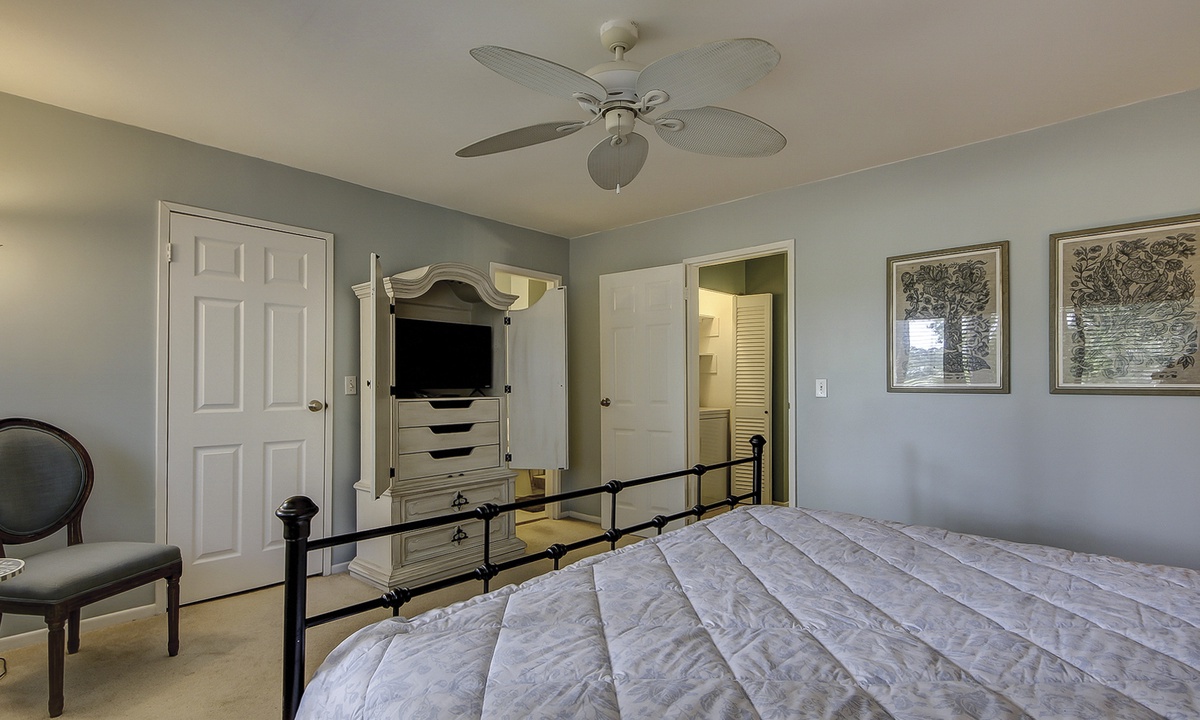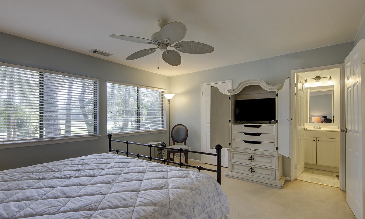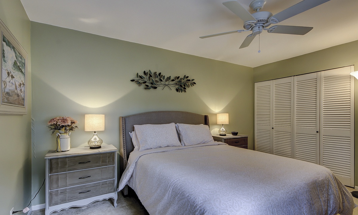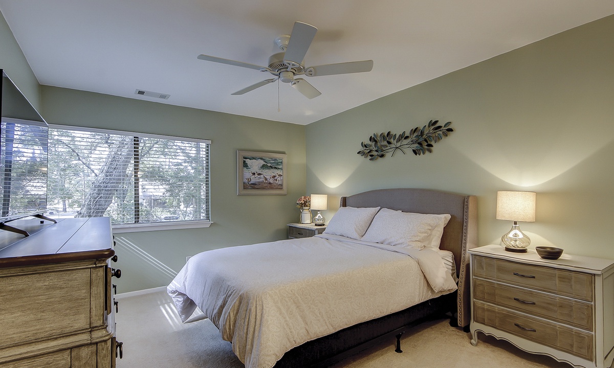 Both bedrooms are located on the 2nd level. The main bedroom features a king bed, golf course views, and a private bathroom with a tiled walk-in shower. The guest bedroom features a queen bed and access to a hall bathroom with a tub/shower combination.