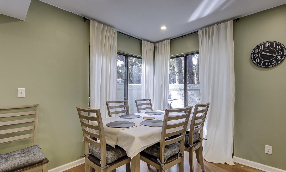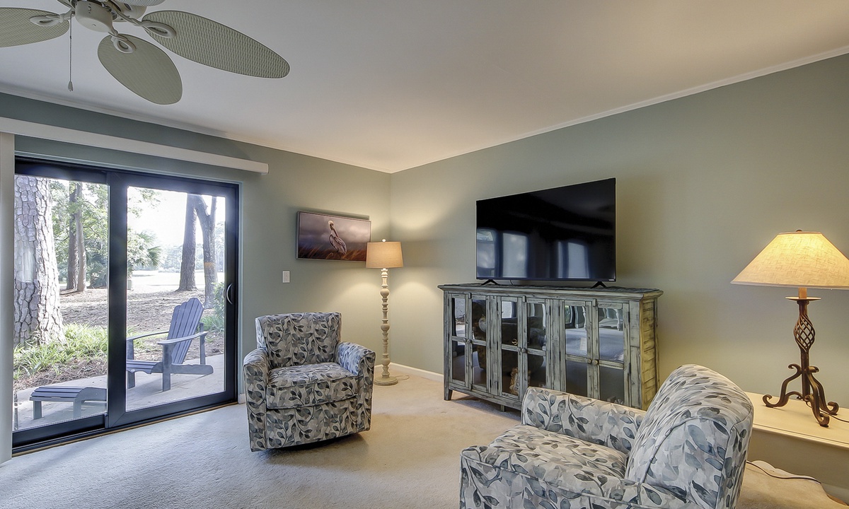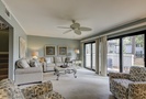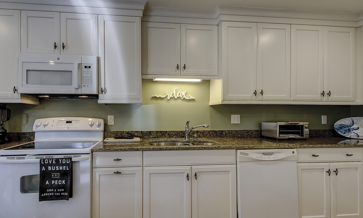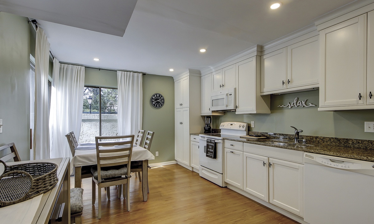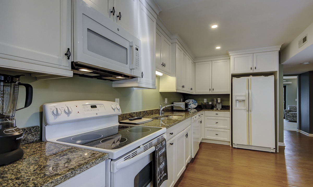 The spacious living area offers two seating areas, a sleeper sofa, large Smart TV and access to the private patio overlooking the golf course. Guests have access to a powder room just off the living area for added convenience. The large, fully equipped kitchen offers granite counters, plenty of cabinet space and a dining area with seating for 6.
