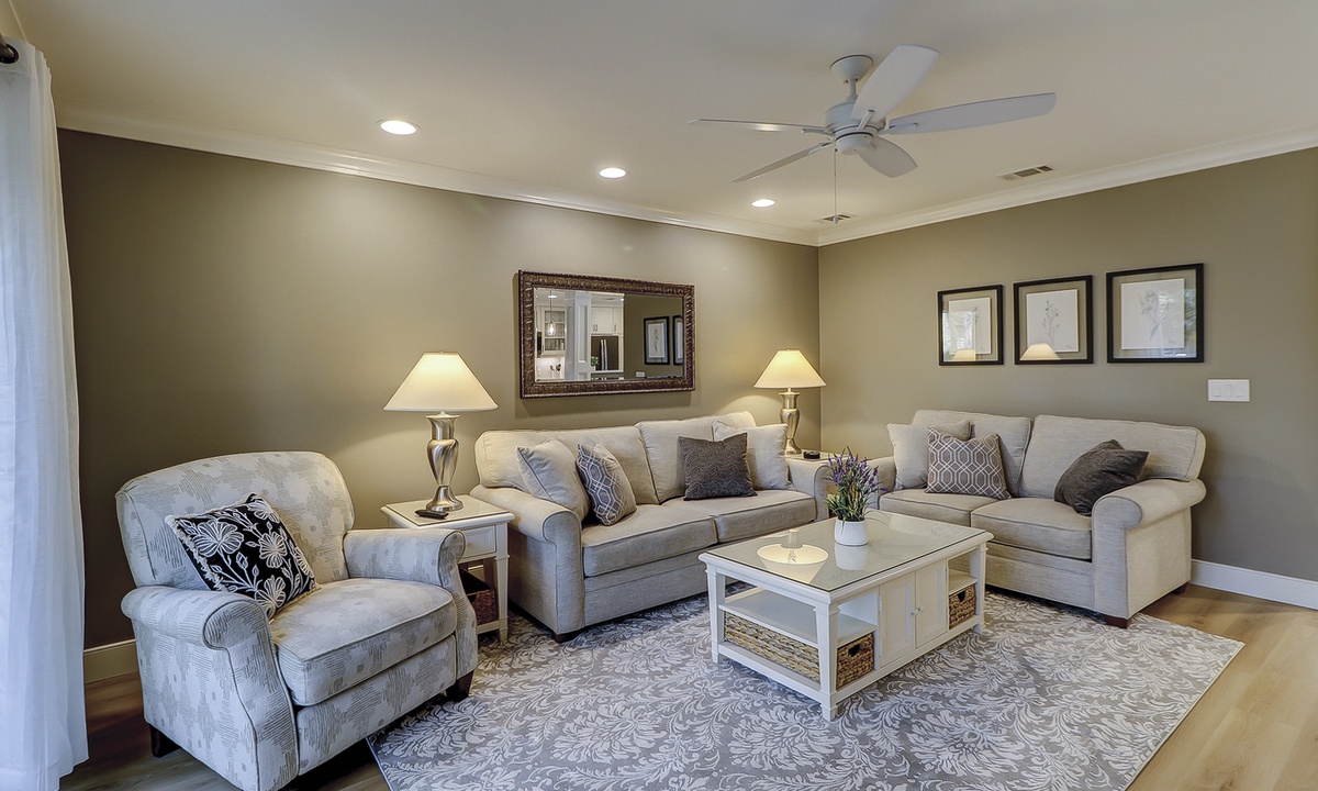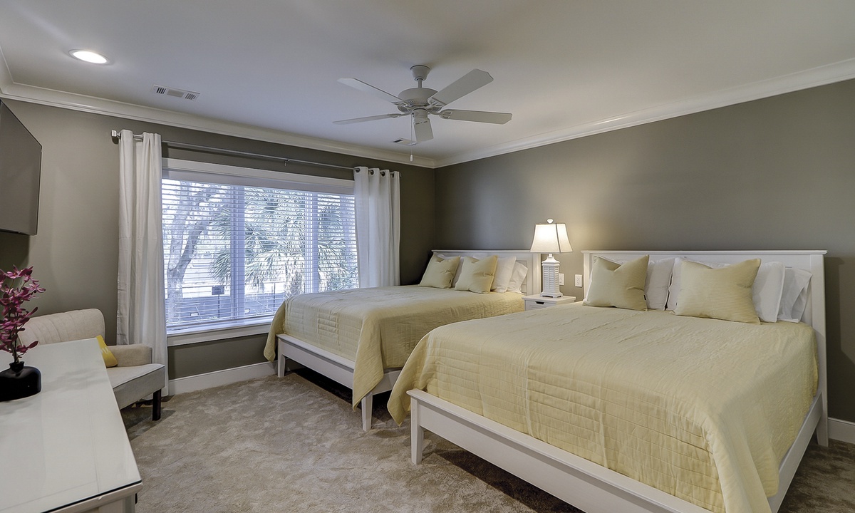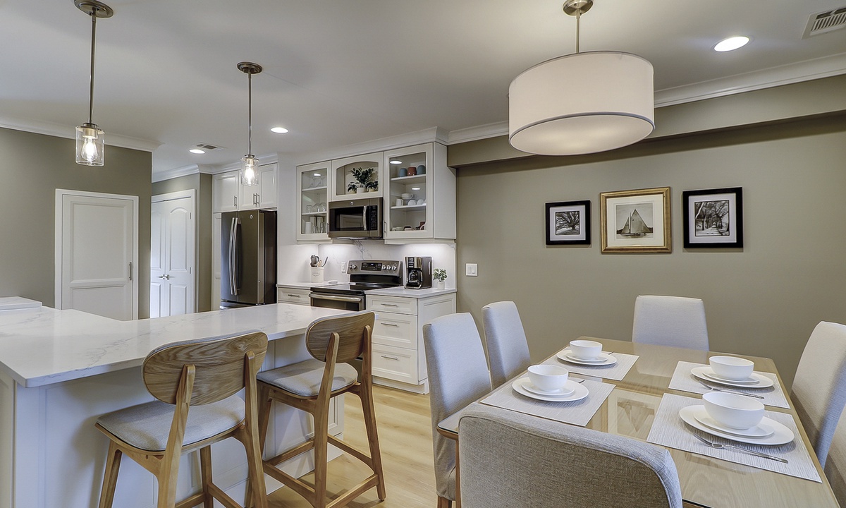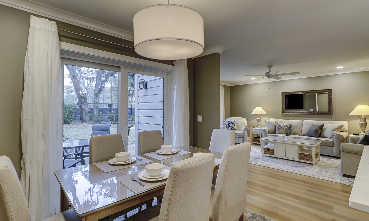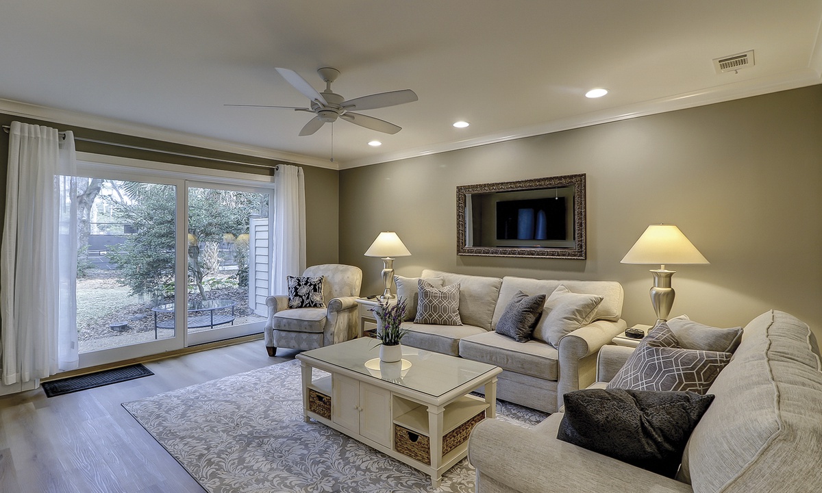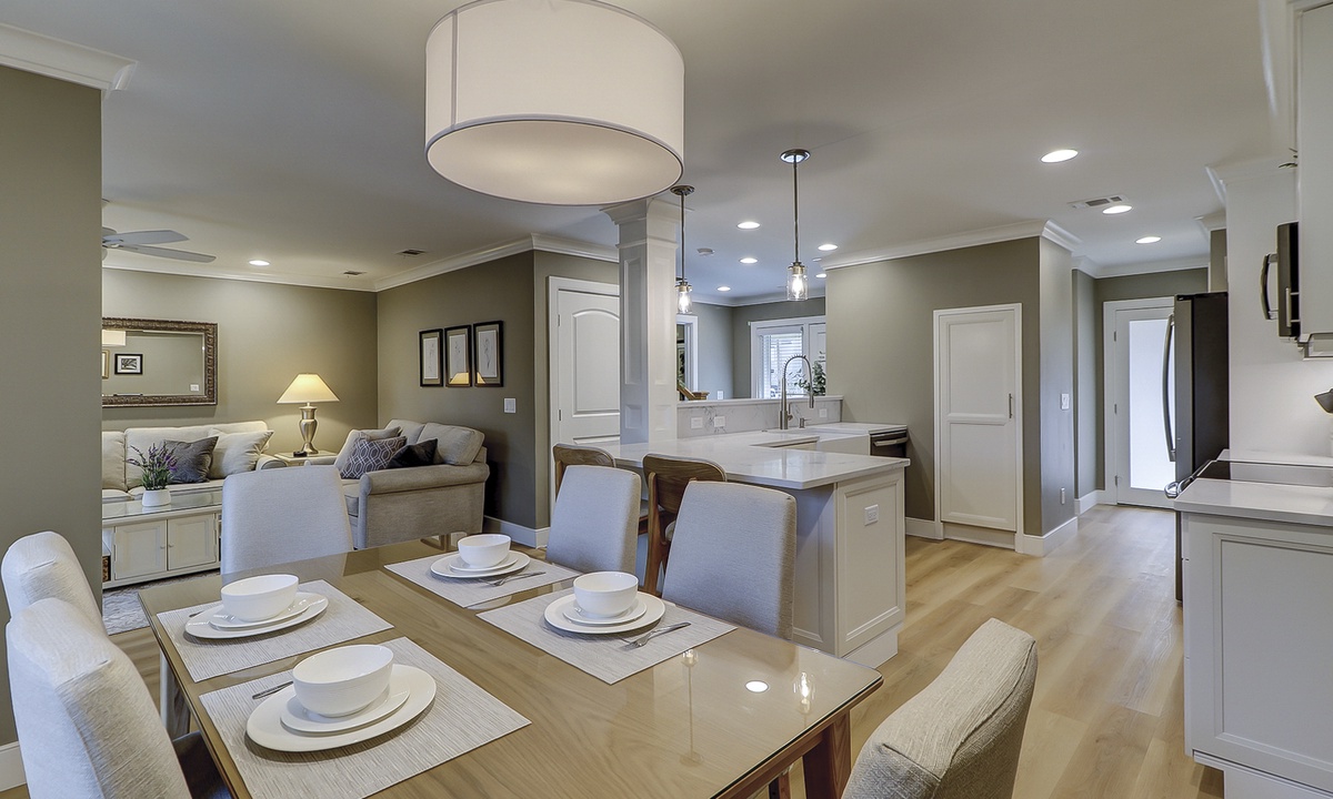The owners of this charming two-story villa have created a luxury vacation rental property with all-new flooring, furniture, décor, HVAC, electrical, plumbing and so much more. The reimagined open-concept floor plan makes it easy for guests to spend time together and allows space to spread out. The living room features brand-new, thoughtfully curated pieces and a 65” smart TV. The dining area features seating for six. The private patios are accessed through sliding doors in the dining and living rooms. Enjoy the patio dining table and grill while watching tennis and pickleball at the renowned Smith Stearns Tennis Academy from the backyard!