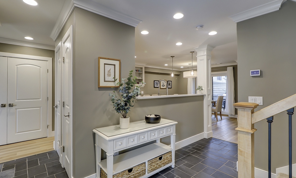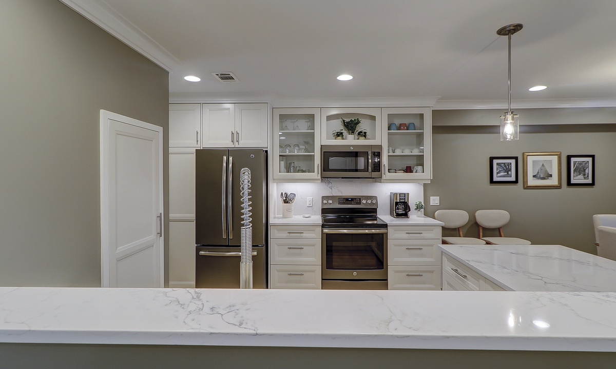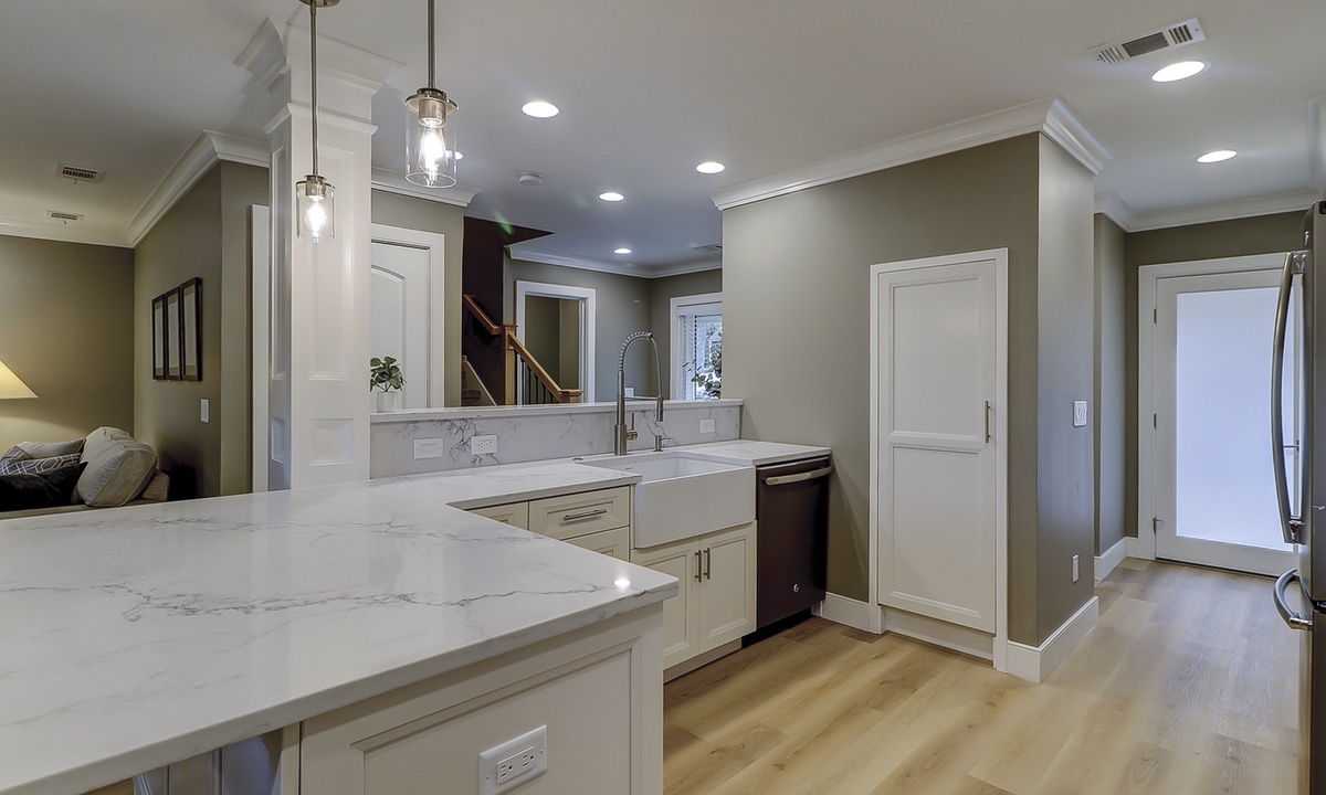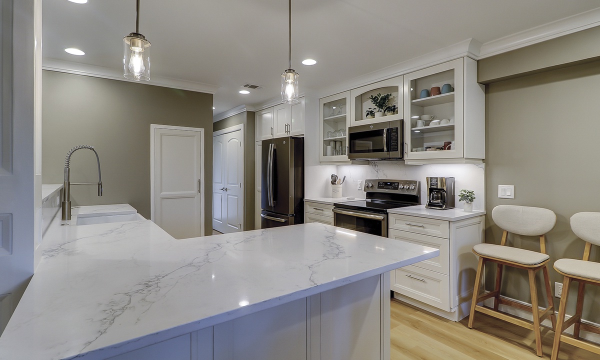Fully open to the living and dining rooms, the kitchen features quartz countertops and backsplashes, stainless steel appliances, custom cabinets and everything you need to make meals for your family.