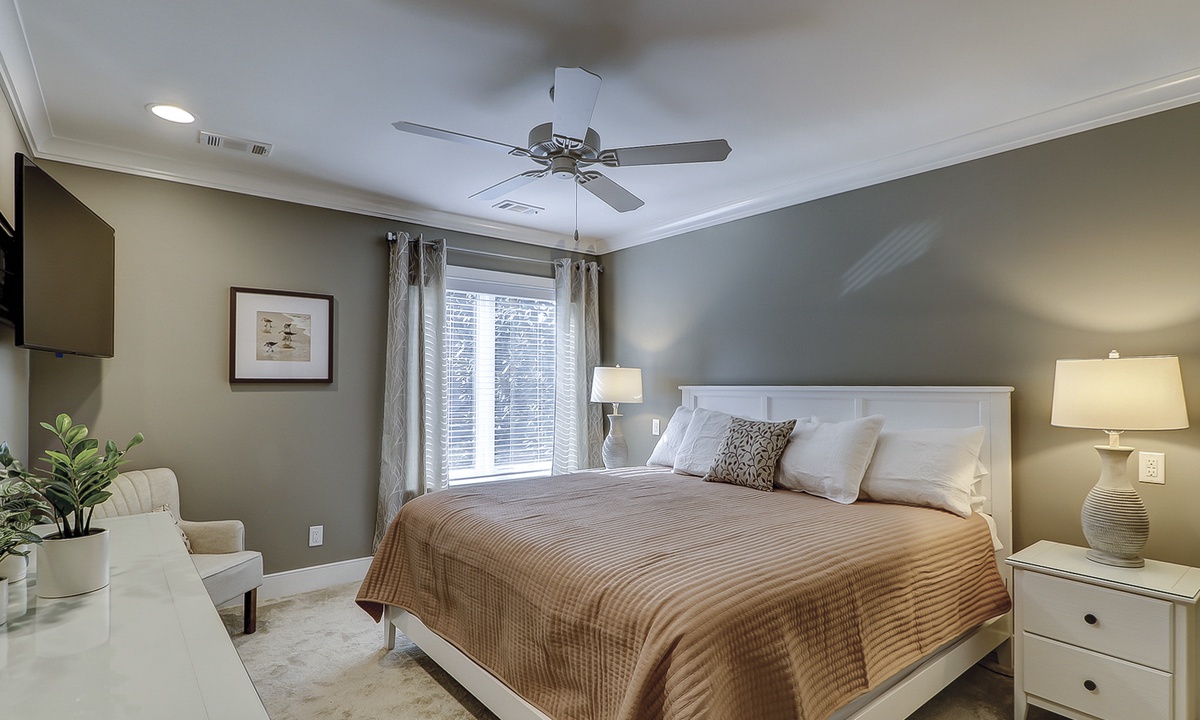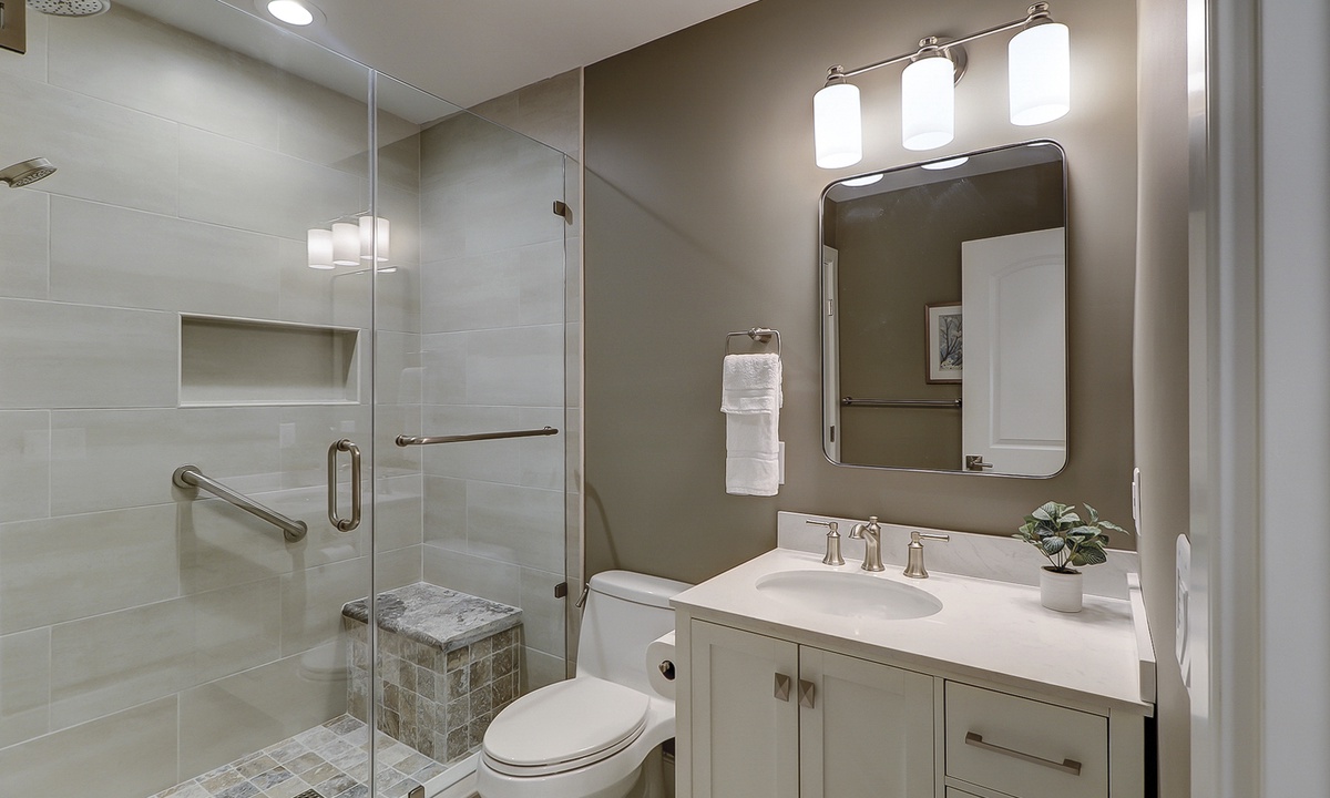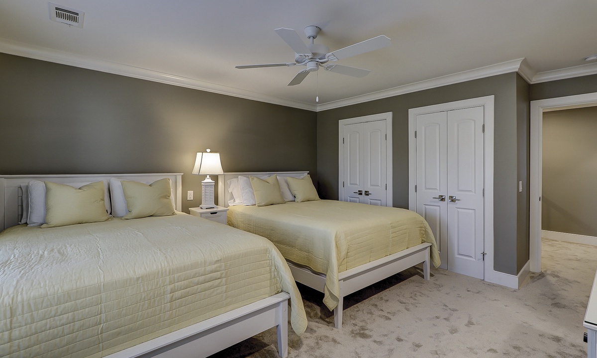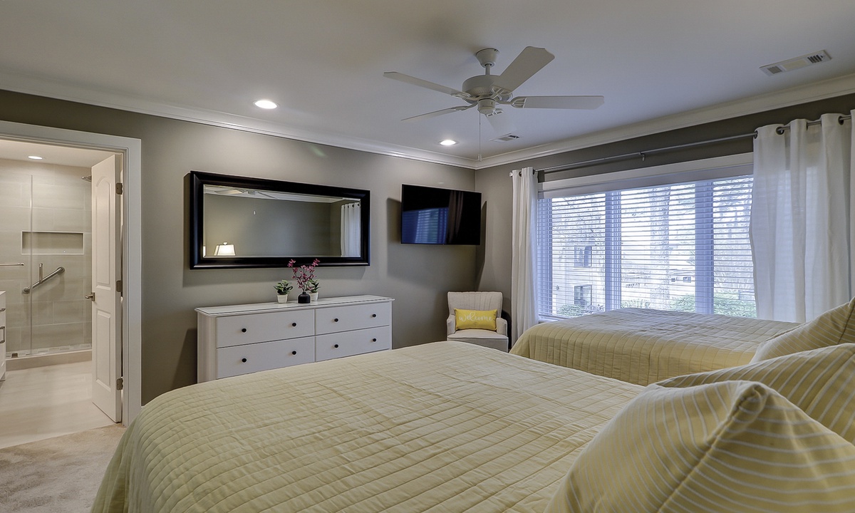 Guests benefit from added storage space and a powder room on the lower level as well as a washer and dryer area. Both bedrooms with en-suite bathrooms are located on the upper level. Each fully appointed bedroom has new bedding and decor. The primary bedroom has a king bed and a wall-hung 50” smart TV. The en-suite features a beautifully tiled walk-in rain shower with a hand-held sprayer and bench seating. The guest bedroom has two queen beds and a wall-hung 50” smart TV. The en-suite features a beautifully tiled walk-in rain shower with a hand-held sprayer and bench seating, double vanity and a separate toilet closet.