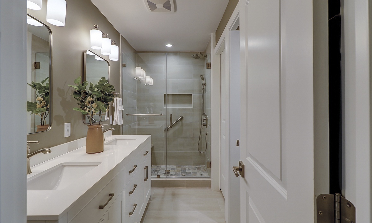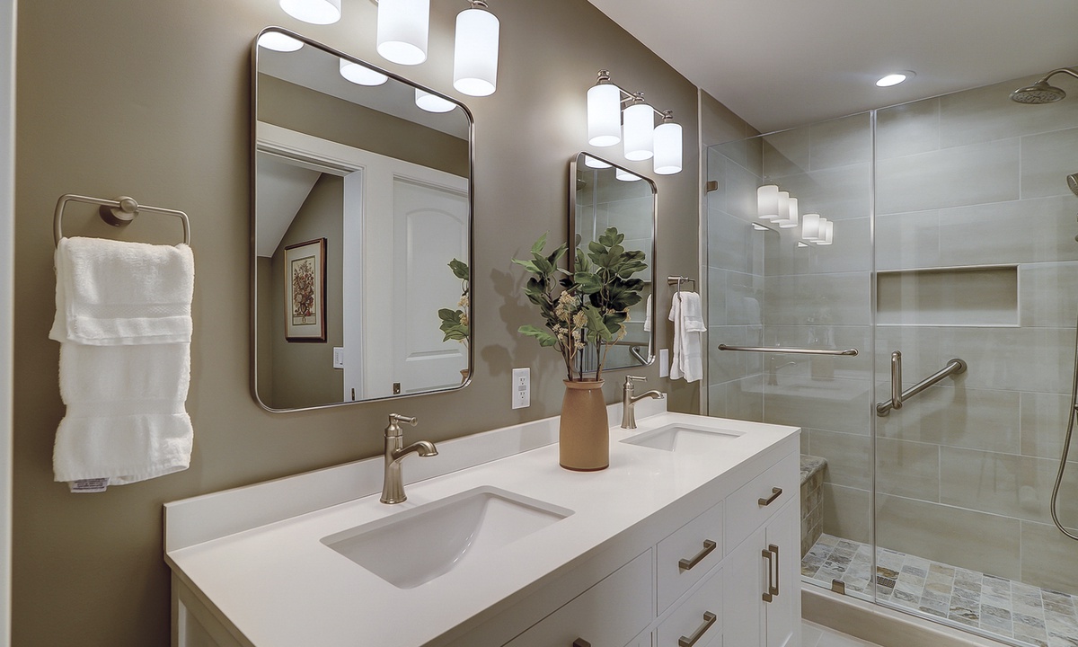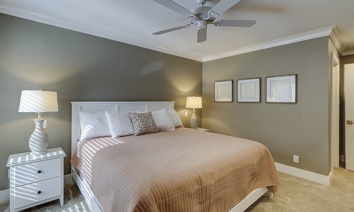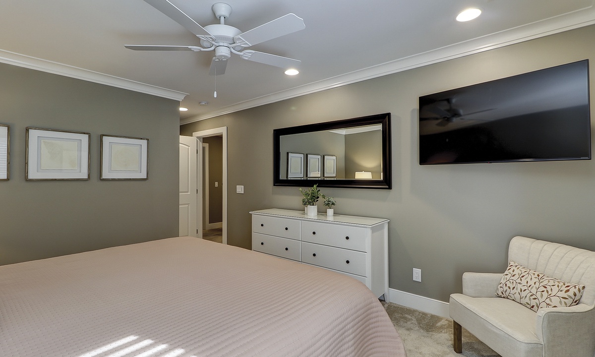 Guests benefit from added storage space and a powder room on the lower level as well as a washer and dryer area. Both bedrooms with en-suite bathrooms are located on the upper level. Each fully appointed bedroom has new bedding and decor. The primary bedroom has a king bed and a wall-hung 50” smart TV. The en-suite features a beautifully tiled walk-in rain shower with a hand-held sprayer and bench seating. The guest bedroom has two queen beds and a wall-hung 50” smart TV. The en-suite features a beautifully tiled walk-in rain shower with a hand-held sprayer and bench seating, double vanity and a separate toilet closet.