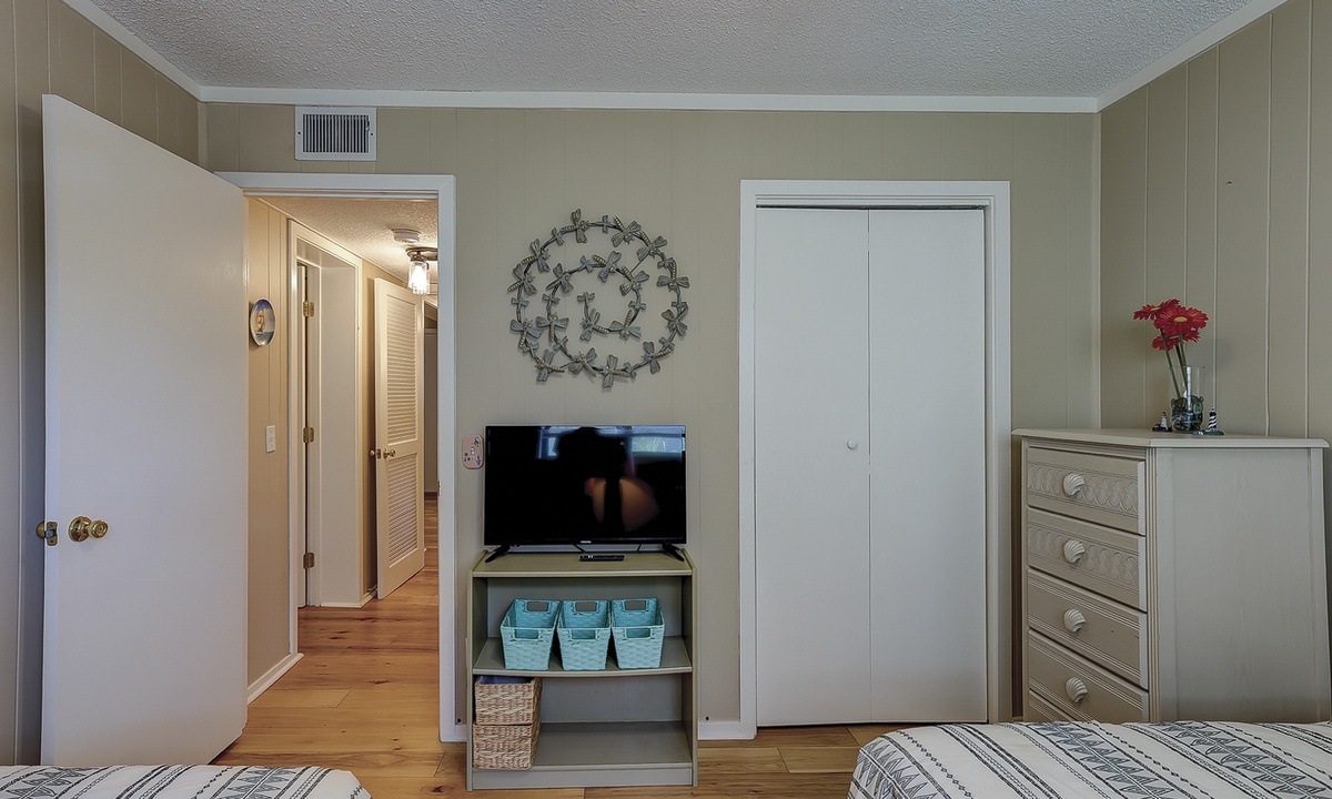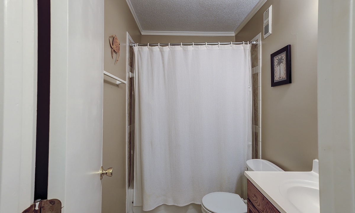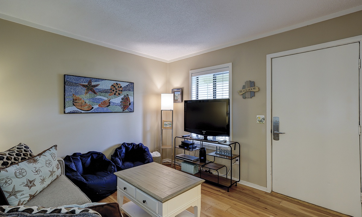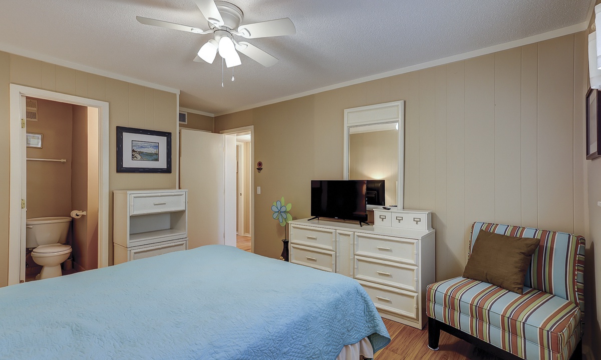 The main bedroom features a queen bed with a Smart TV, as well as a private bathroom with a tub/shower combination. The guest bedroom has a full bed and a twin bed, as well as a Smart TV. This room has access to a hall bathroom with a tub/shower combination.
