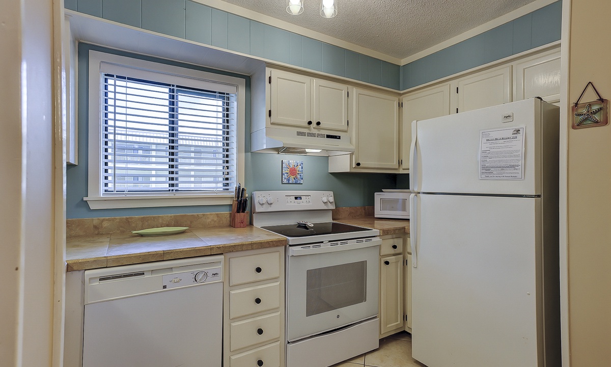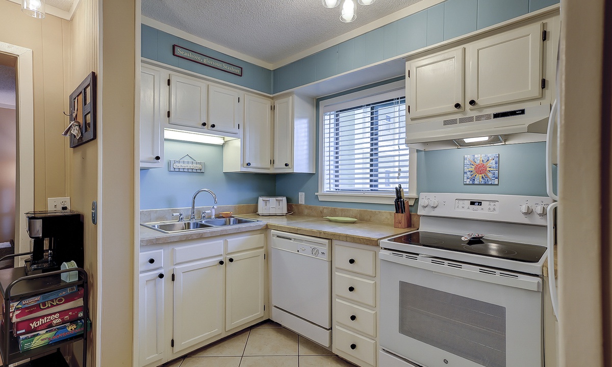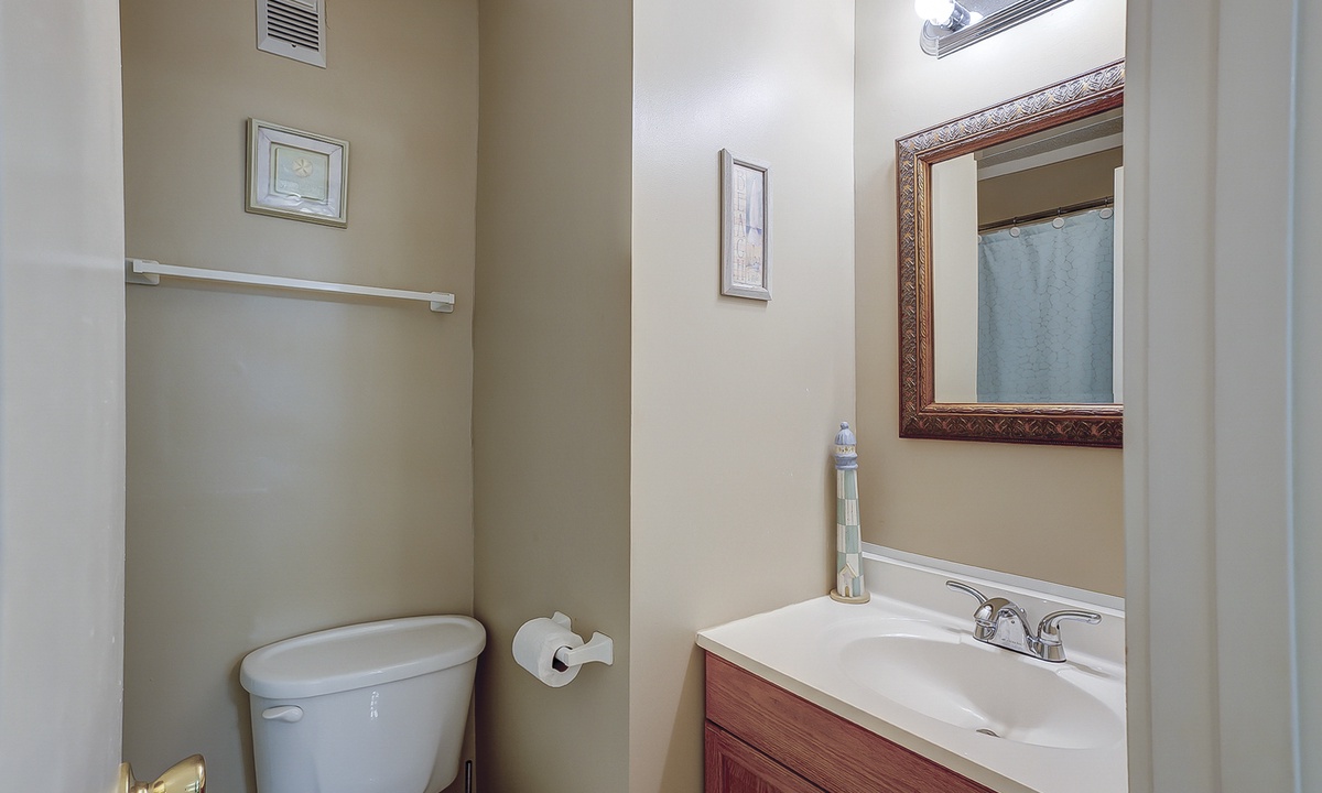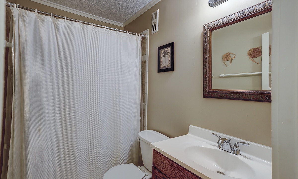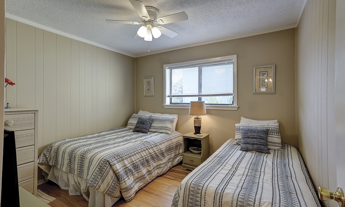 The main bedroom features a queen bed with a Smart TV, as well as a private bathroom with a tub/shower combination. The guest bedroom has a full bed and a twin bed, as well as a Smart TV. This room has access to a hall bathroom with a tub/shower combination.