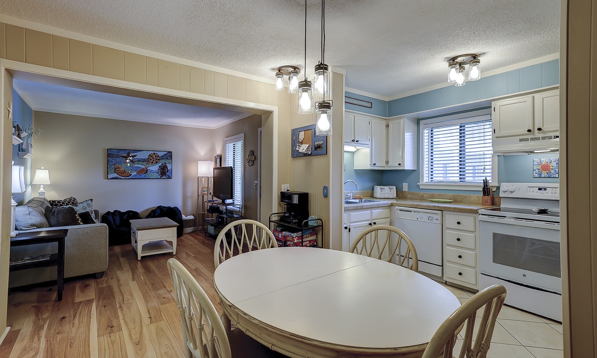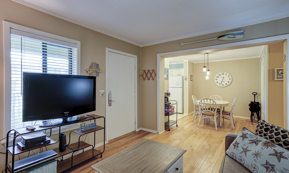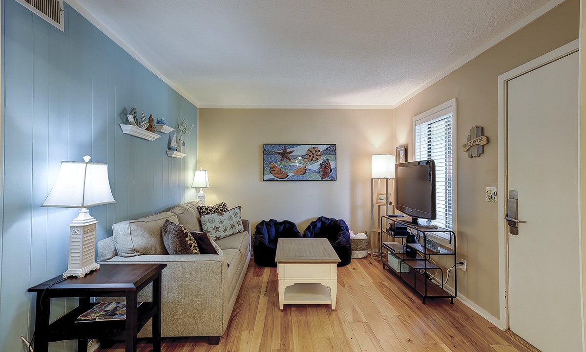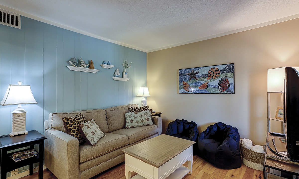 This lovely 2 bedroom, 2 bathroom Hilton Head Resorts condo rental is just steps from the beach! The open concept floor plan has hardwood and tile flooring and bead-board walls throughout. The living area features new furniture, including a sleeper sofa, and flat screen TV. The dining area features seating for 4, and the well-equipped kitchen has everything you'll need to prepare meals for your guests.