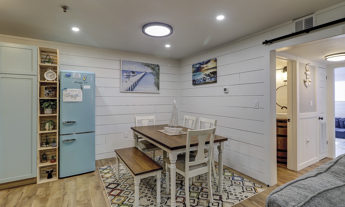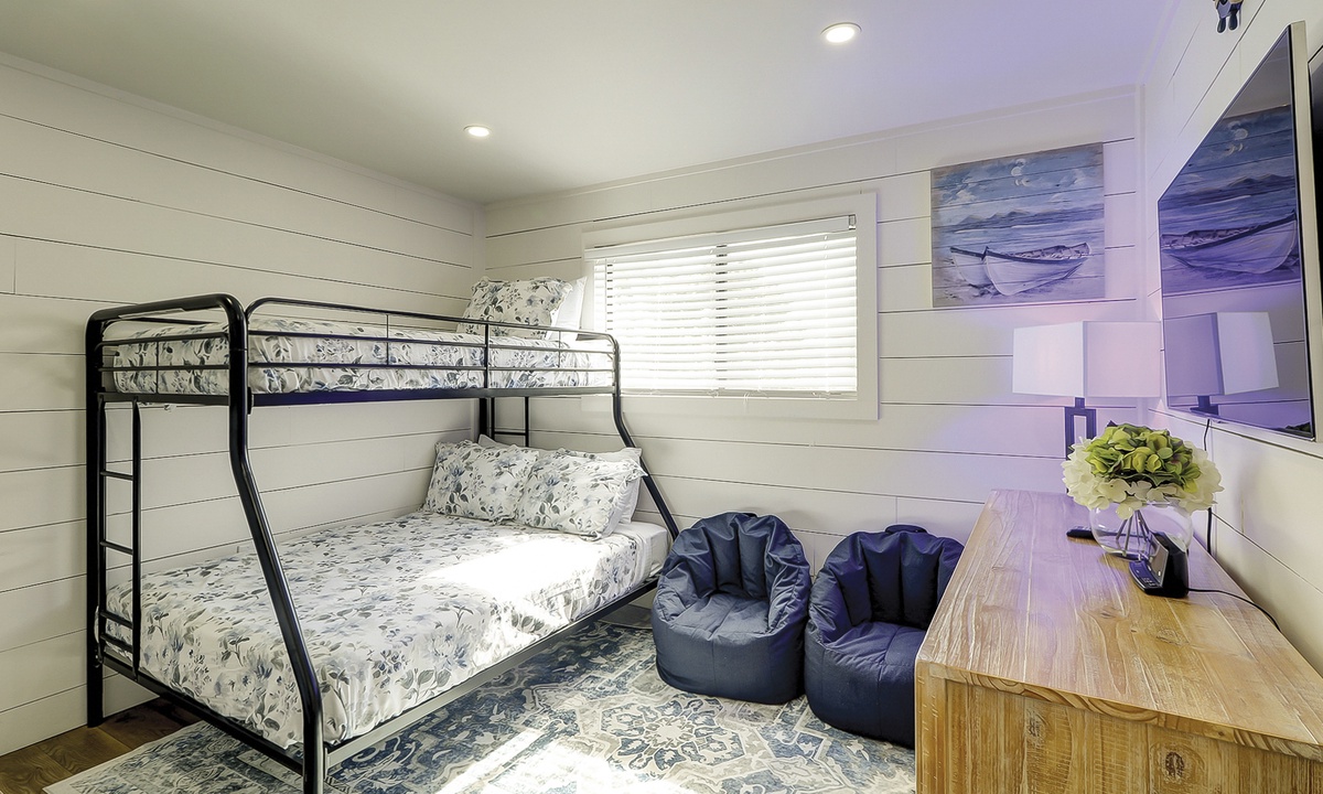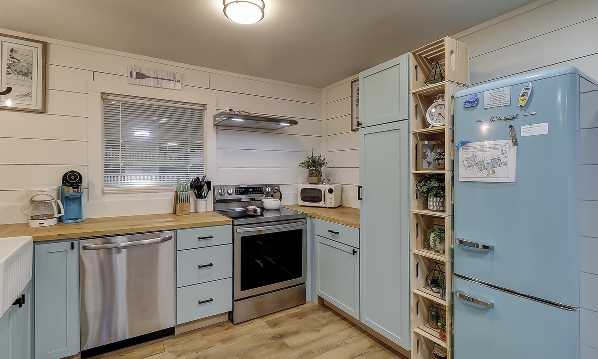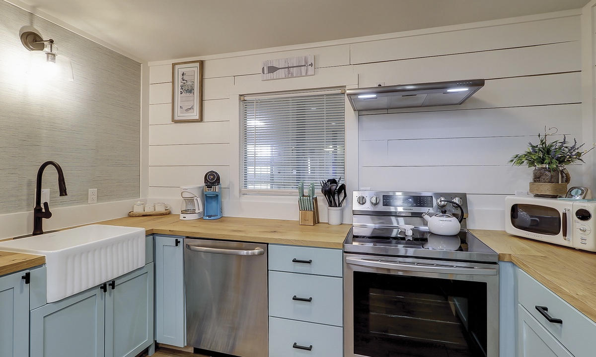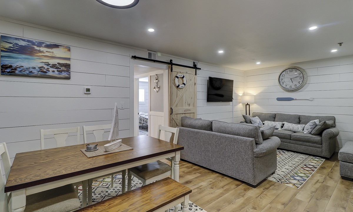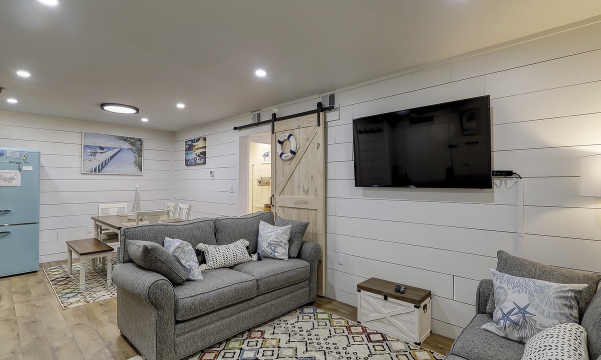 Gorgeous laminate flooring and shiplap walls span the entire property. The open concept living area features a comfortable queen sleeper sofa, love seat and ottoman with treasury chest filled with fun games for families to enjoy and a wall-mounted flat screen. Both bedrooms also have flat screen TVs. The coastal inspired kitchen features custom cabinetry, stainless appliances and a dining table with seating for 6.