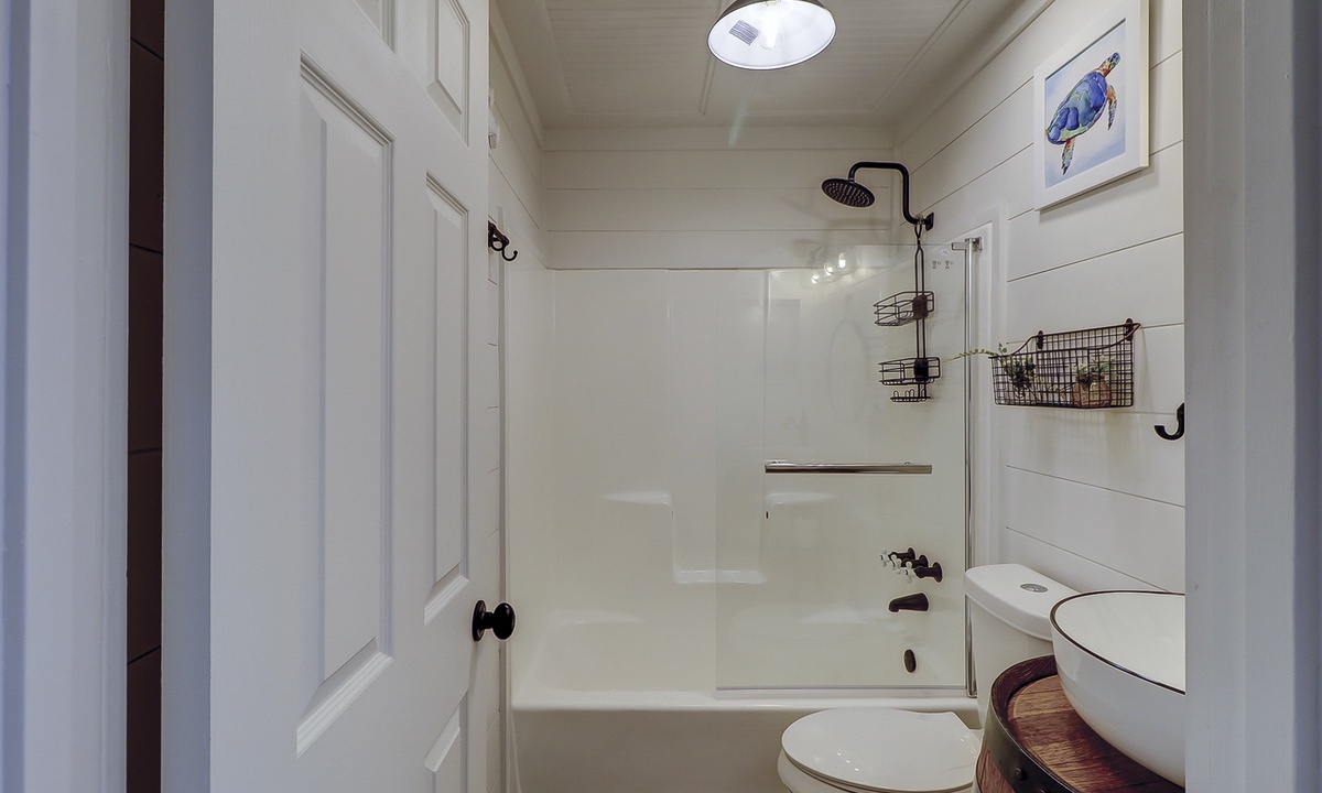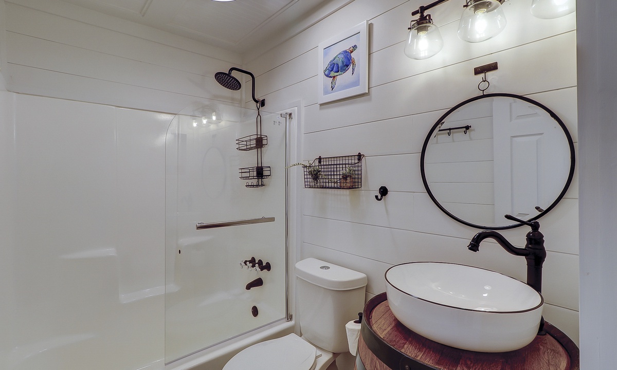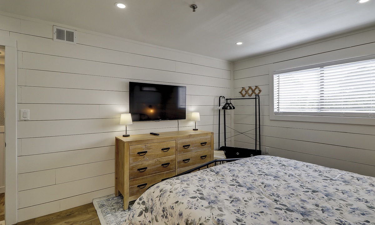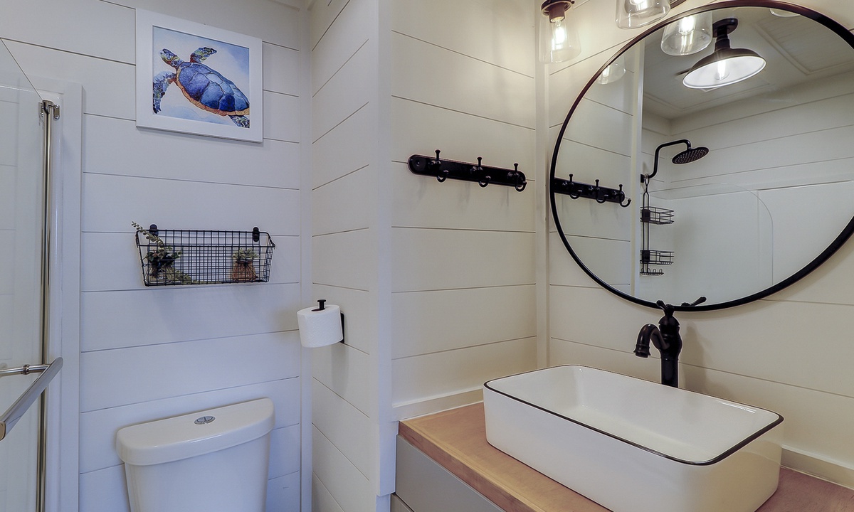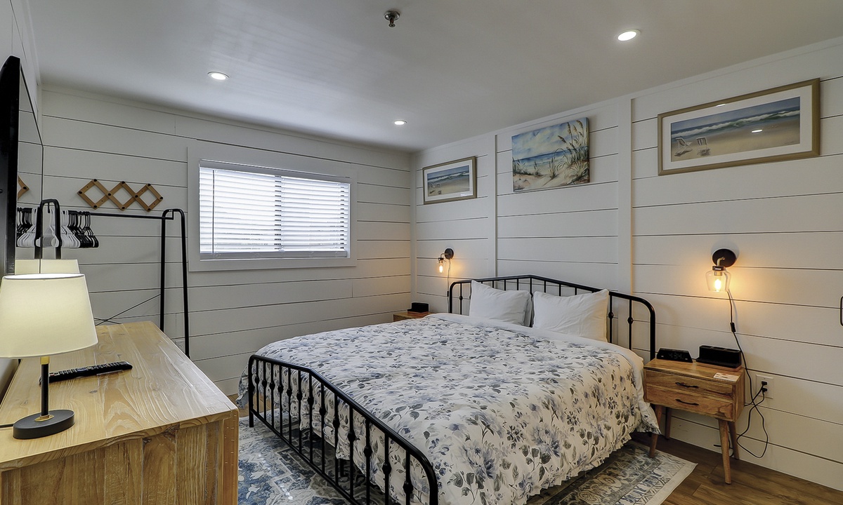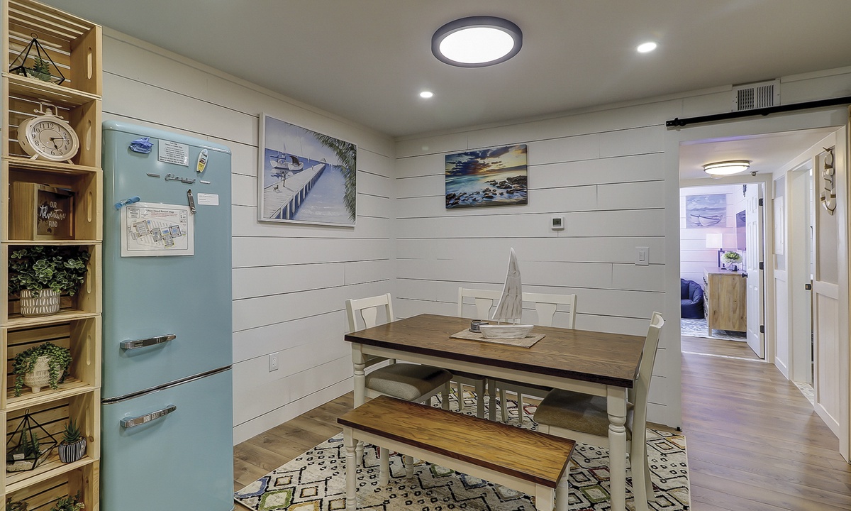 Gorgeous laminate flooring and shiplap walls span the entire property. The open concept living area features a comfortable queen sleeper sofa, love seat and ottoman with treasury chest filled with fun games for families to enjoy and a wall-mounted flat screen. Both bedrooms also have flat screen TVs. The coastal inspired kitchen features custom cabinetry, stainless appliances and a dining table with seating for 6.