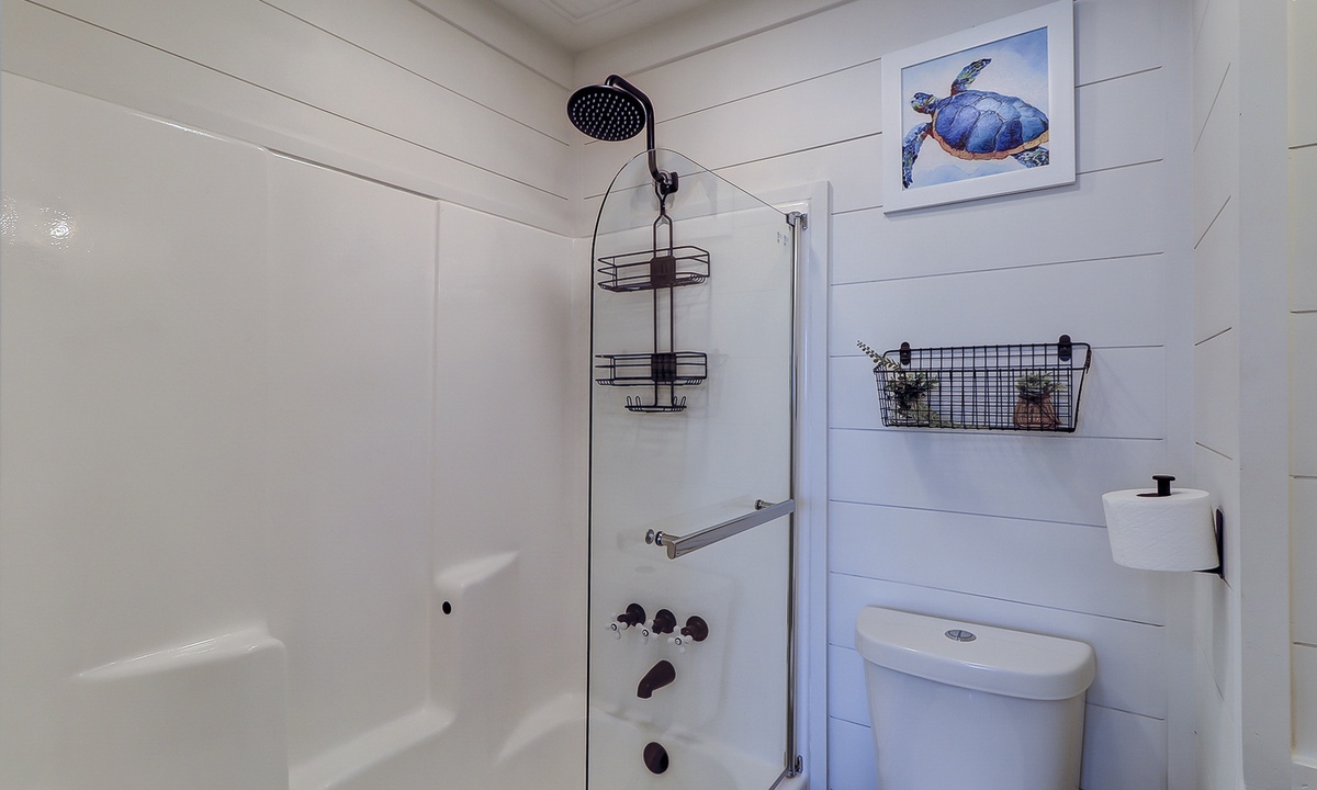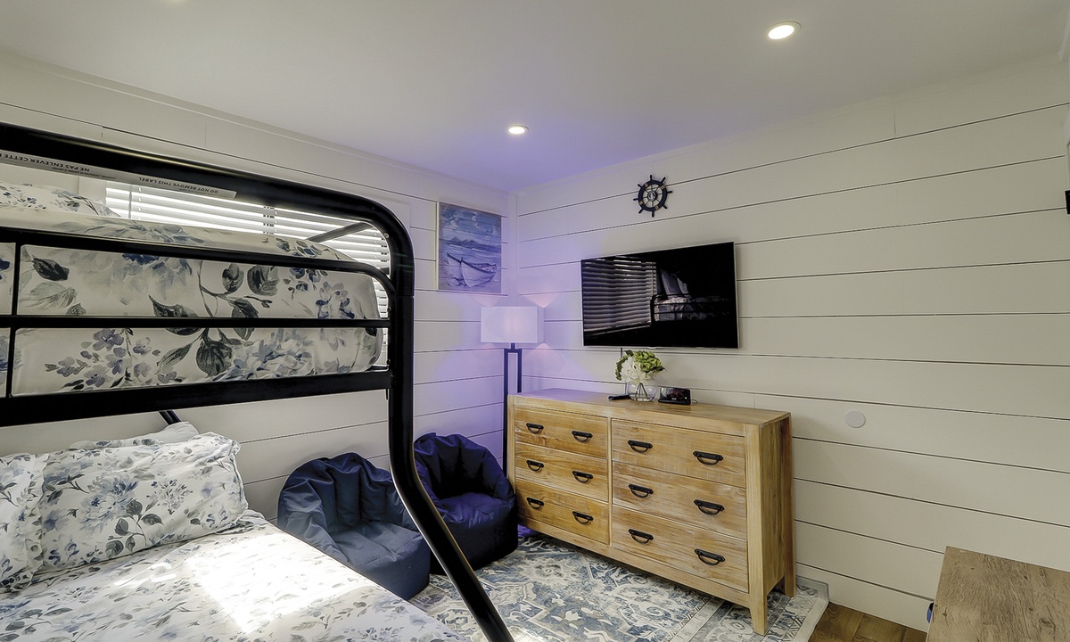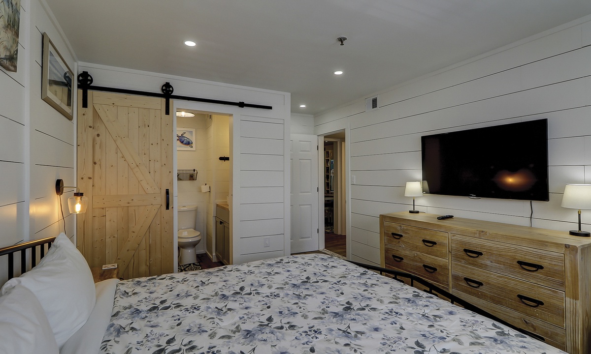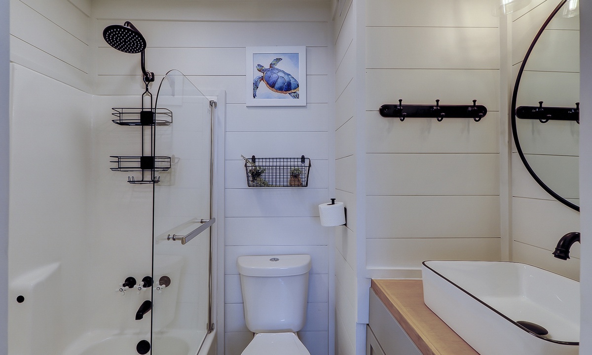 The main bedroom features a king bed, flat screen TV and a beautiful, private bathroom with a tub/shower combination. The guest bedroom features a bunk bed with a full bunk on the bottom and a twin on the top, flat screen TV and access to a hall bathroom with a tub/shower combination.