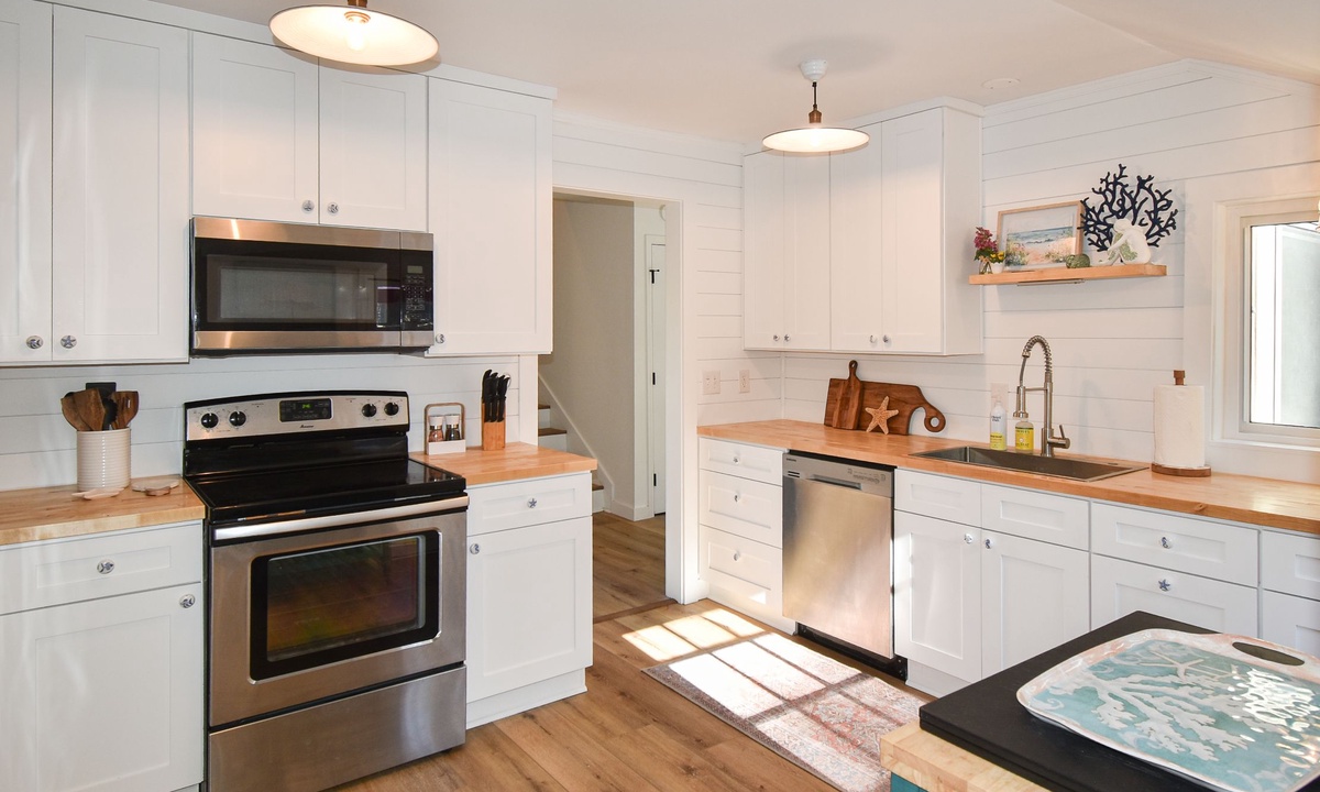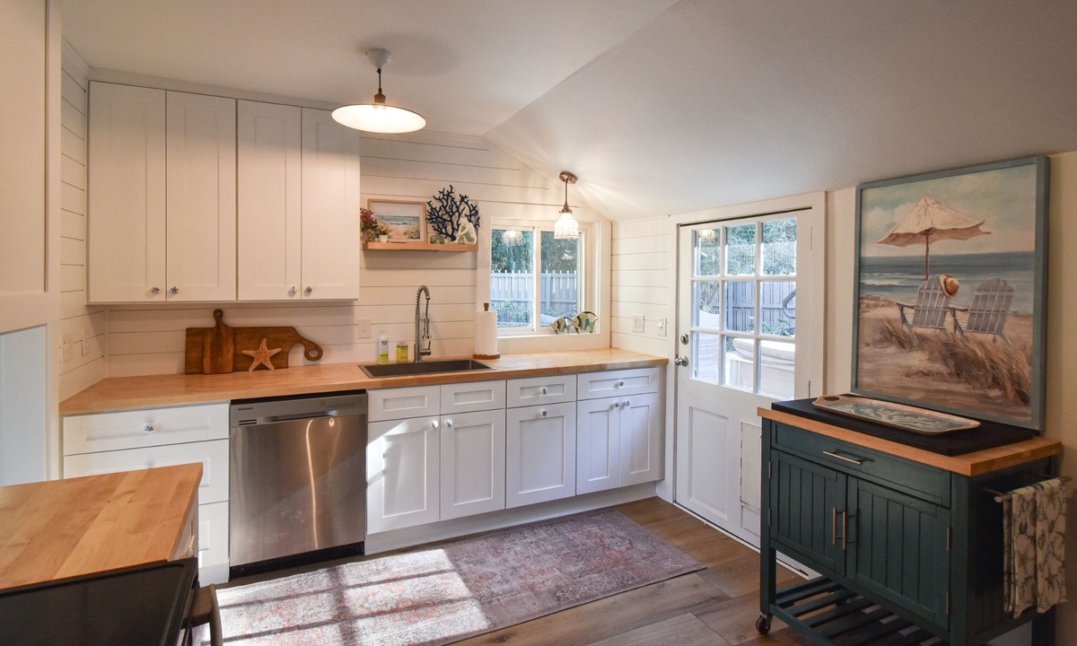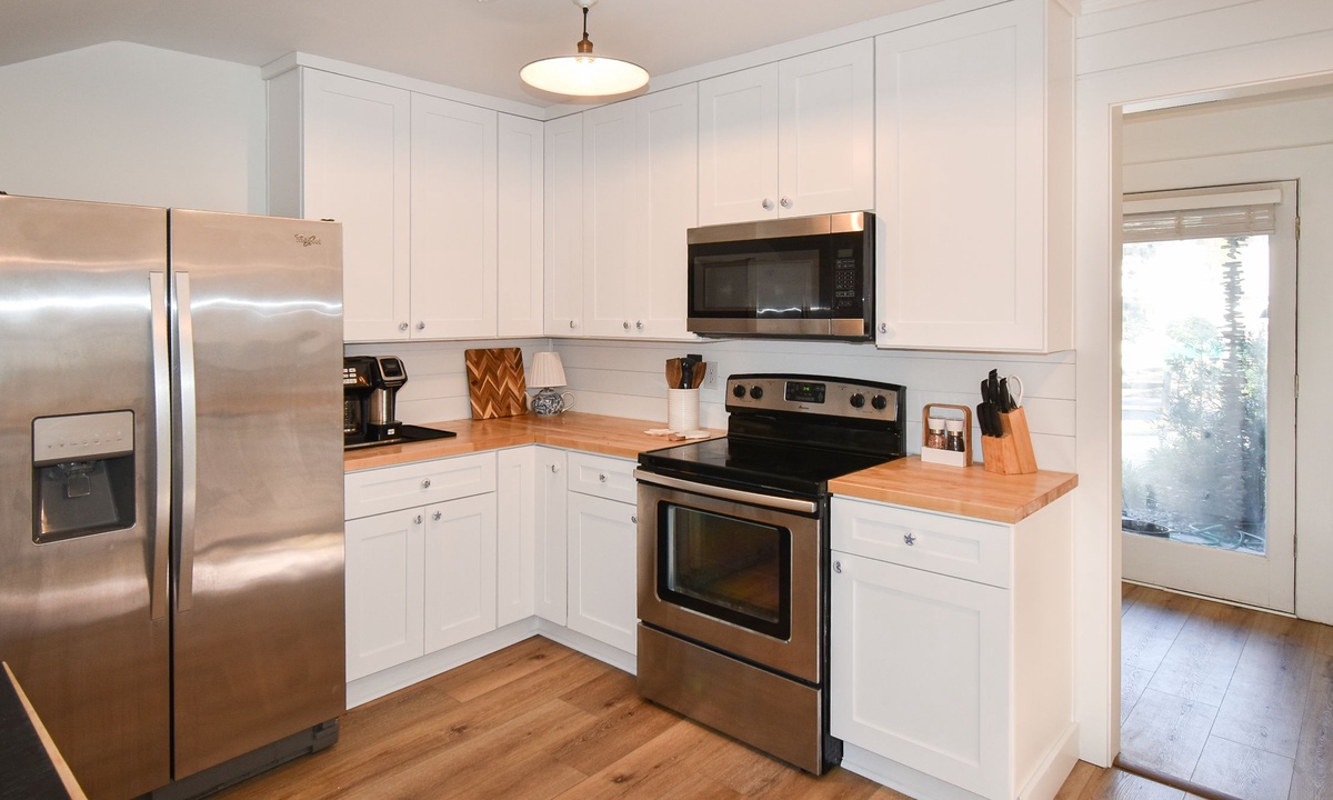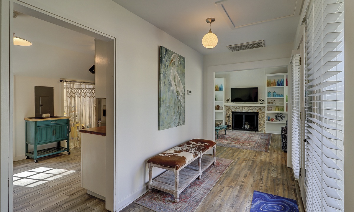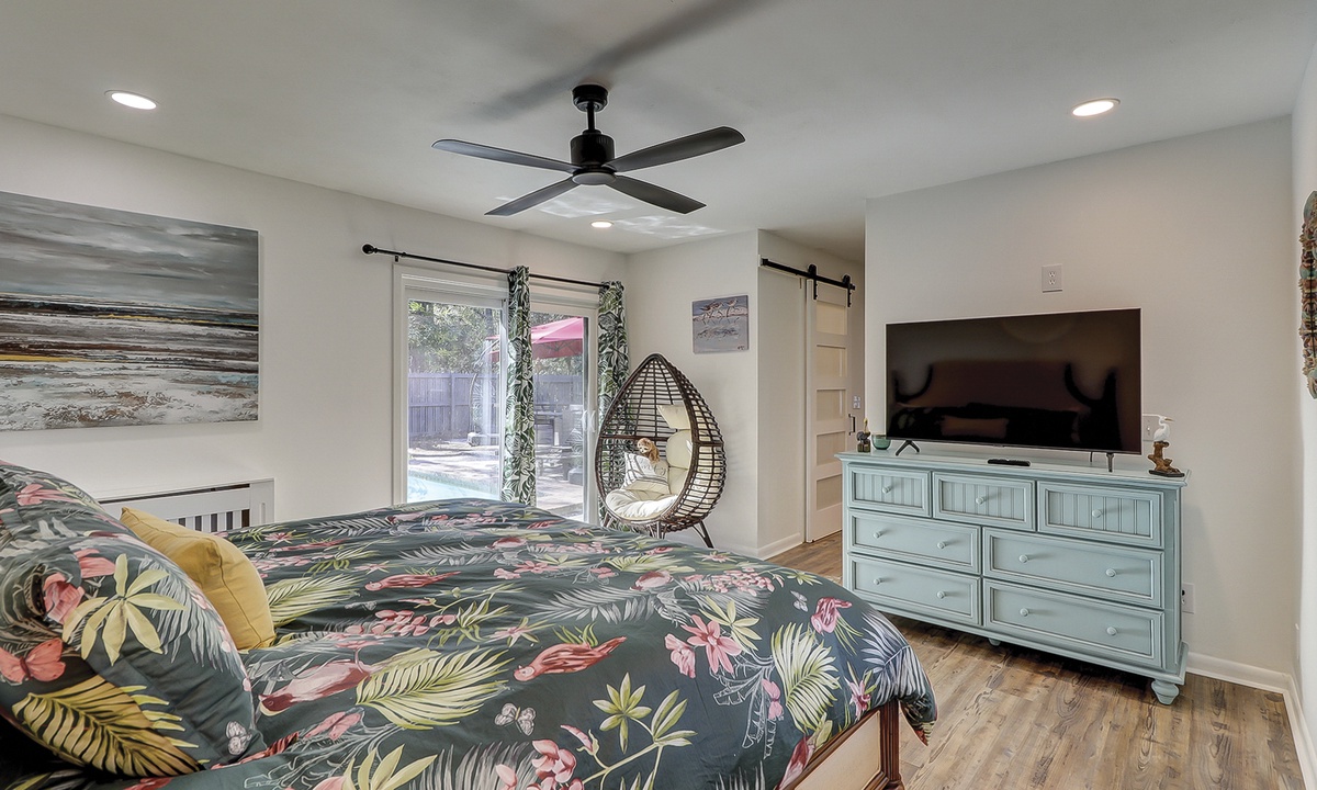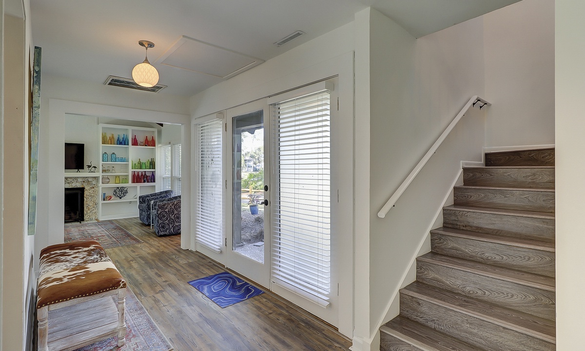 The main level of the home is ground level (no steps!) and features a cozy living area with a flat-screen TV, couch and 3 chairs. **Fireplace is not for guest use.** The kitchen features stainless appliances, a Keurig coffee maker and a laundry area. There is also a door that leads from the kitchen to the pool area. The dining area has seating for 6, as well as sliding doors leading to the pool.