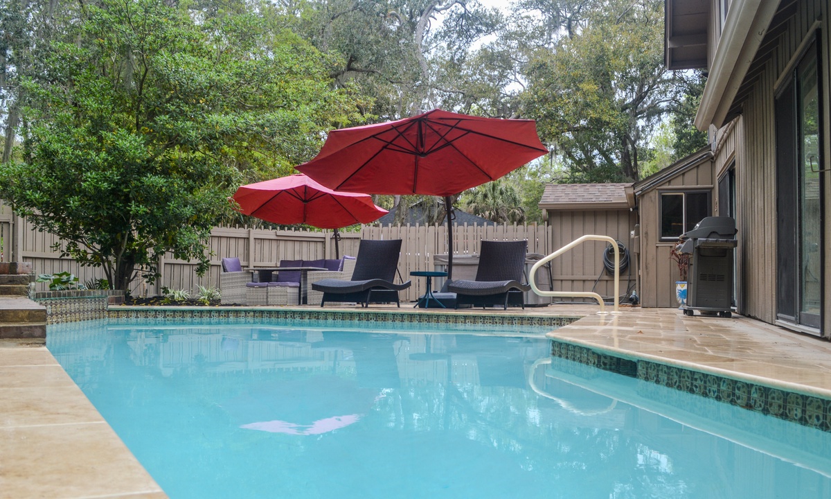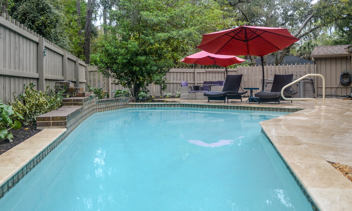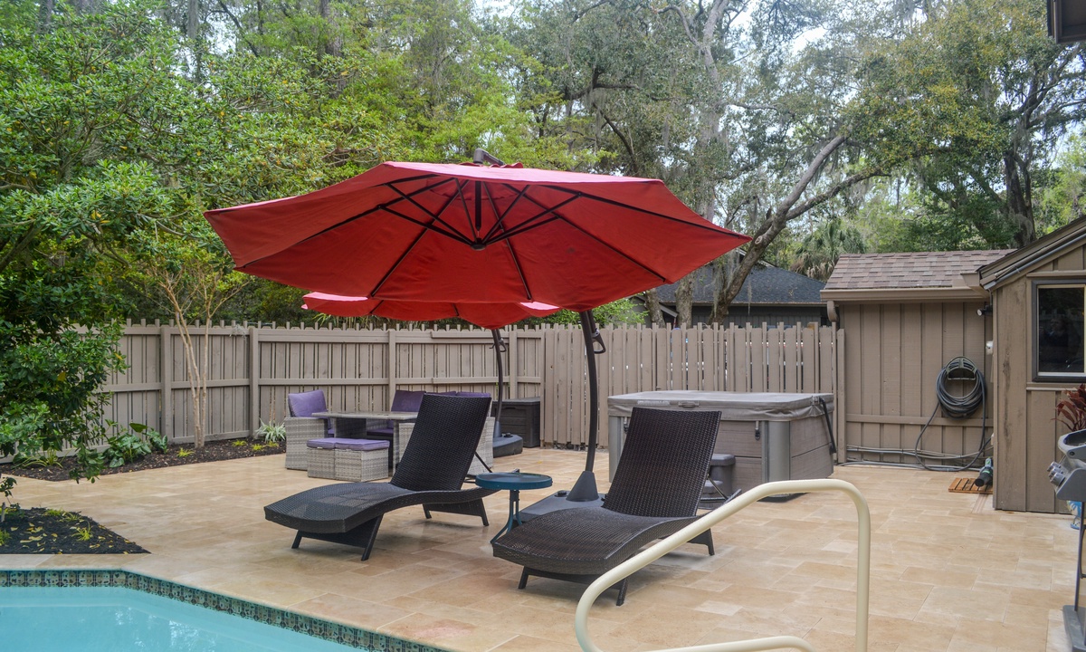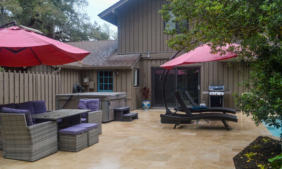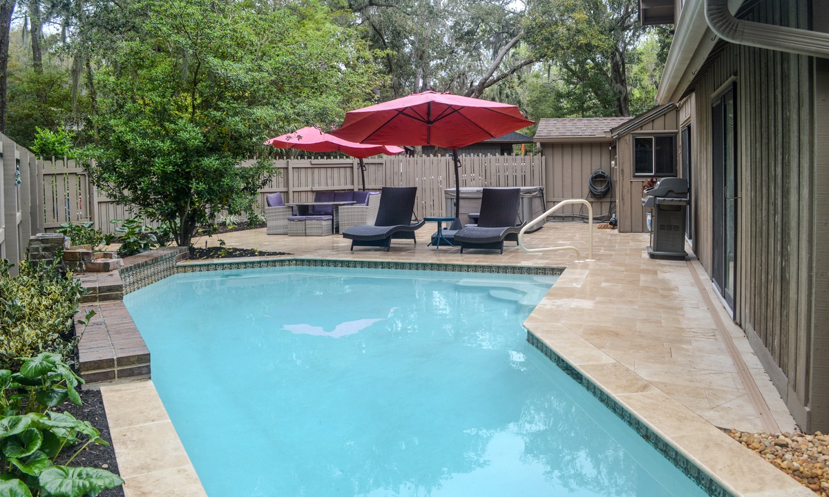 5 Indigo Lane offers the ultimate outdoor experience with a fully fenced-in backyard, private salt water pool, free use of the stand-alone hot tub and gas grill. The back area has a perfect mix of sun and shade, as well as plenty of seating and lounge chairs available.