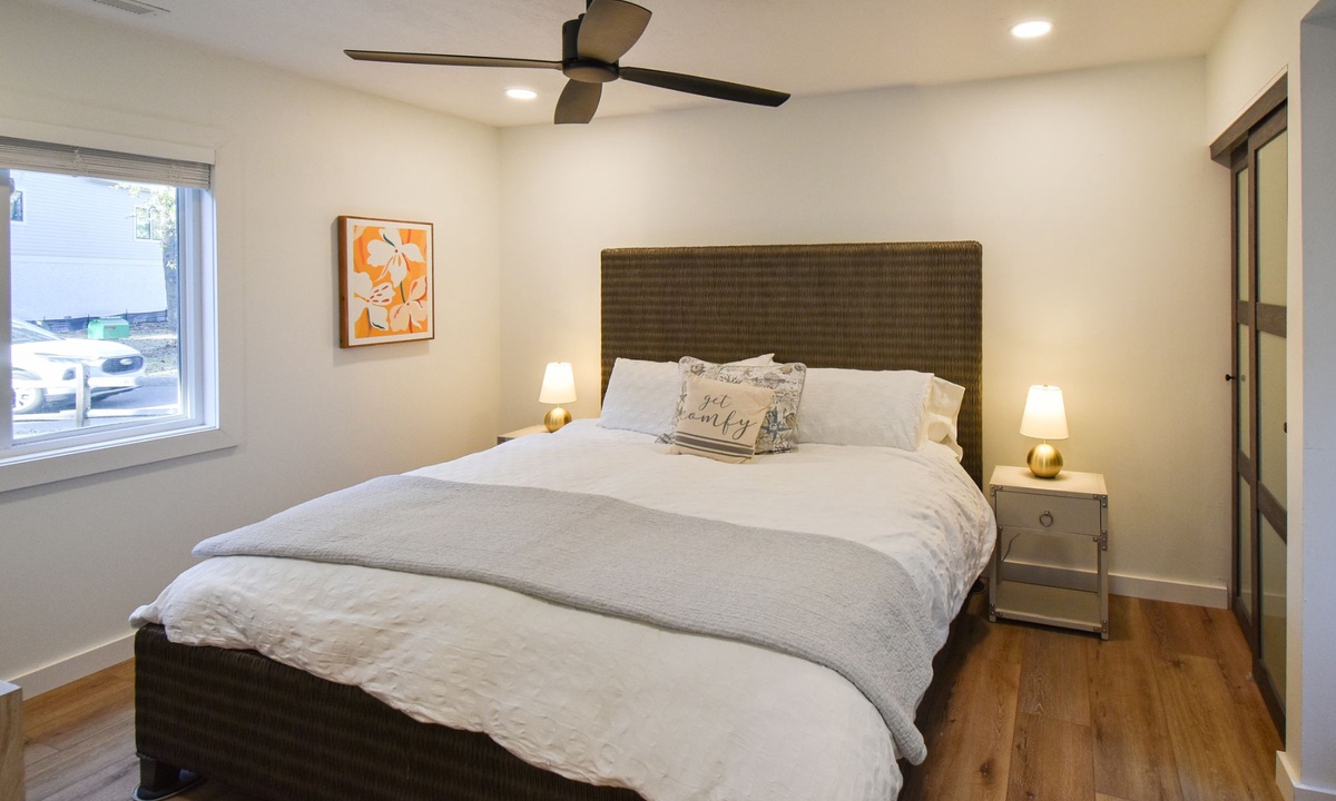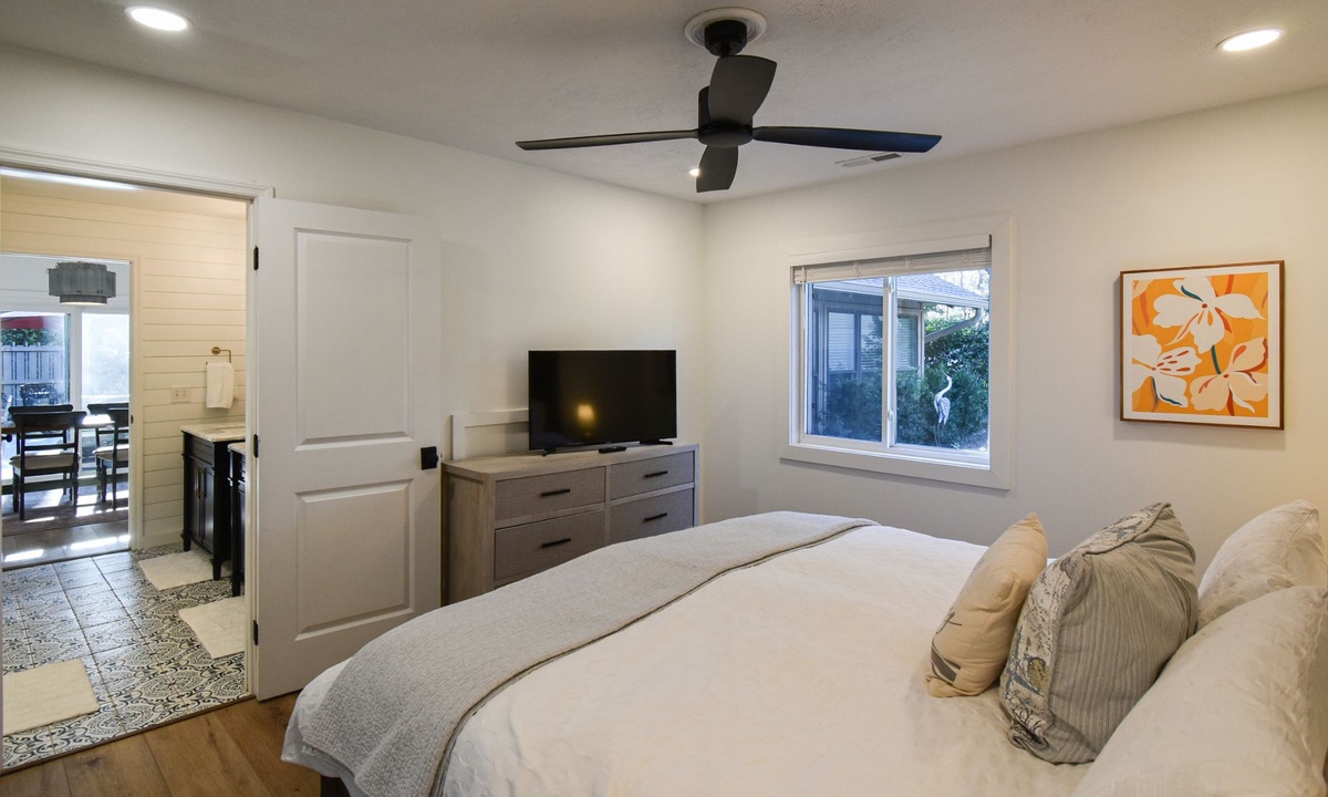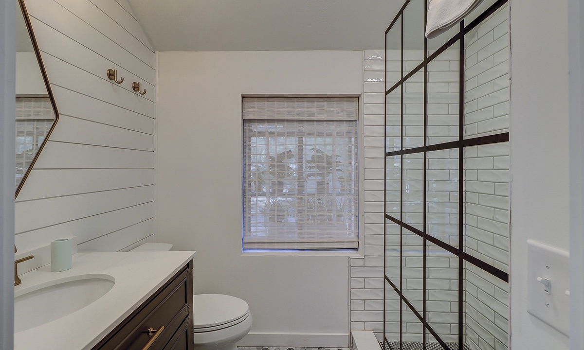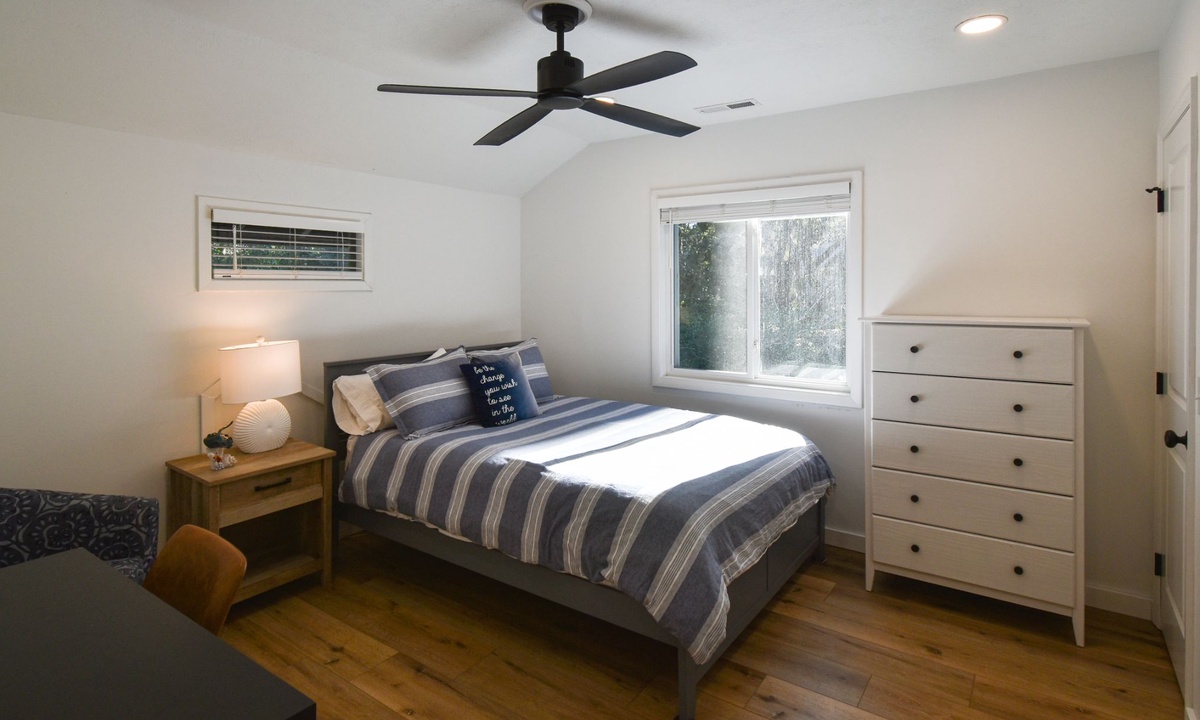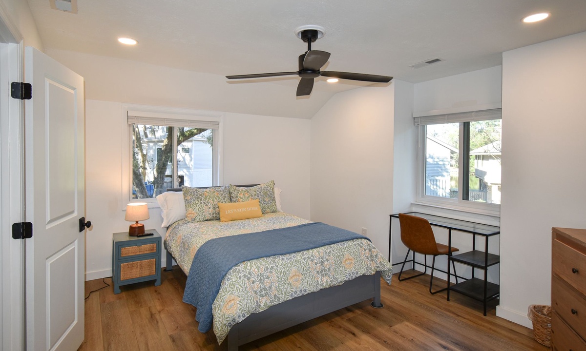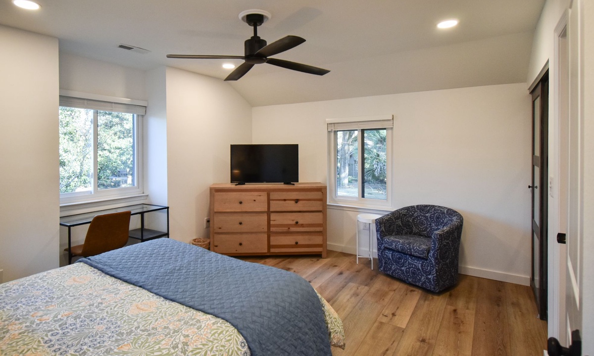 The two guest bedrooms are located on the 2nd level. The first bedroom has a queen bed, desk area and a flat-screen TV. The second bedroom also has a queen bed and a desk area. These rooms share access to a hall bathroom with a walk-in shower.