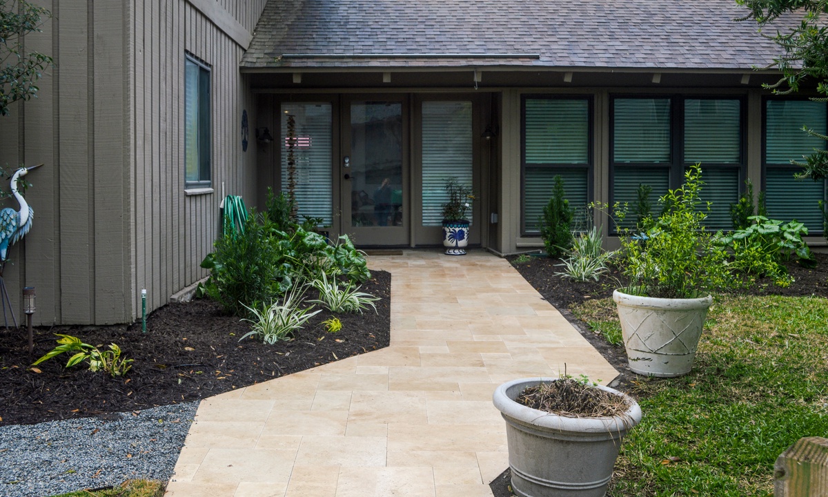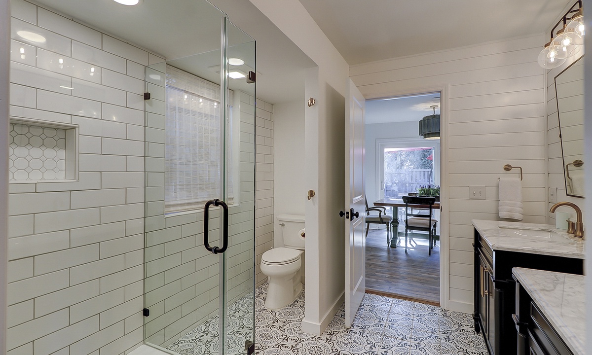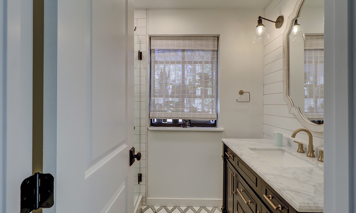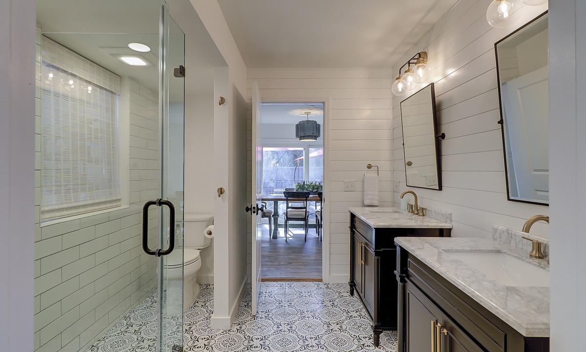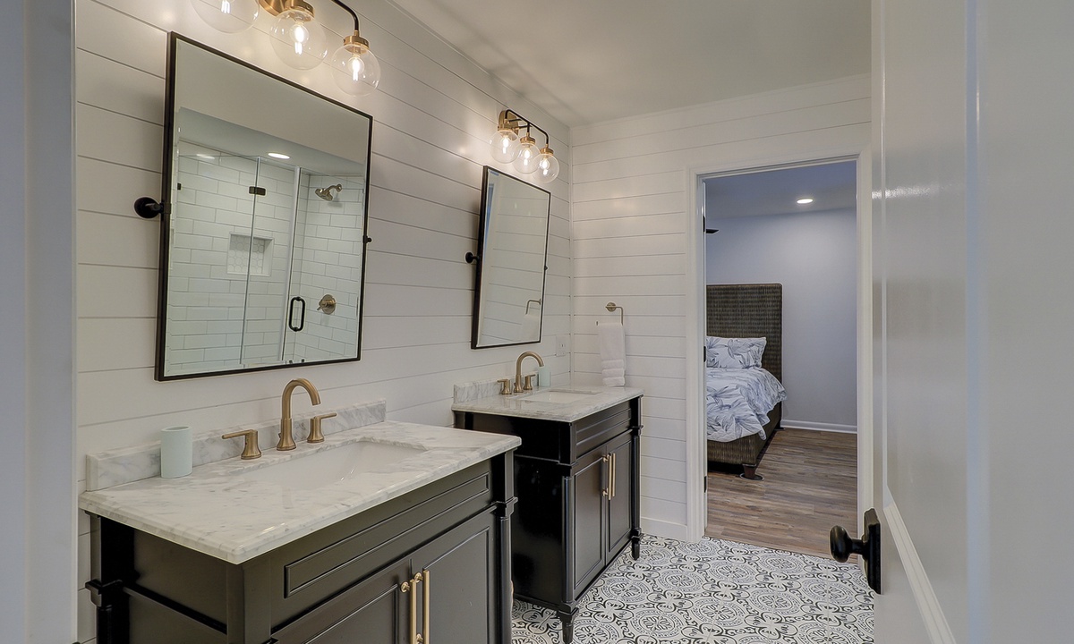 The main level of the home has a primary bedroom with a king bed, flat-screen TV and two closets. The bathroom has ornate tile flooring, two granite top vanities and a walk-in shower. The second bedroom on that level has a king bed, flat-screen TV and a private bathroom with a granite top vanity and walk-in shower.