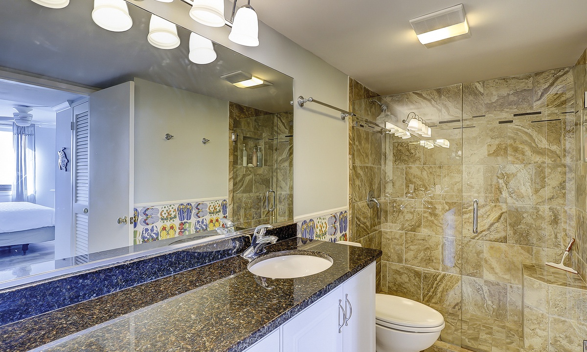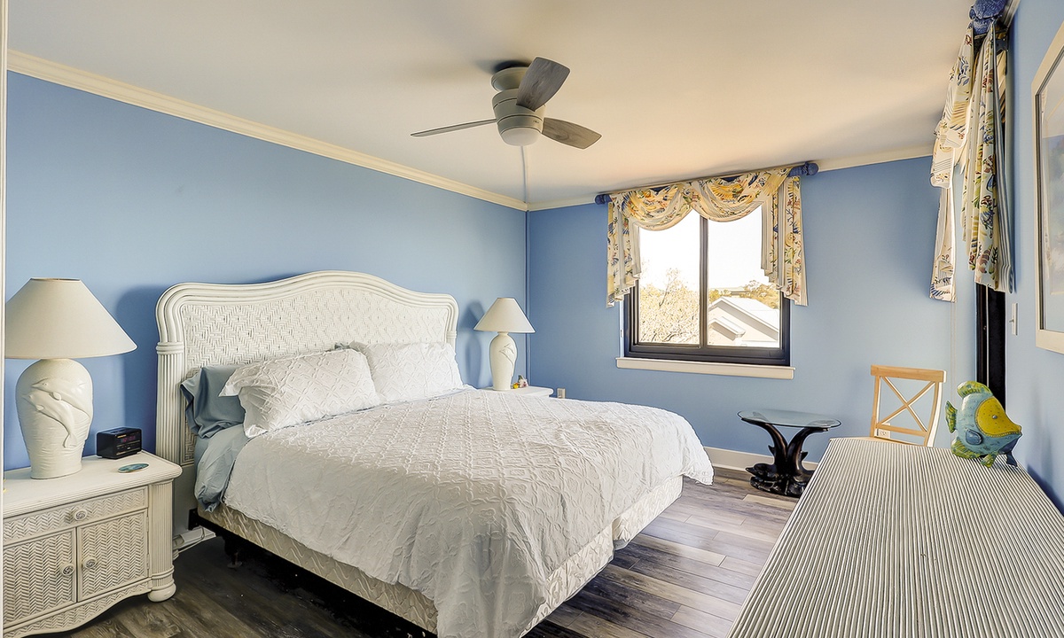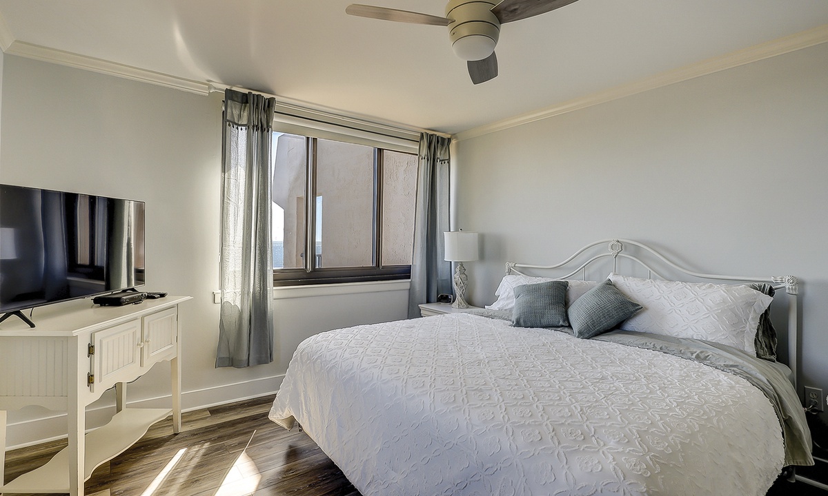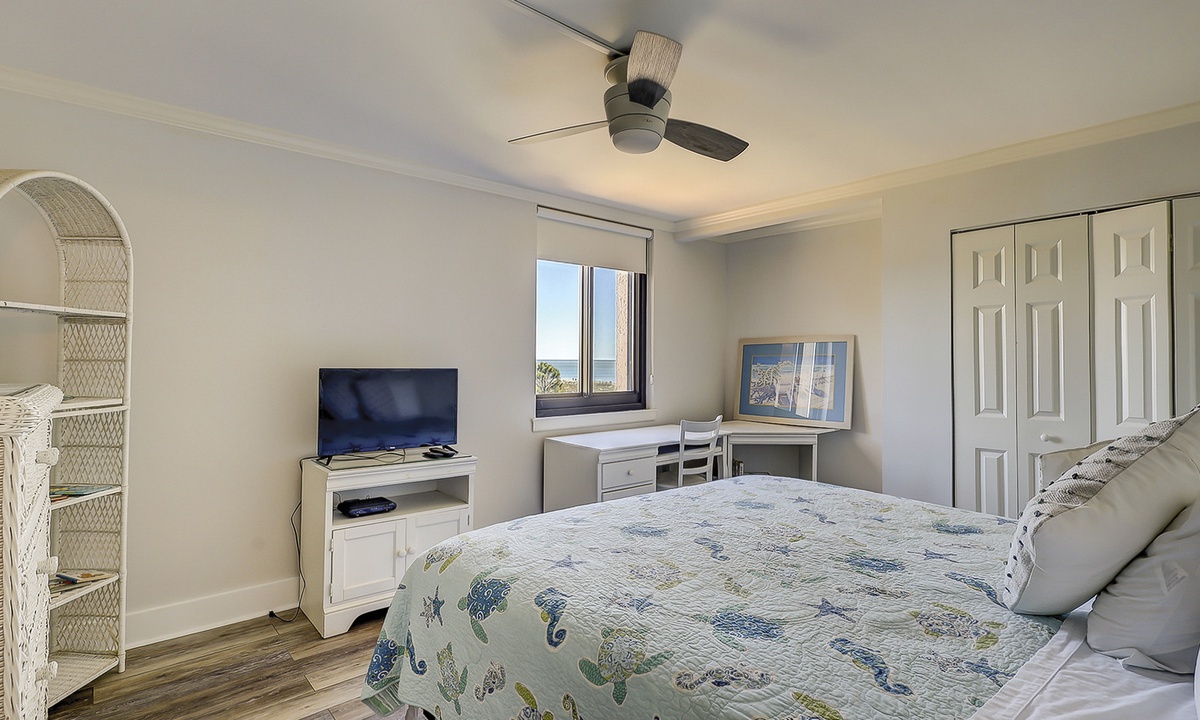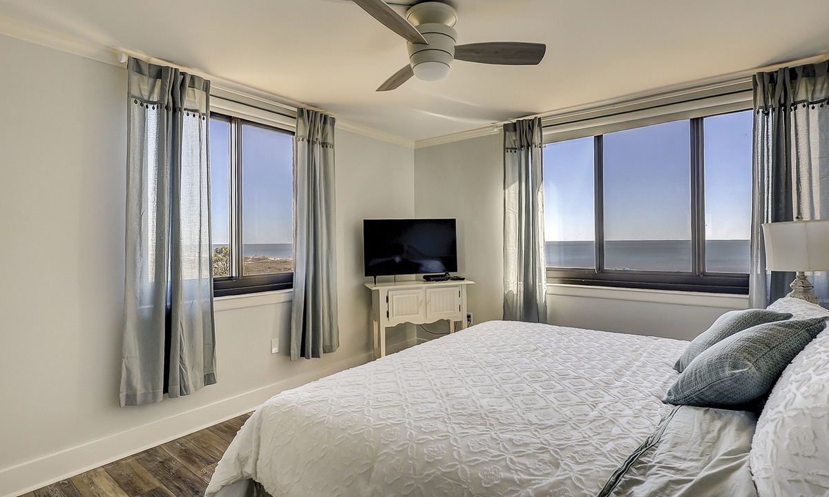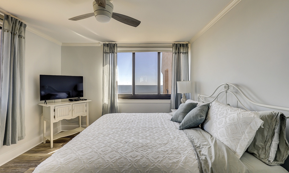 The main bedroom features a king bed, Smart TV, a writing desk, ocean views and has a private bathroom with double sinks and a large, tiled walk-in shower.