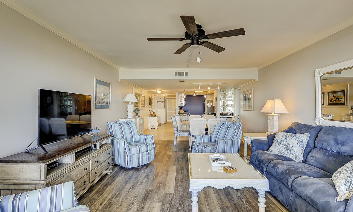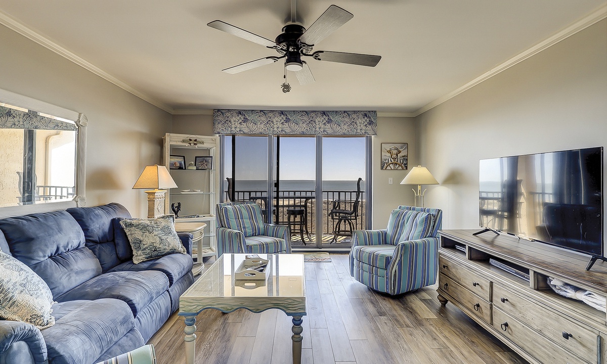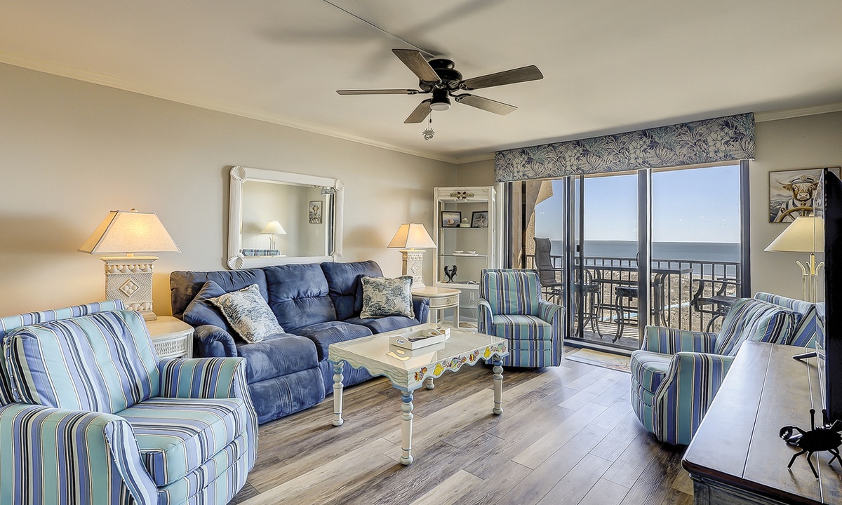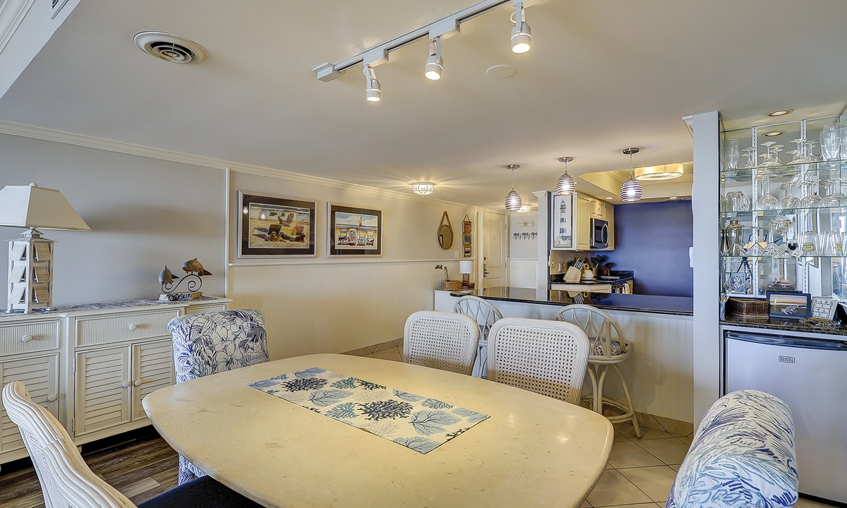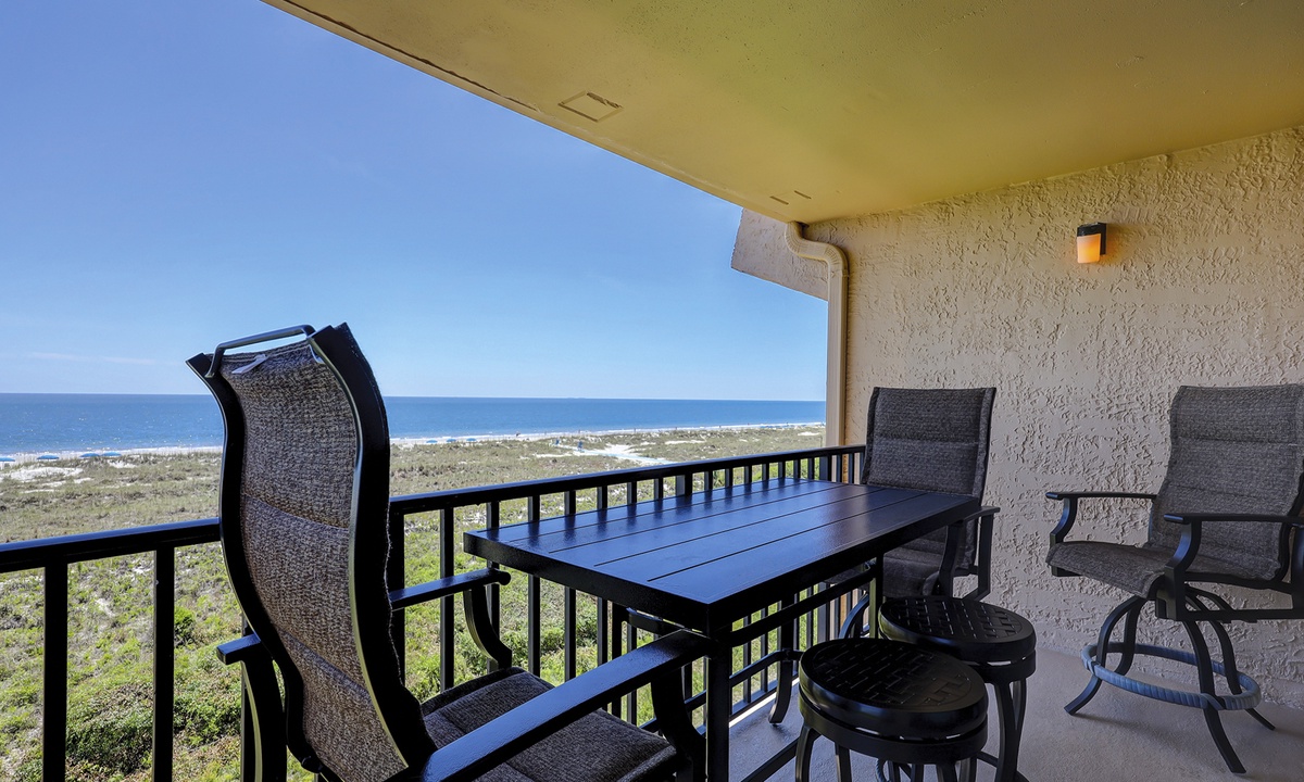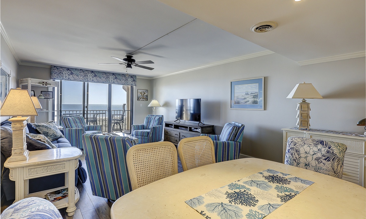 The open concept floor plan features a comfortable living area with a Smart TV and access to the private balcony overlooking the Atlantic. Views from the ocean can be seen from the dining area and kitchen as well. The dining area seats 6 comfortably, with additional seating for 2 at the kitchen bar.