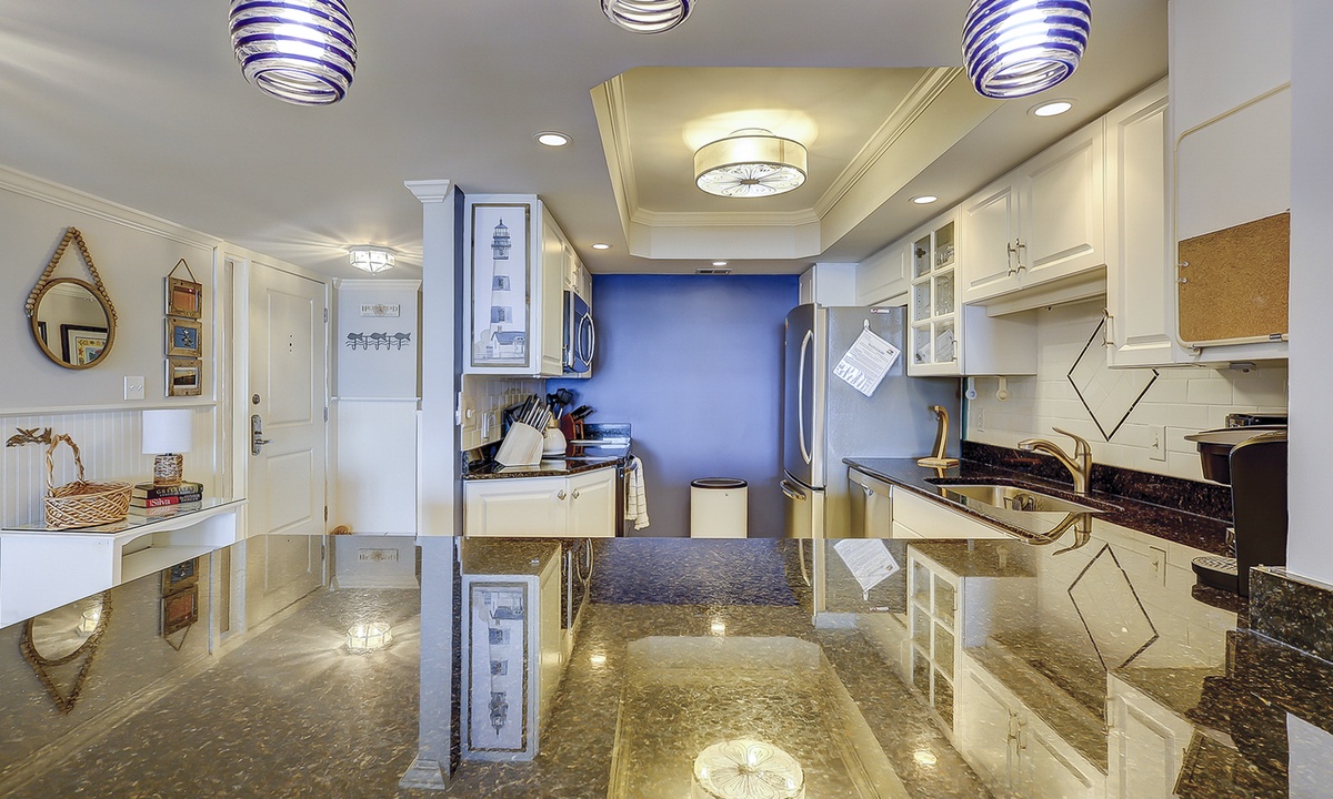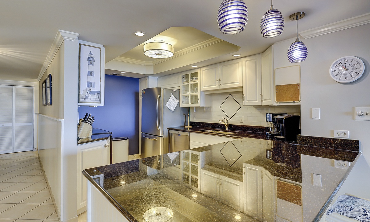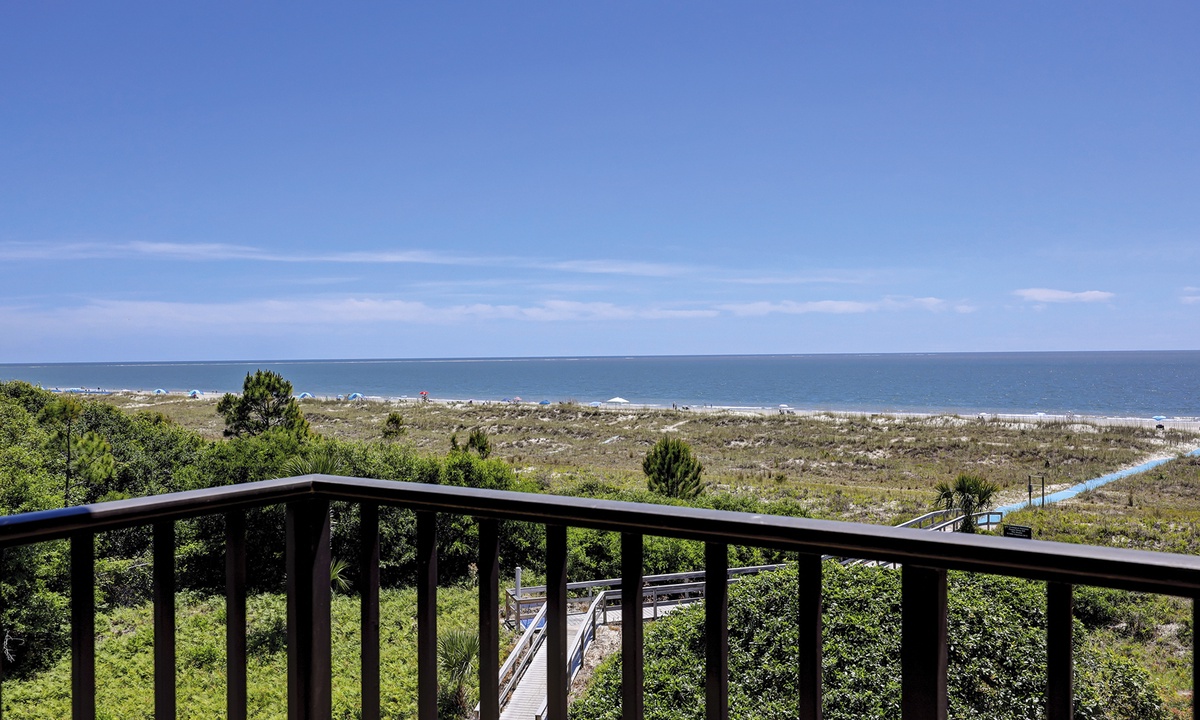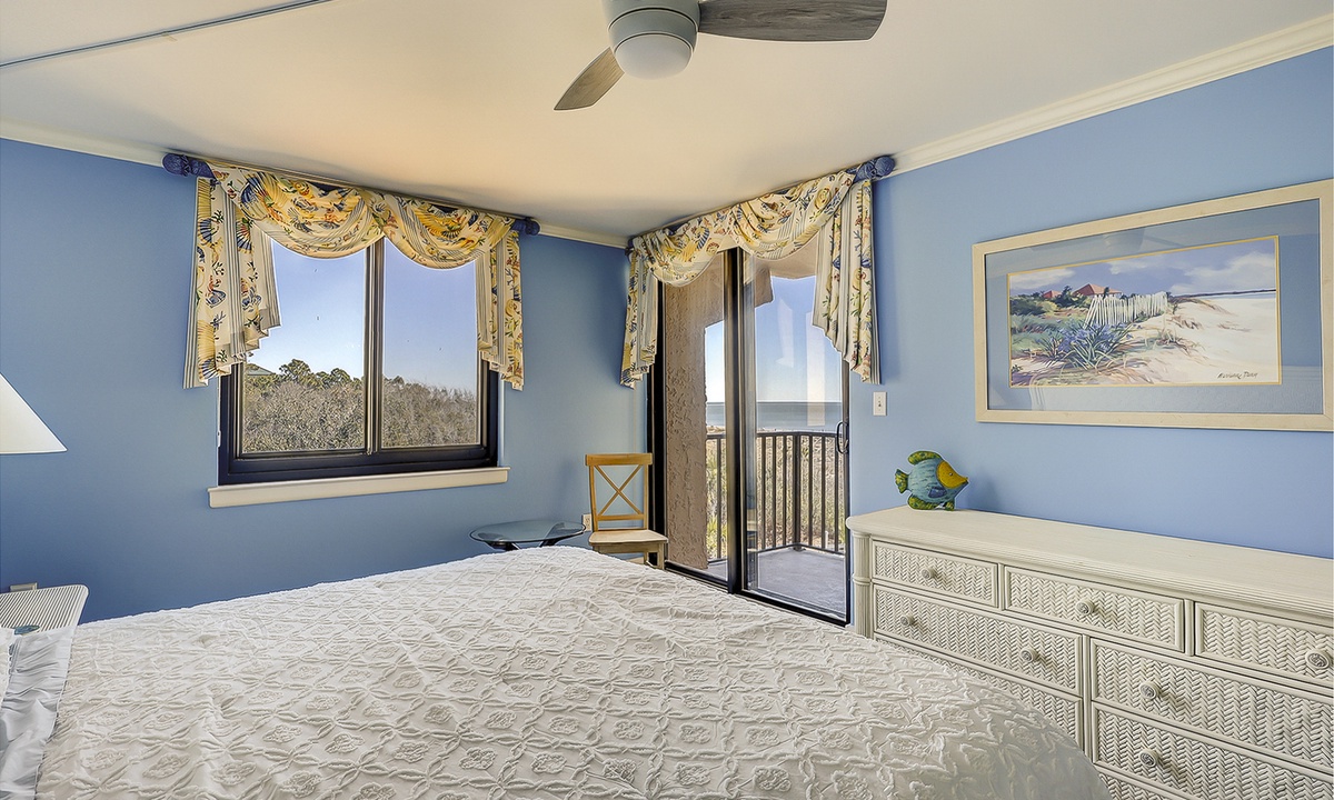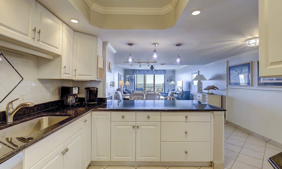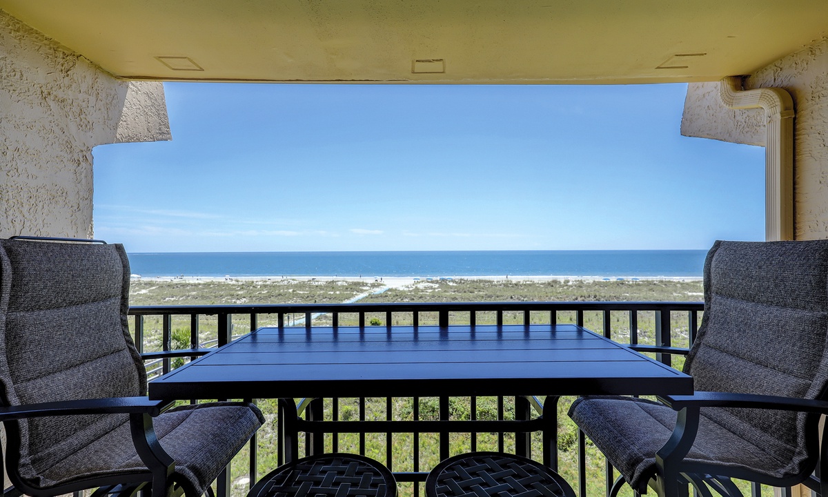 The open concept floor plan features a comfortable living area with a Smart TV and access to the private balcony overlooking the Atlantic. Views from the ocean can be seen from the dining area and kitchen as well. The dining area seats 6 comfortably, with additional seating for 2 at the kitchen bar.
