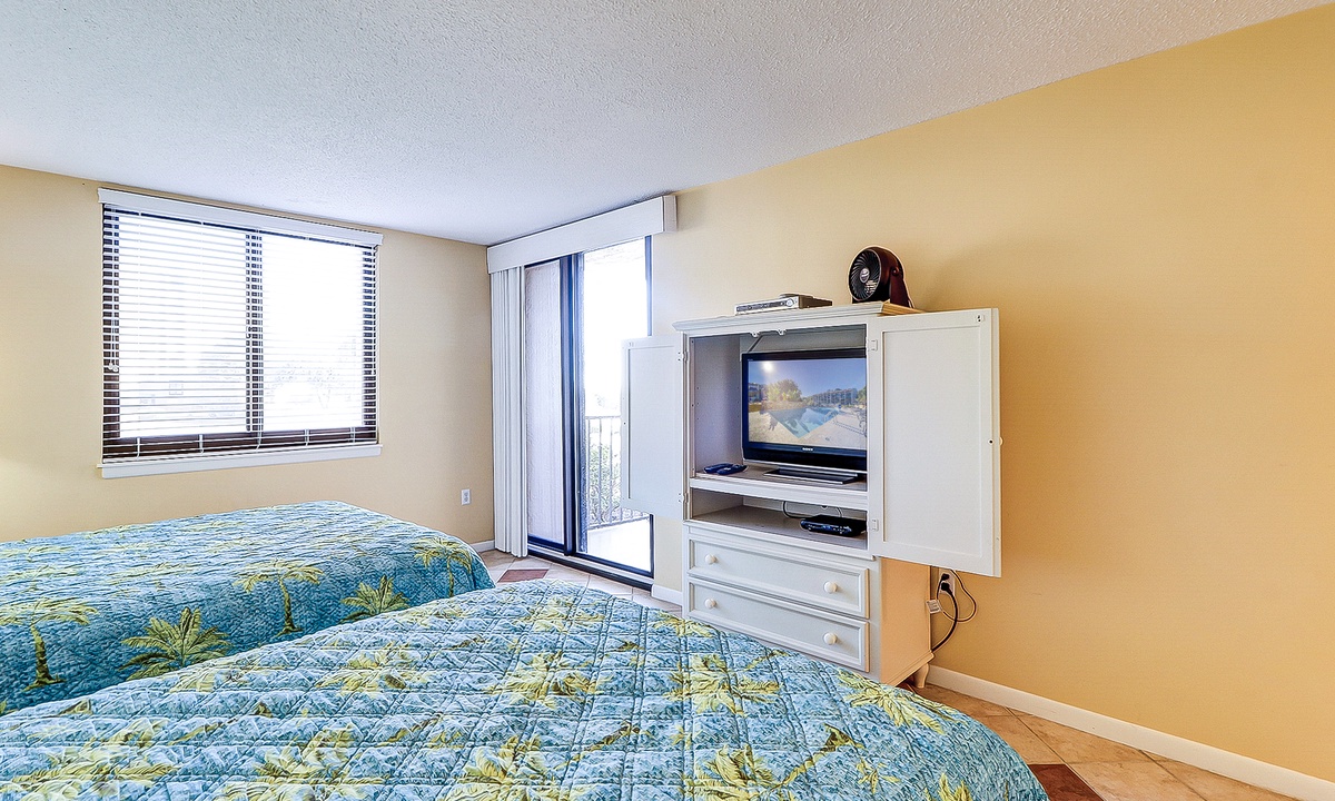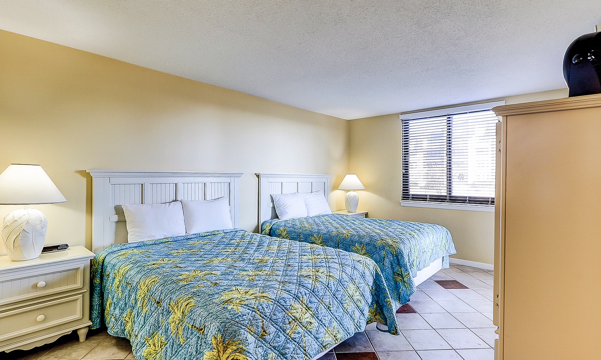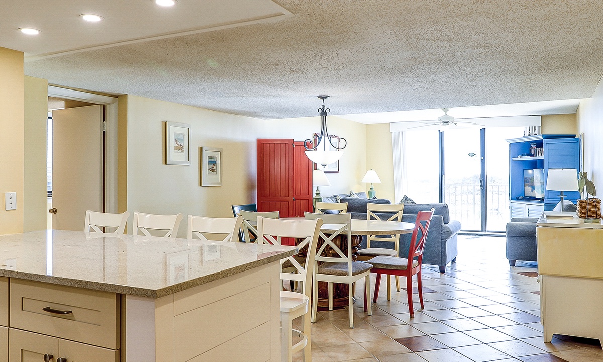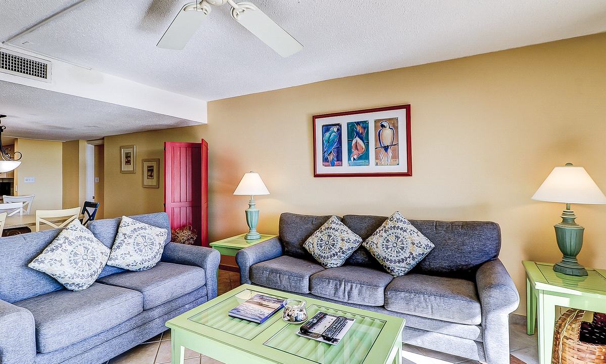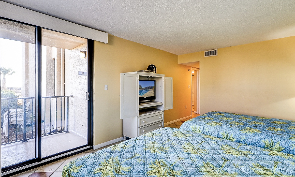The main bedroom is located just off the living area and features a king bed, flat screen TV and a private bathroom with a large walk-in shower. The first guest room has a queen and a twin bed, as well as a flat screen TV and access to a bathroom with a tub/shower combination. The second guest room features two queen size beds, a flat screen TV and access to a private porch overlooking the Island Club playground. This room has a bathroom with a walk-in shower.