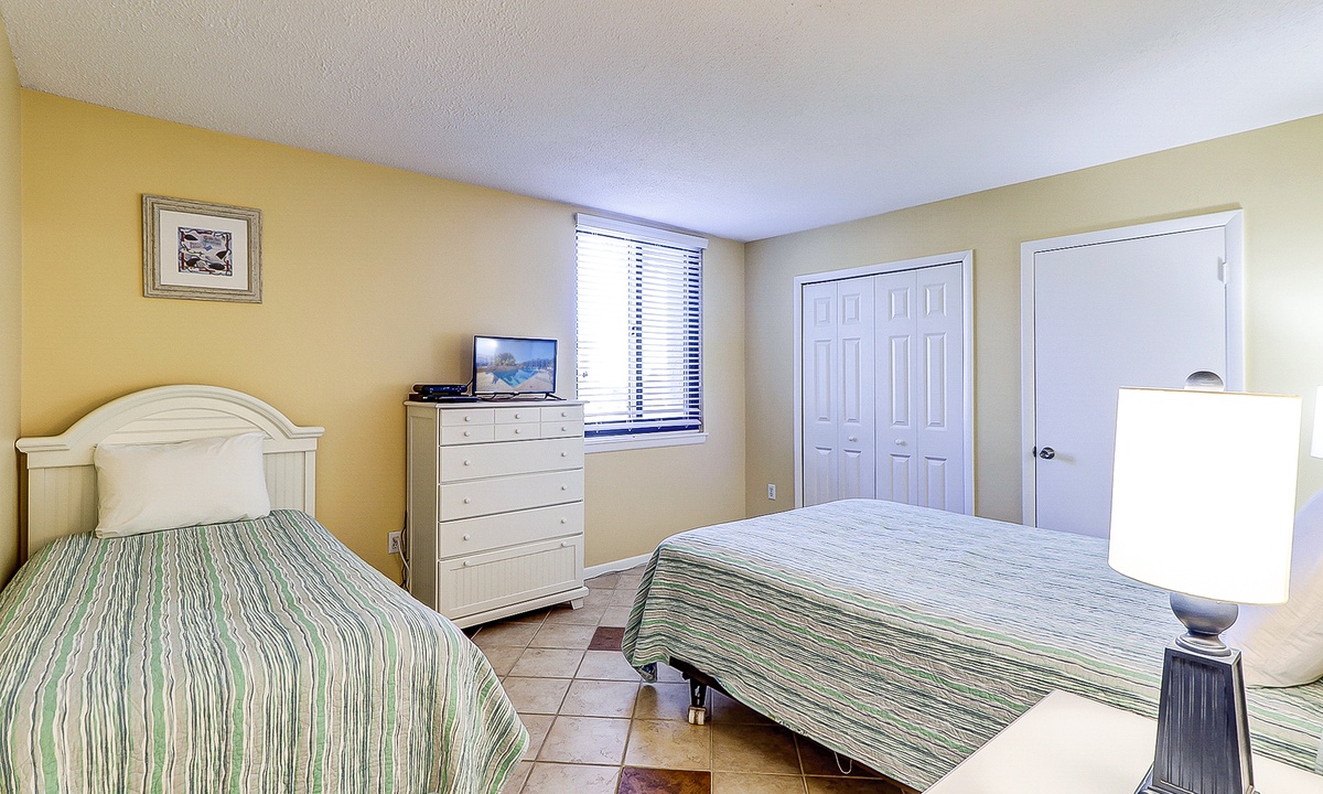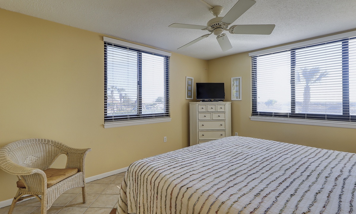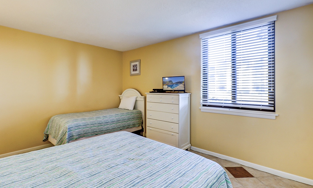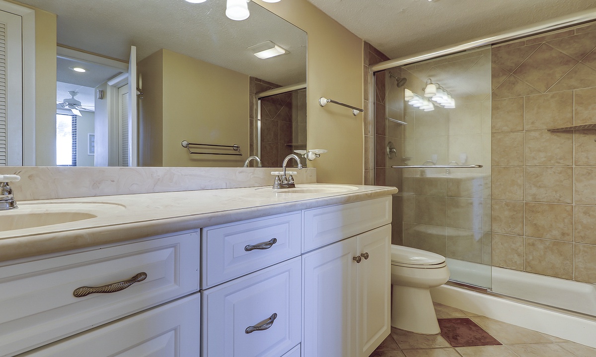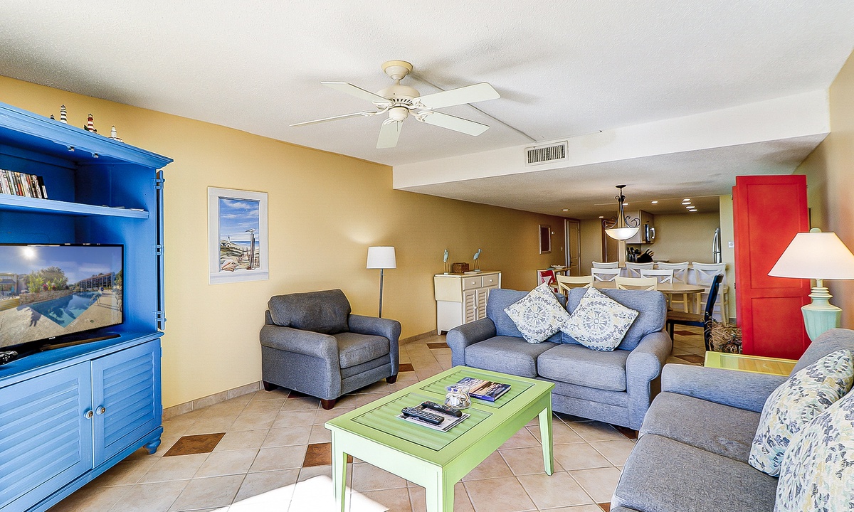 The main bedroom is located just off the living area and features a king bed, flat screen TV and a private bathroom with a large walk-in shower. The first guest room has a queen and a twin bed, as well as a flat screen TV and access to a bathroom with a tub/shower combination. The second guest room features two queen size beds, a flat screen TV and access to a private porch overlooking the Island Club playground. This room has a bathroom with a walk-in shower.