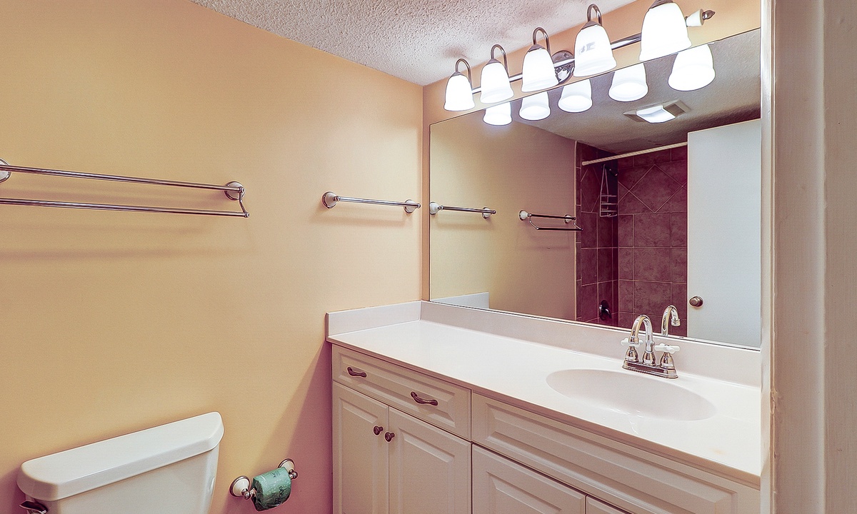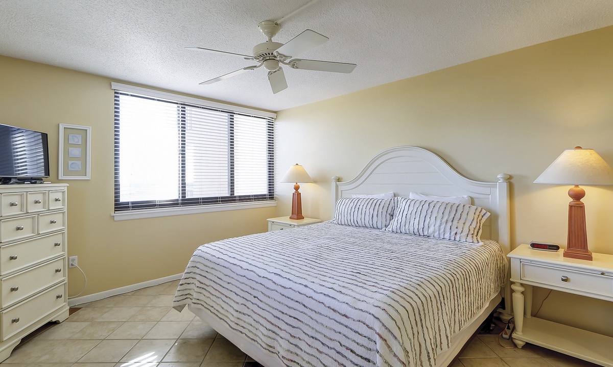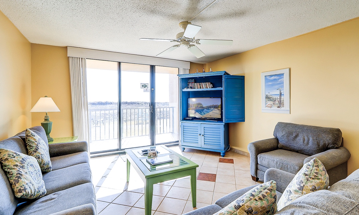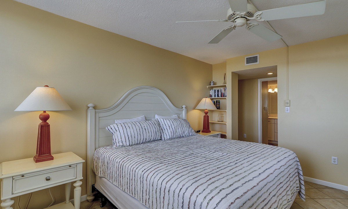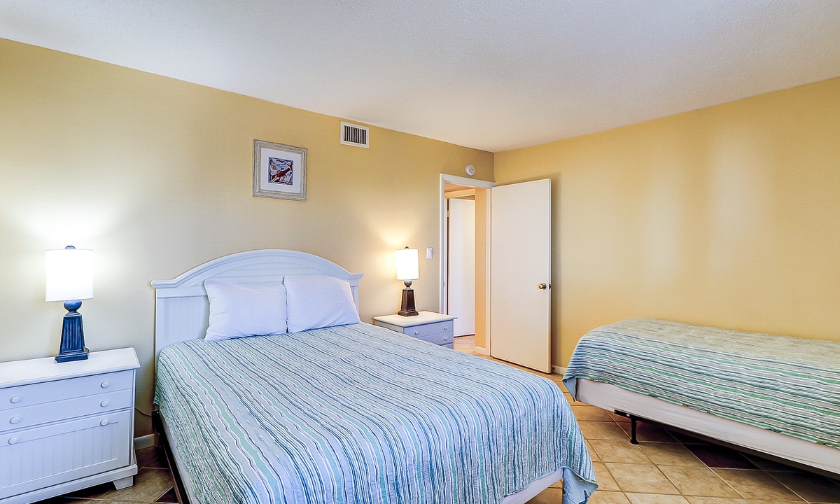 The main bedroom is located just off the living area and features a king bed, flat screen TV and a private bathroom with a large walk-in shower. The first guest room has a queen and a twin bed, as well as a flat screen TV and access to a bathroom with a tub/shower combination. The second guest room features two queen size beds, a flat screen TV and access to a private porch overlooking the Island Club playground. This room has a bathroom with a walk-in shower.