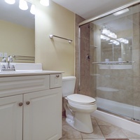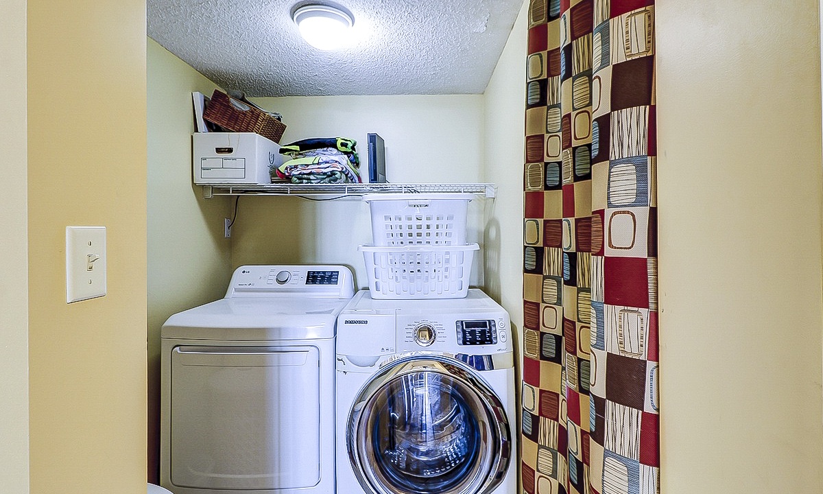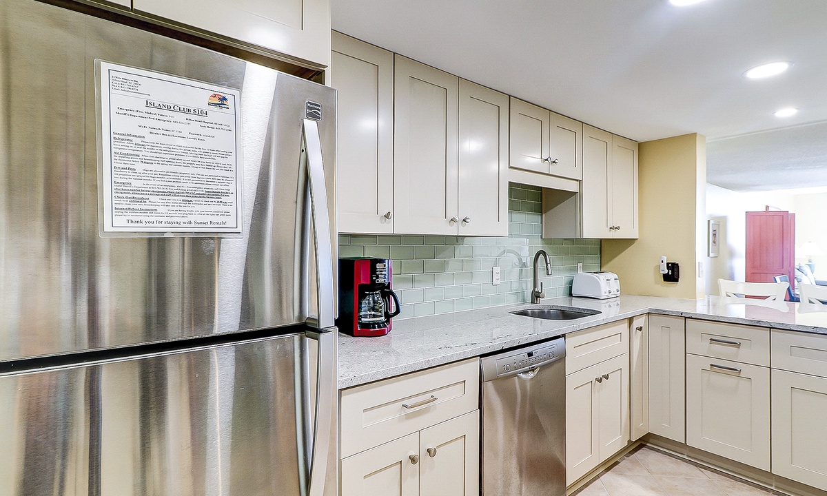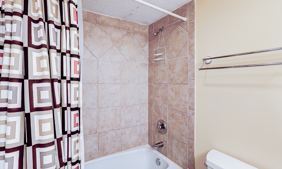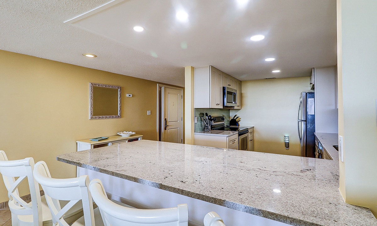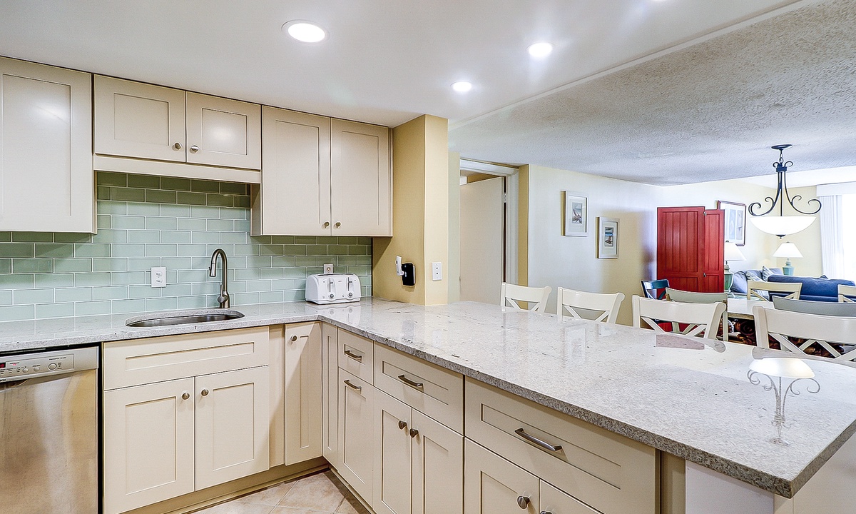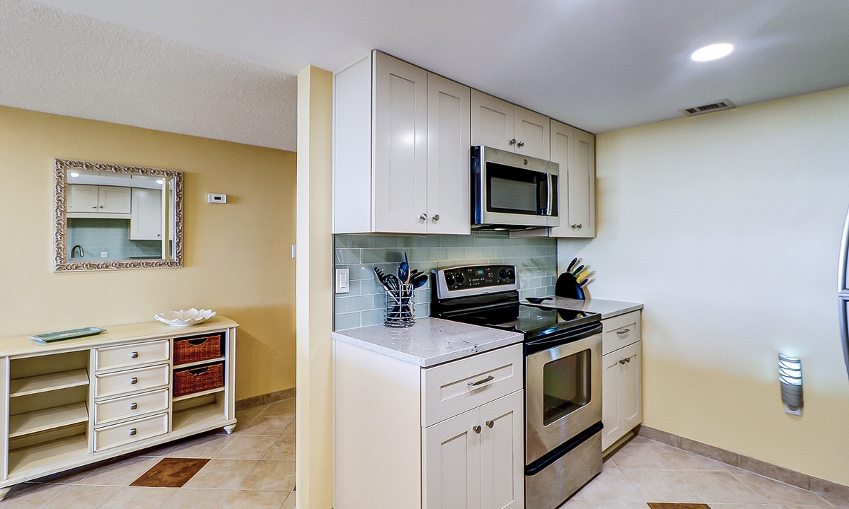 The open-concept floor plan features ceramic flooring in all common area. Relax in the comfortable living area featuring plenty of seating, a 42” flat screen and access to the private deck. The dining area seats 6 guests with additional seating for 3 at the kitchen bar. The fully stocked, recently renovated, kitchen makes preparing meals a breeze! The kitchen features ceramic tiles, stainless appliances and plenty of cabinet and counter space.