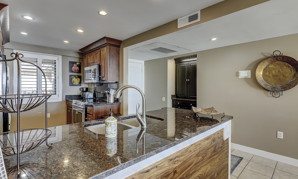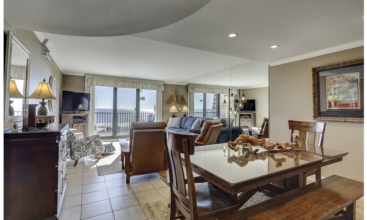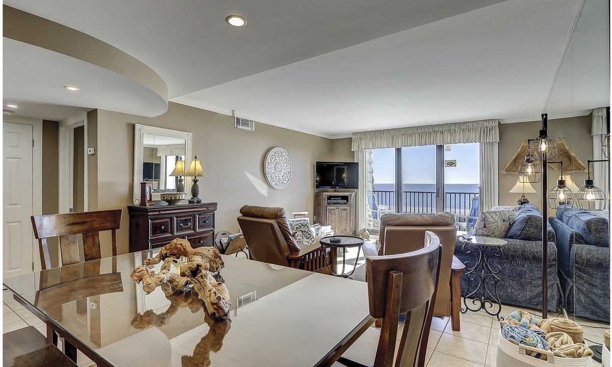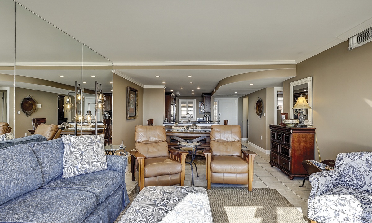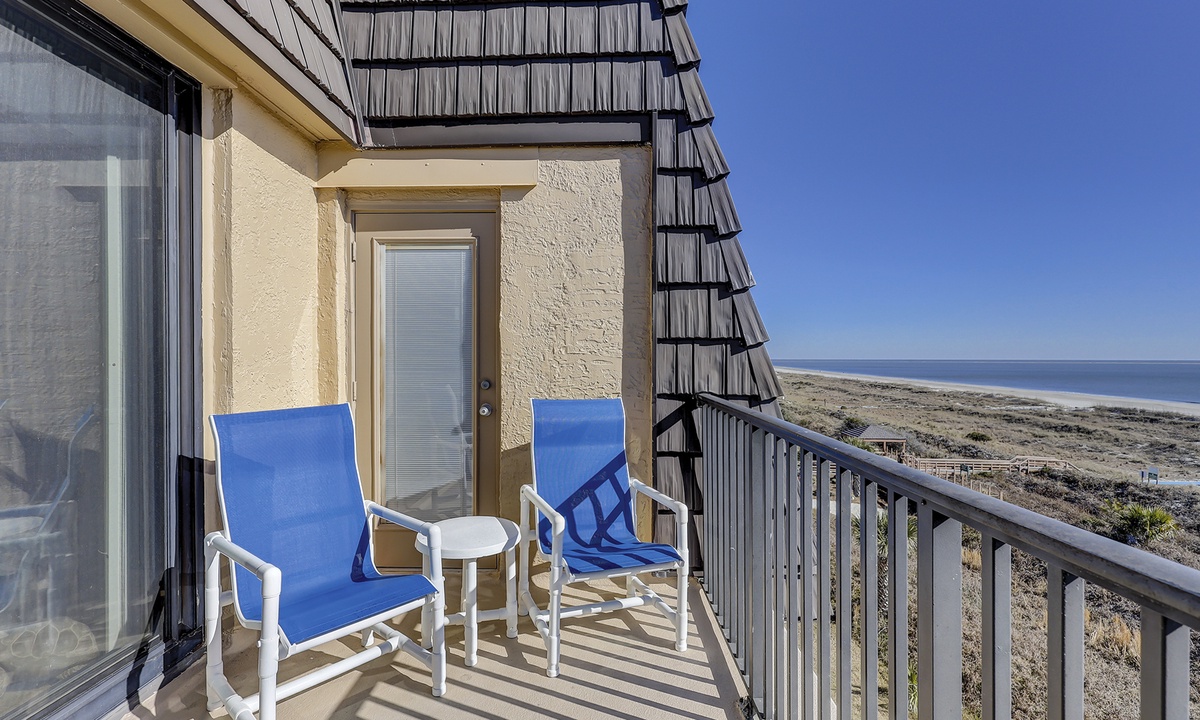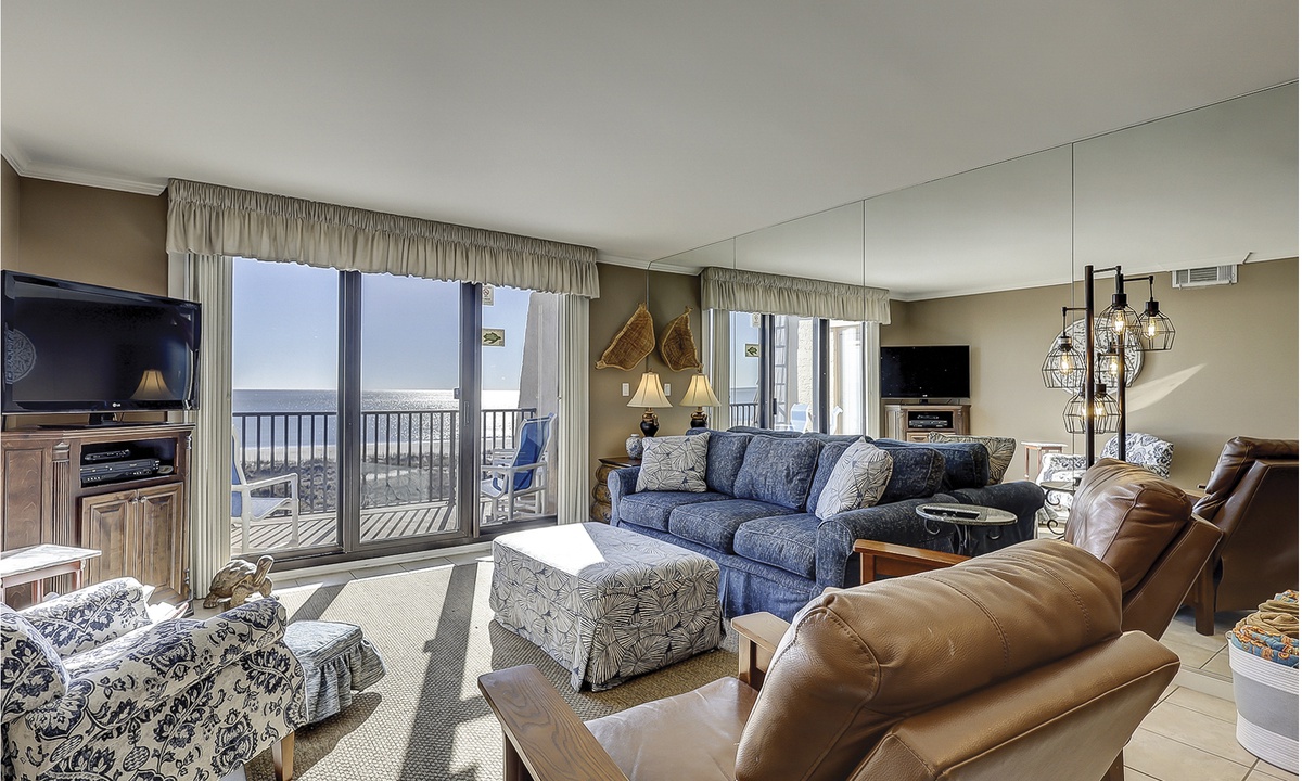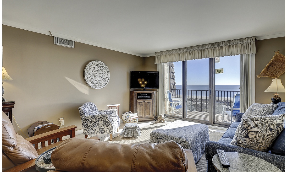 The living area features comfortable furniture, a Smart TV and stunning ocean views. Guests can access the oceanfront balcony through sliding glass doors in this room or from the main bedroom.