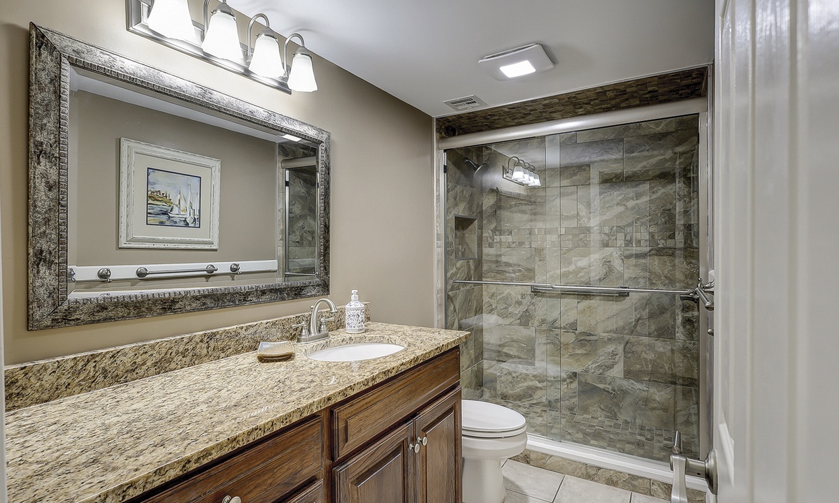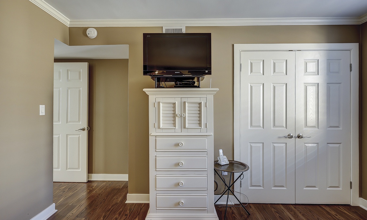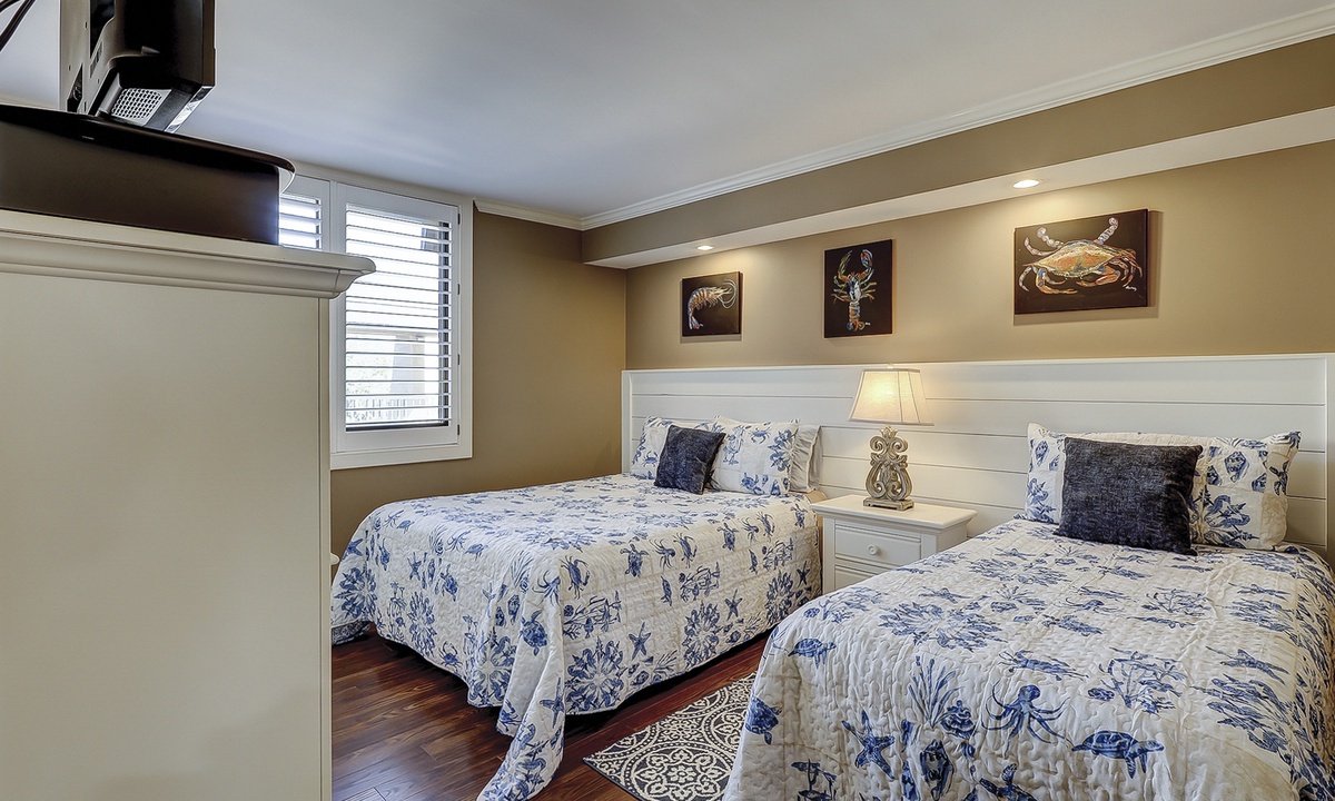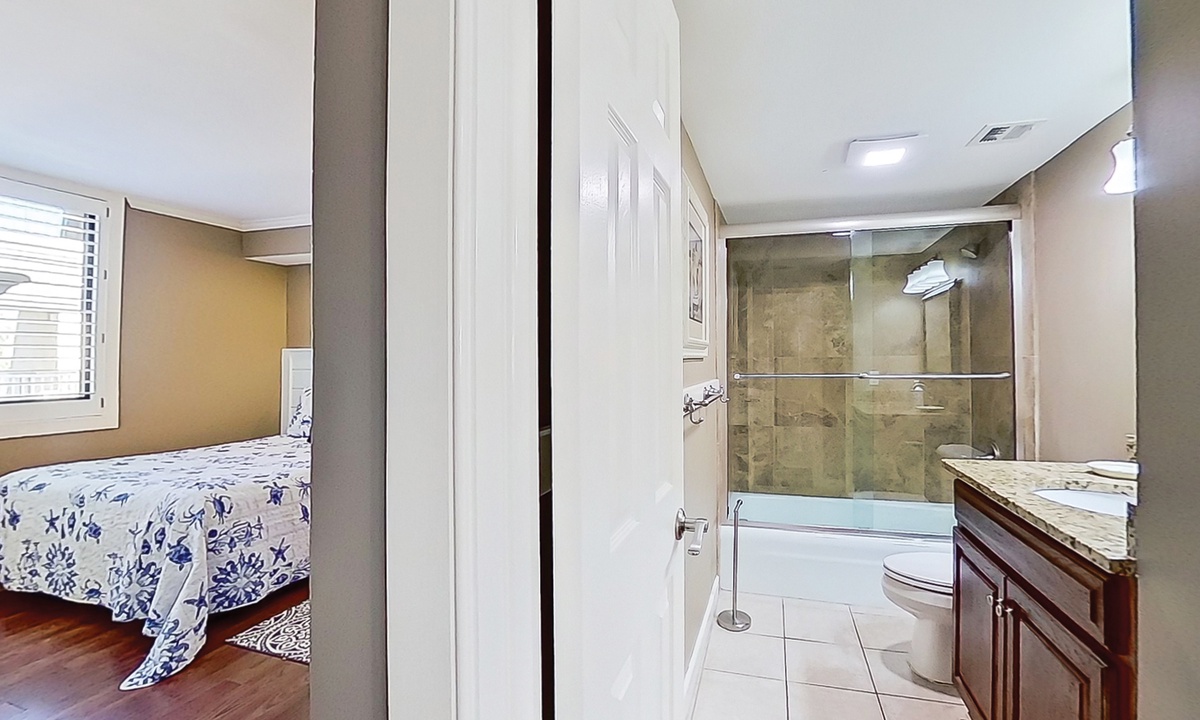 The guest bedroom has a queen bed, twin bed, Smart TV and access to a private bathroom with a tub/shower combination.