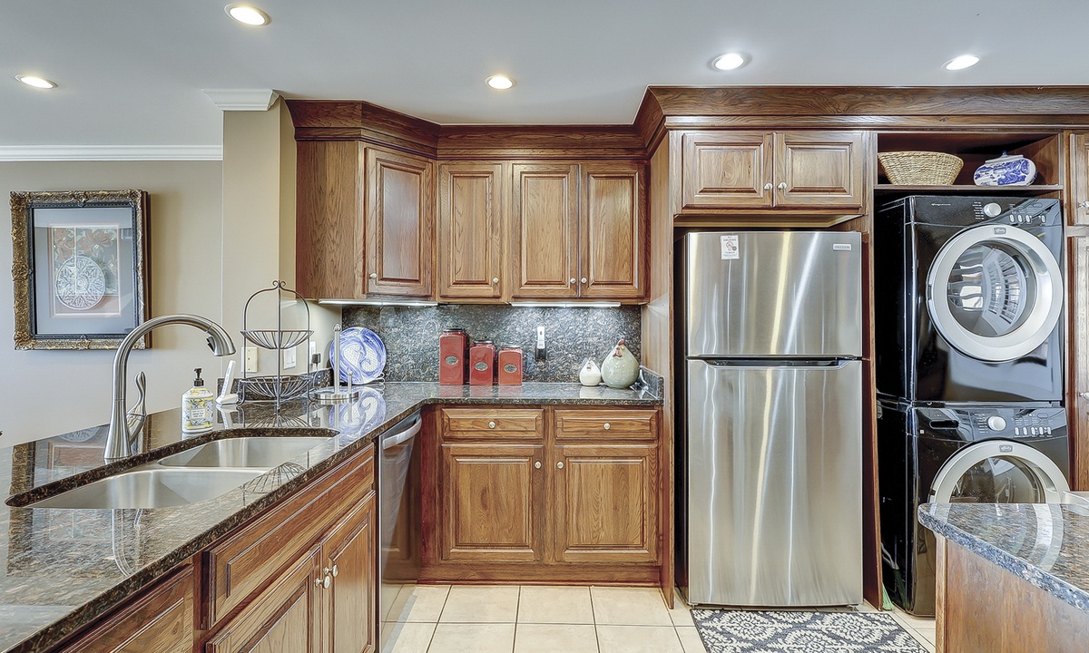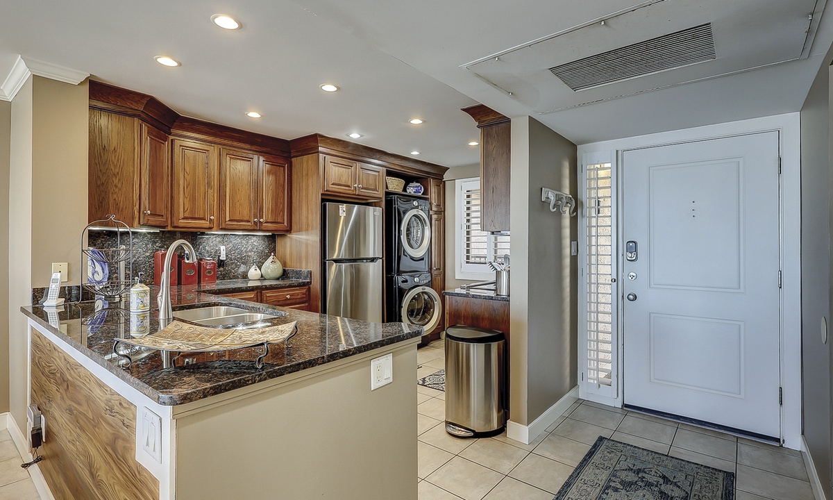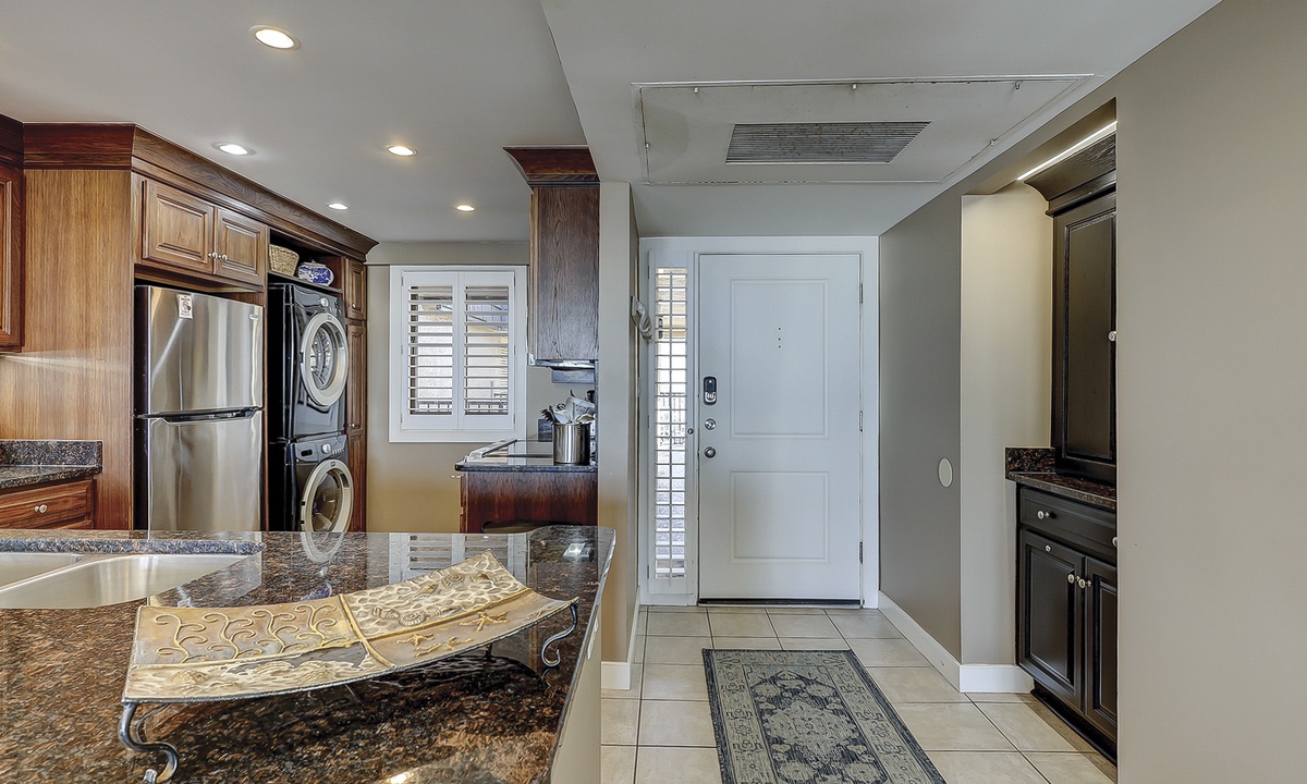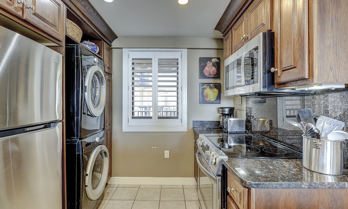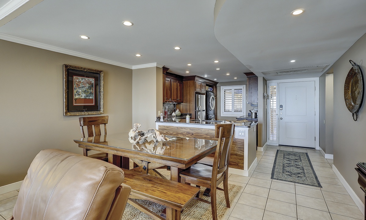 The dining area seats 6 and is open to the top-of-the-line kitchen. The kitchen has granite counters, stainless appliances, custom cabinets and a full-size washer and dryer.