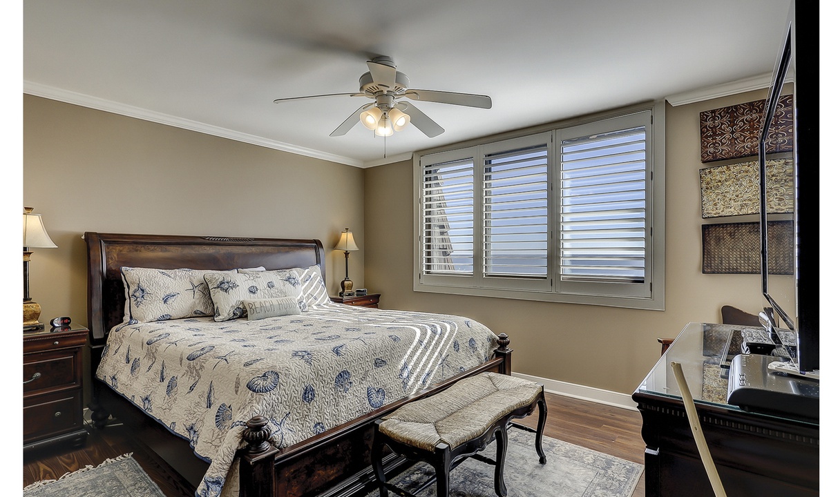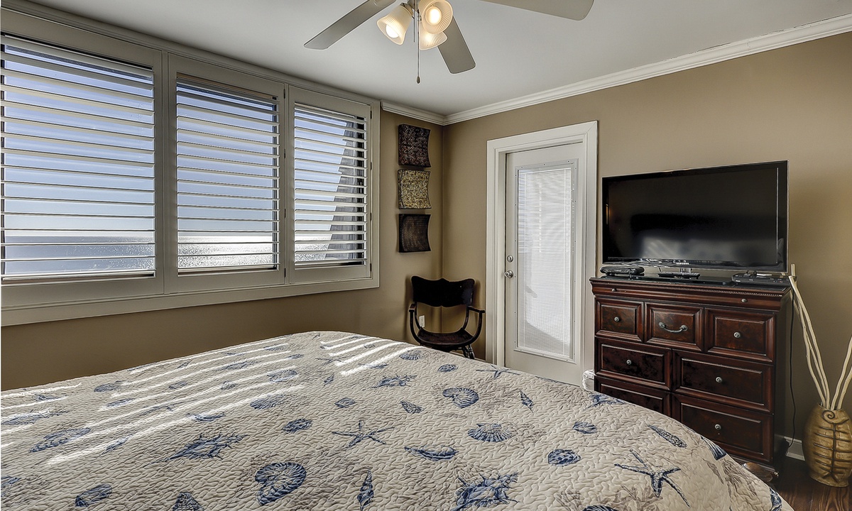 The main bedroom has a king bed, Smart TV, magnificent ocean views and a private bathroom with a large vanity and a tiled walk-in shower.