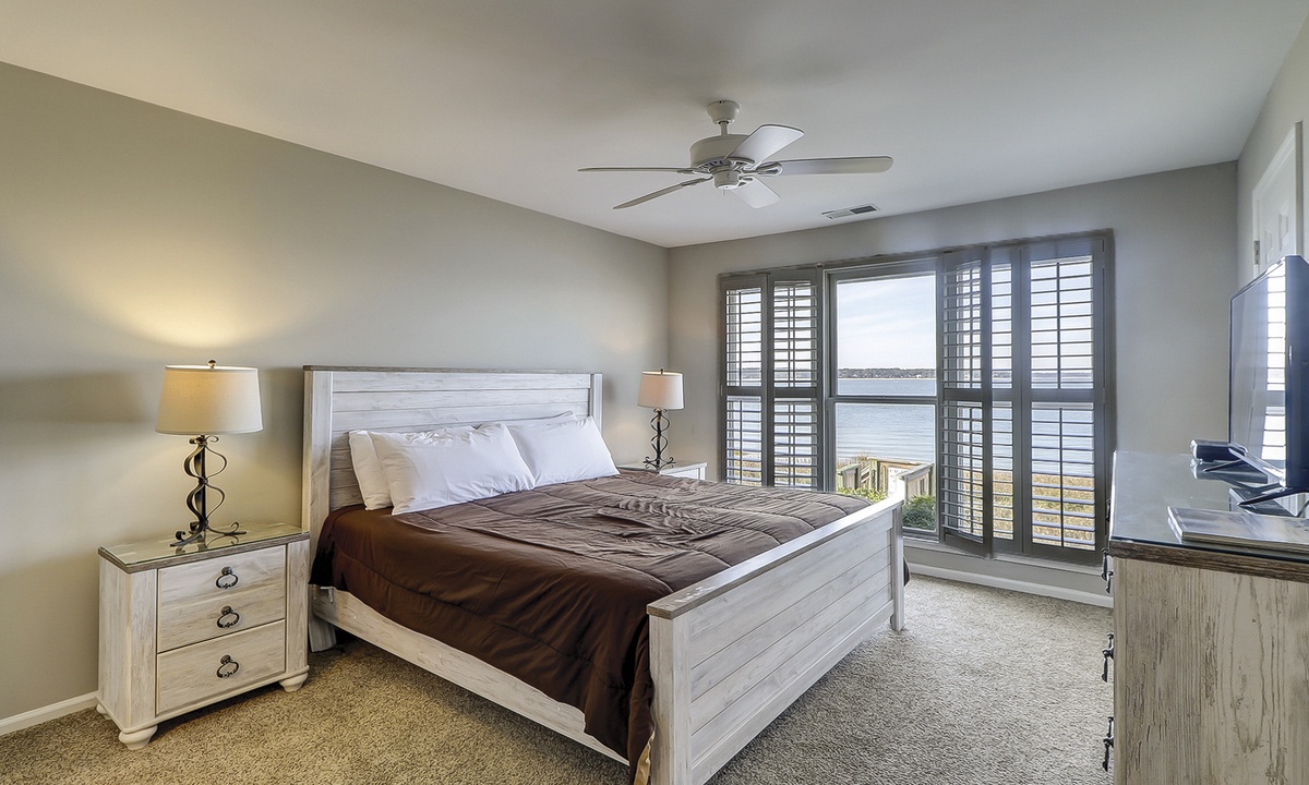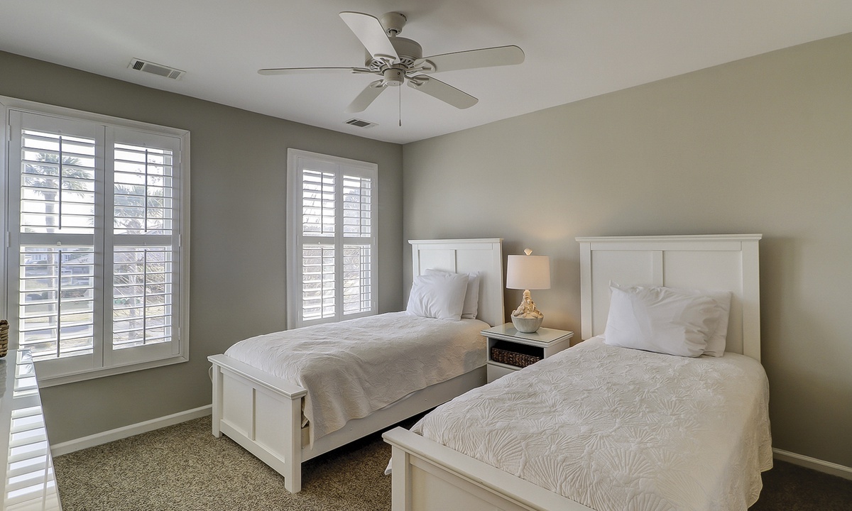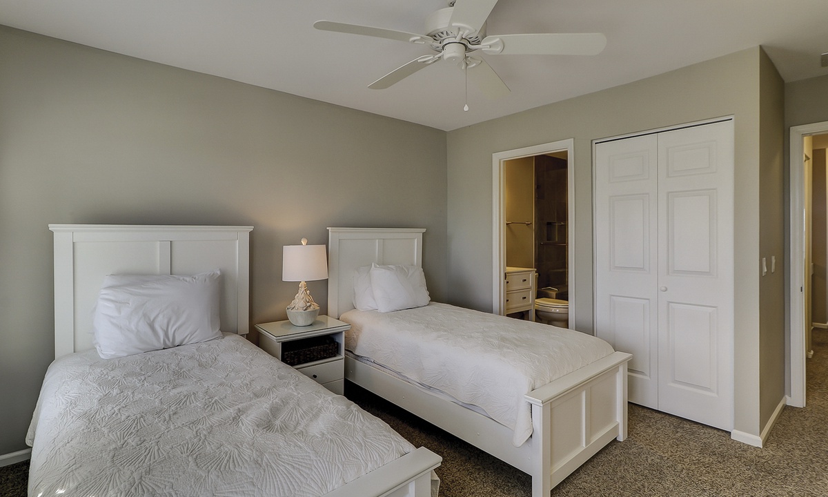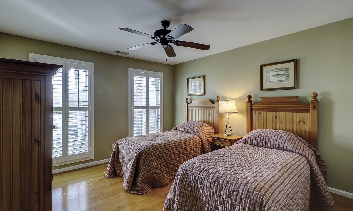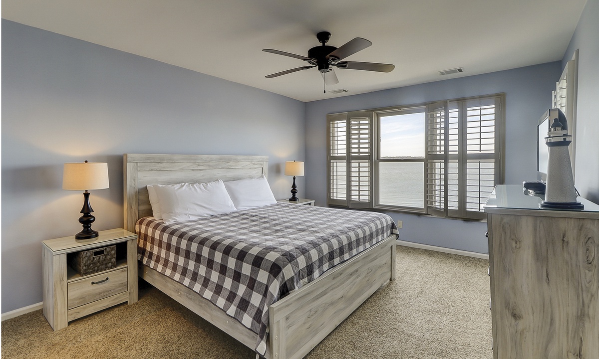 Two of the four bedrooms are located on the first floor. The primary suite is located on the first floor with a king bed, private en suite with double vanity, walk-in shower and a soaking tub. There is access to the screened porch from the primary bedroom. The second bedroom has two twin beds and access to a hall bathroom. On the second floor are the additional two bedrooms. The third bedroom has a king bed, water views, a private bath with double vanities, a walk-in shower and a soaking tub. The fourth bedroom has two twin beds and a private bath with a tub/shower combination. The laundry room with a washer and dryer is located on the second floor.