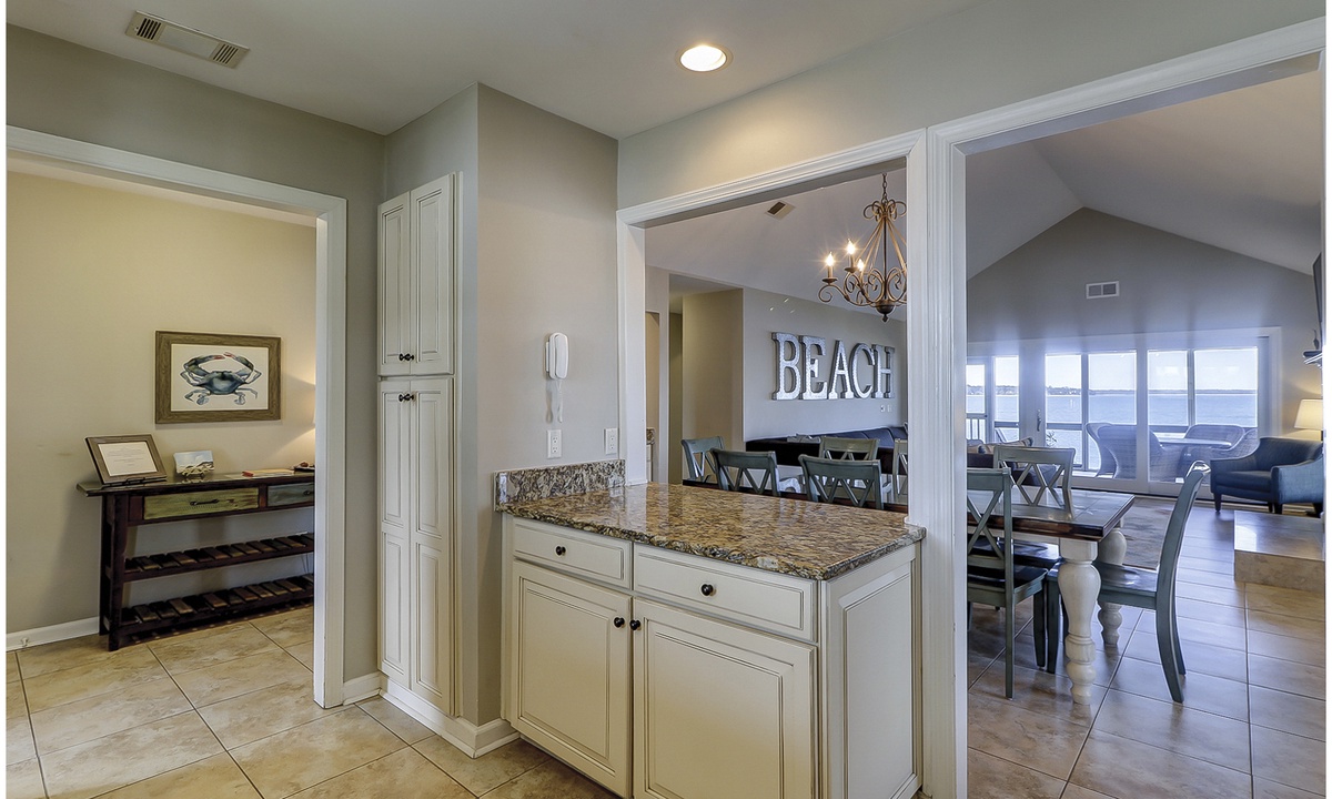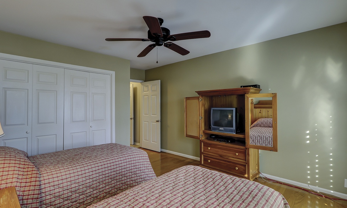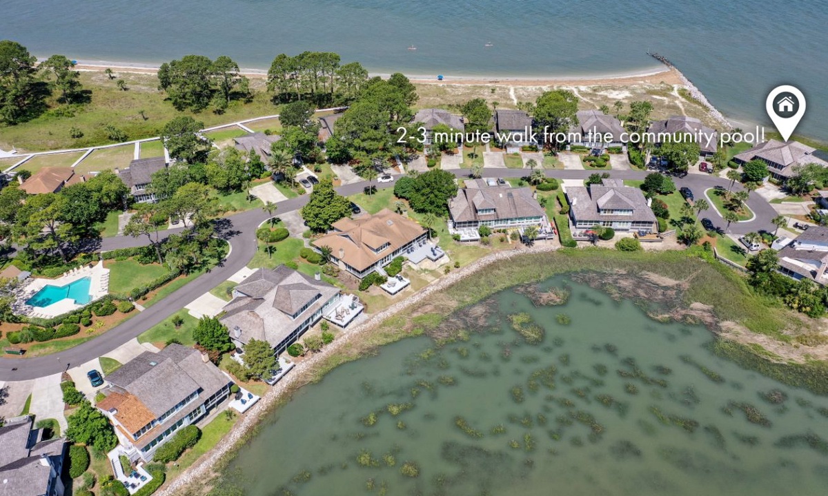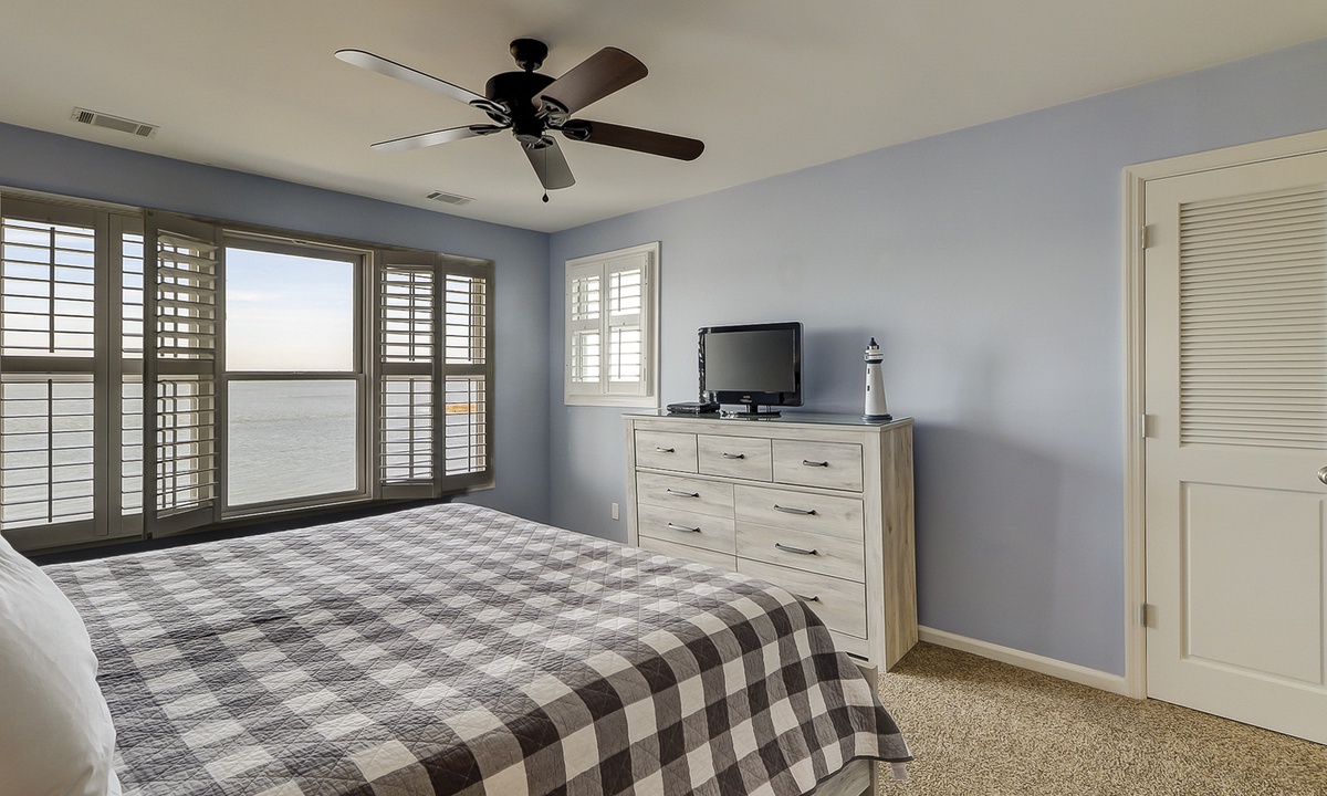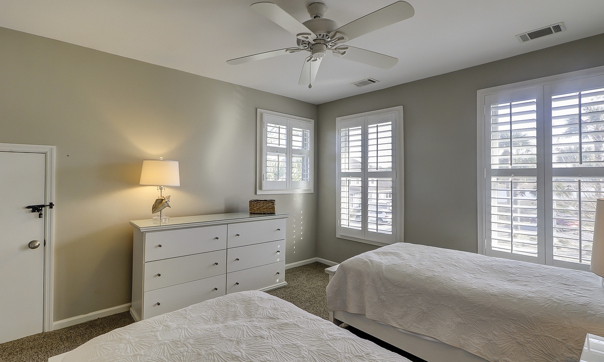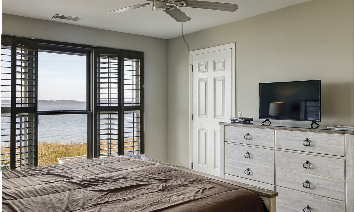 Two of the four bedrooms are located on the first floor. The primary suite is located on the first floor with a king bed, private en suite with double vanity, walk-in shower and a soaking tub. There is access to the screened porch from the primary bedroom. The second bedroom has two twin beds and access to a hall bathroom. On the second floor are the additional two bedrooms. The third bedroom has a king bed, water views, a private bath with double vanities, a walk-in shower and a soaking tub. The fourth bedroom has two twin beds and a private bath with a tub/shower combination. The laundry room with a washer and dryer is located on the second floor.
