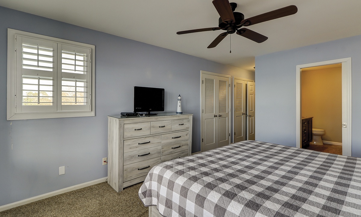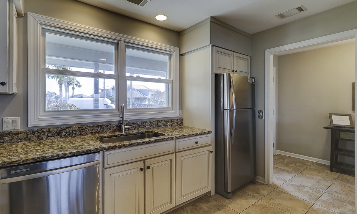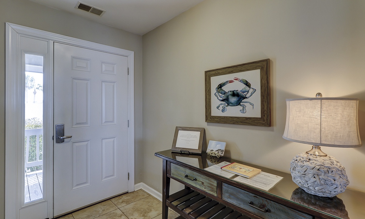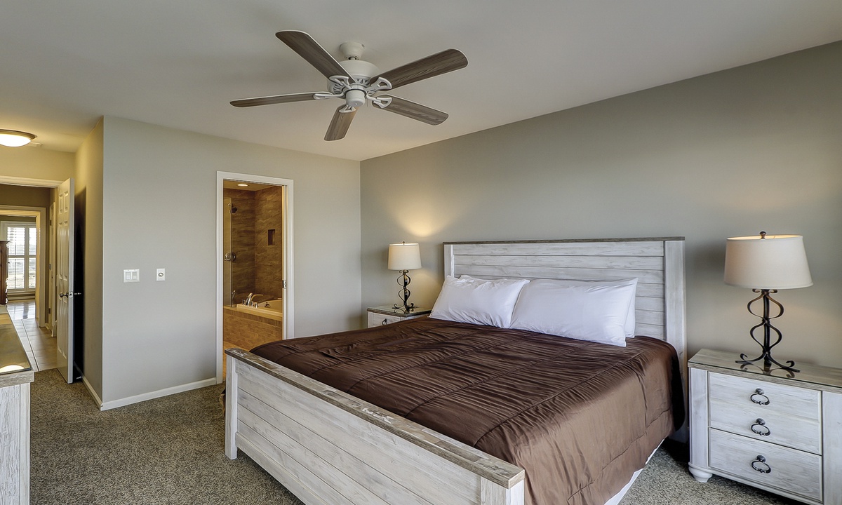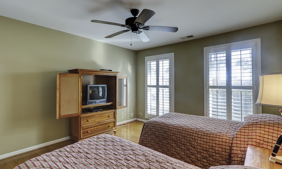 Two of the four bedrooms are located on the first floor. The primary suite is located on the first floor with a king bed, private en suite with double vanity, walk-in shower and a soaking tub. There is access to the screened porch from the primary bedroom. The second bedroom has two twin beds and access to a hall bathroom. On the second floor are the additional two bedrooms. The third bedroom has a king bed, water views, a private bath with double vanities, a walk-in shower and a soaking tub. The fourth bedroom has two twin beds and a private bath with a tub/shower combination. The laundry room with a washer and dryer is located on the second floor.