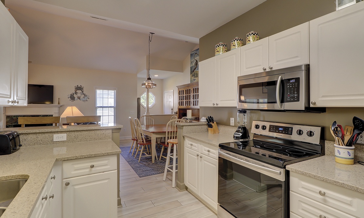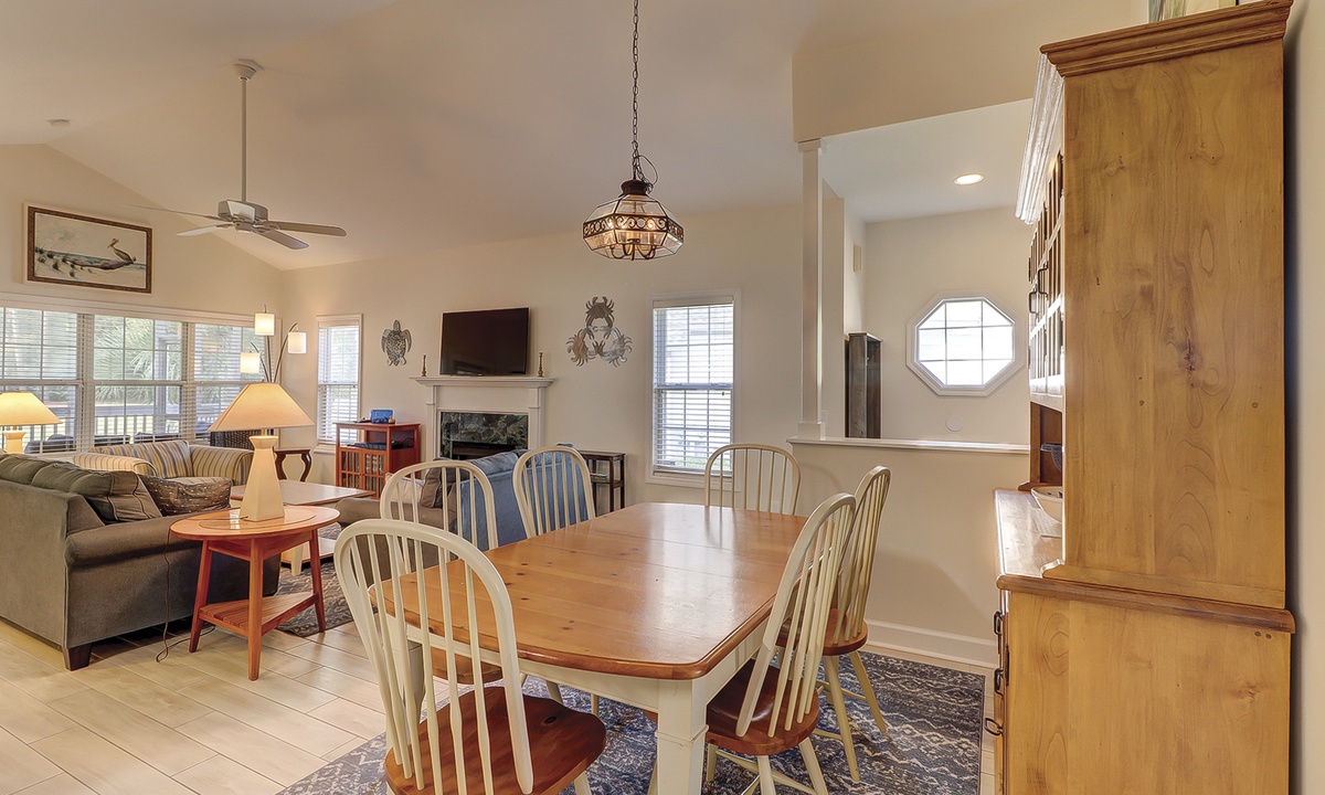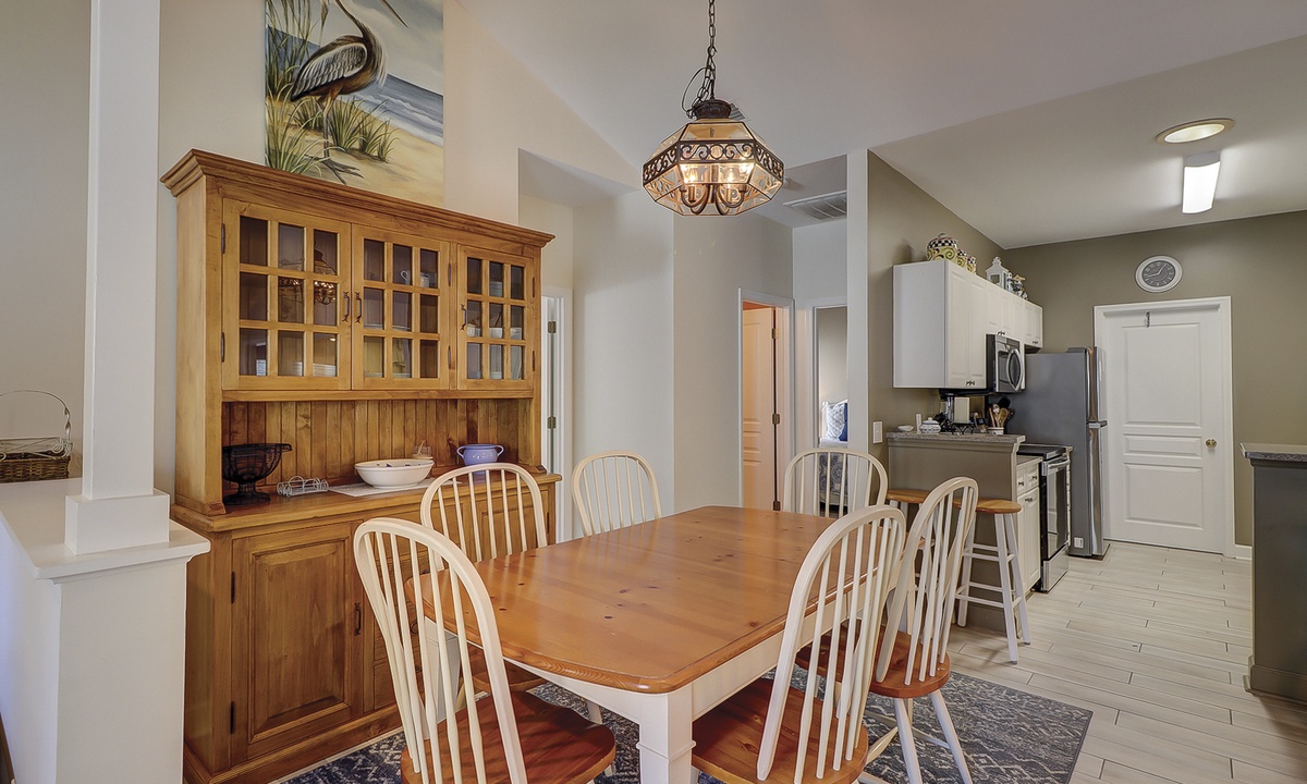 The dining area seats 6 comfortably, and the kitchen has stainless appliances and plenty of cabinet space.